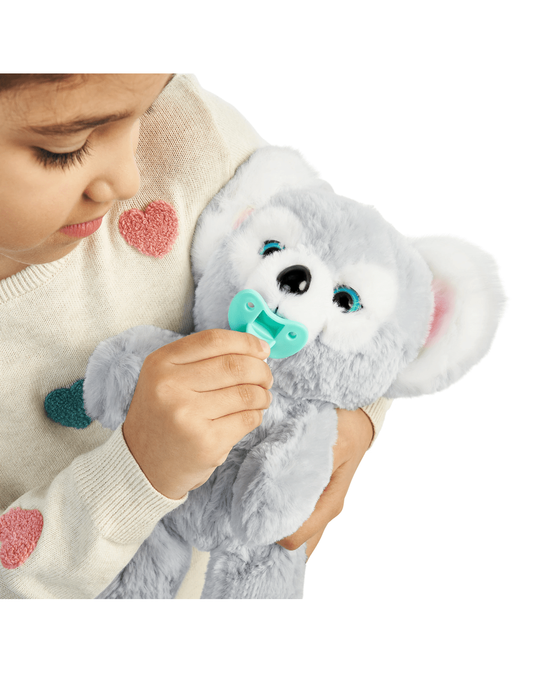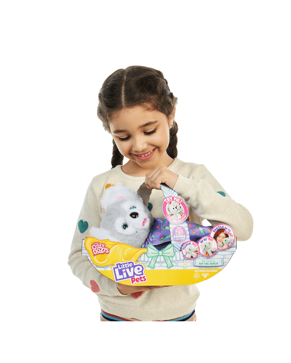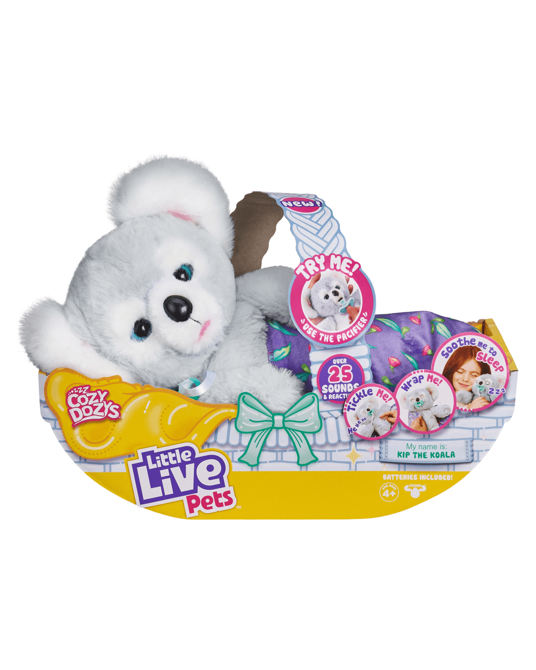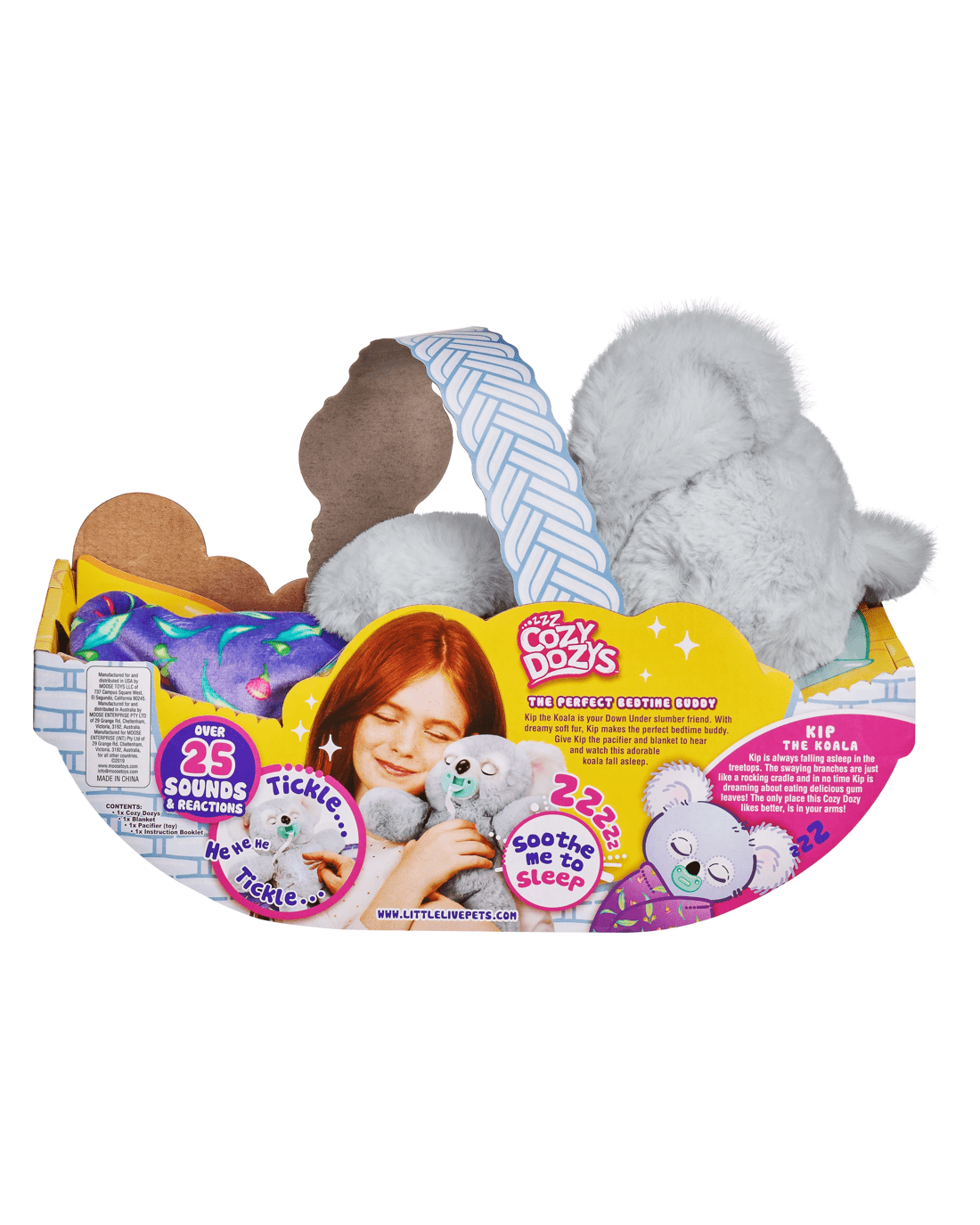 Kip the Koala is your 'Down Under' slumber friend. With dreamy soft fur, he’s your perfect bedtime buddy. Soothe him to sleep by wrapping him up in his soft, warm blanket. Place the pacifier in his mouth, he will start sucking and close his eyes and you will hear him fall gently to sleep! Remove his pacifier and he will open his eyes and make cute sounds! Kip loves cuddles! Pet his head and he will blink his eyes and make happy sounds. He also loves to be tickled! Scratch Kip’s belly and make him giggle. The more times you tickle him, the longer he’ll laugh! Kip the Koala has over 25 different sounds and reactions! He comes with his own pacifier and adorable snuggly wrap blanket.