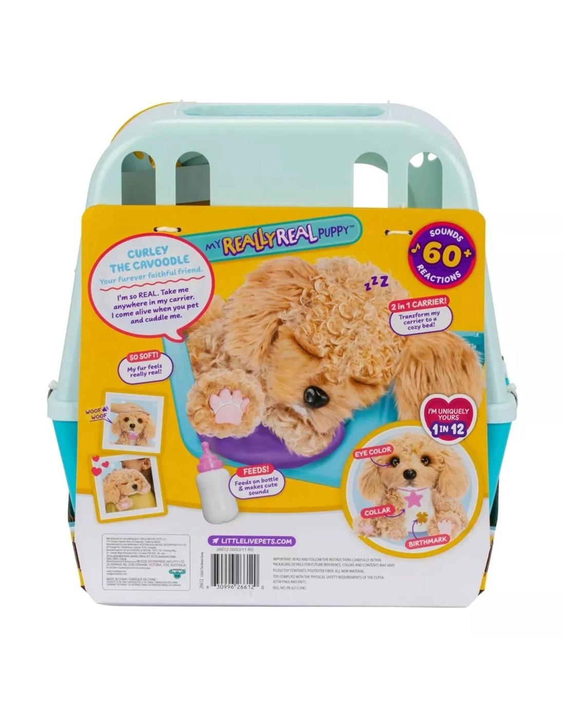 Little Live Pets My Really Real Puppy - Curley The Cavoodle is the realest puppy you've ever seen! Curley looks and feels so real with the softest fur, sweetest blinking eyes, and reacts to your touch with over 60 sounds and reactions.My Really Real Puppy will be your furever faithful friend - they are so realistic with fur that is soft to the touch, blinking eyes and weighted paws that make this interactive puppy feel oh so real! Get to know your puppy by gently pressing his nose, and he will sniff or lick your hand. Pet Curley on his head or back and he will make happy sounds and blink his eyes. The more you pet him, the more excited he will get! Curley comes with a puppy bottle and loves to be fed - gently press the puppy bottle to his mouth and listen as he closes his eyes and makes cute feeding noises.Each Really Real Puppy is so unique, there are 12 different variations, with different colored eyes, collars, and a secret birthmark! Feed Curley with his bottle, and lay him down on his side for a nap - he will sense his position and fall asleep.My Really Real Puppy comes with an adorable puppy carrier with a handle so you can place your puppy inside and carry them with you anywhere you go!Curley loves to sleep in his doggy bed, simply remove the top of the puppy carrier to transform it into a doggy bed. Once your child and Really Real Puppy are acquainted, be sure to fill in your puppy's adoption certificate, and write your puppy's name on its very own name tag.Experience the most realistic and adorable interactive puppy play with Little Live Pets My Really Real Puppy. Ages 4 +