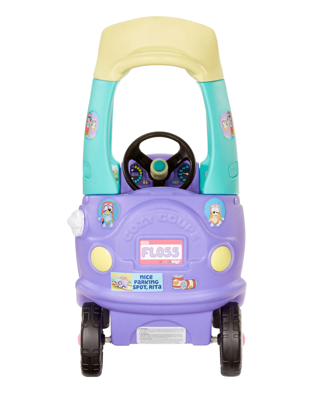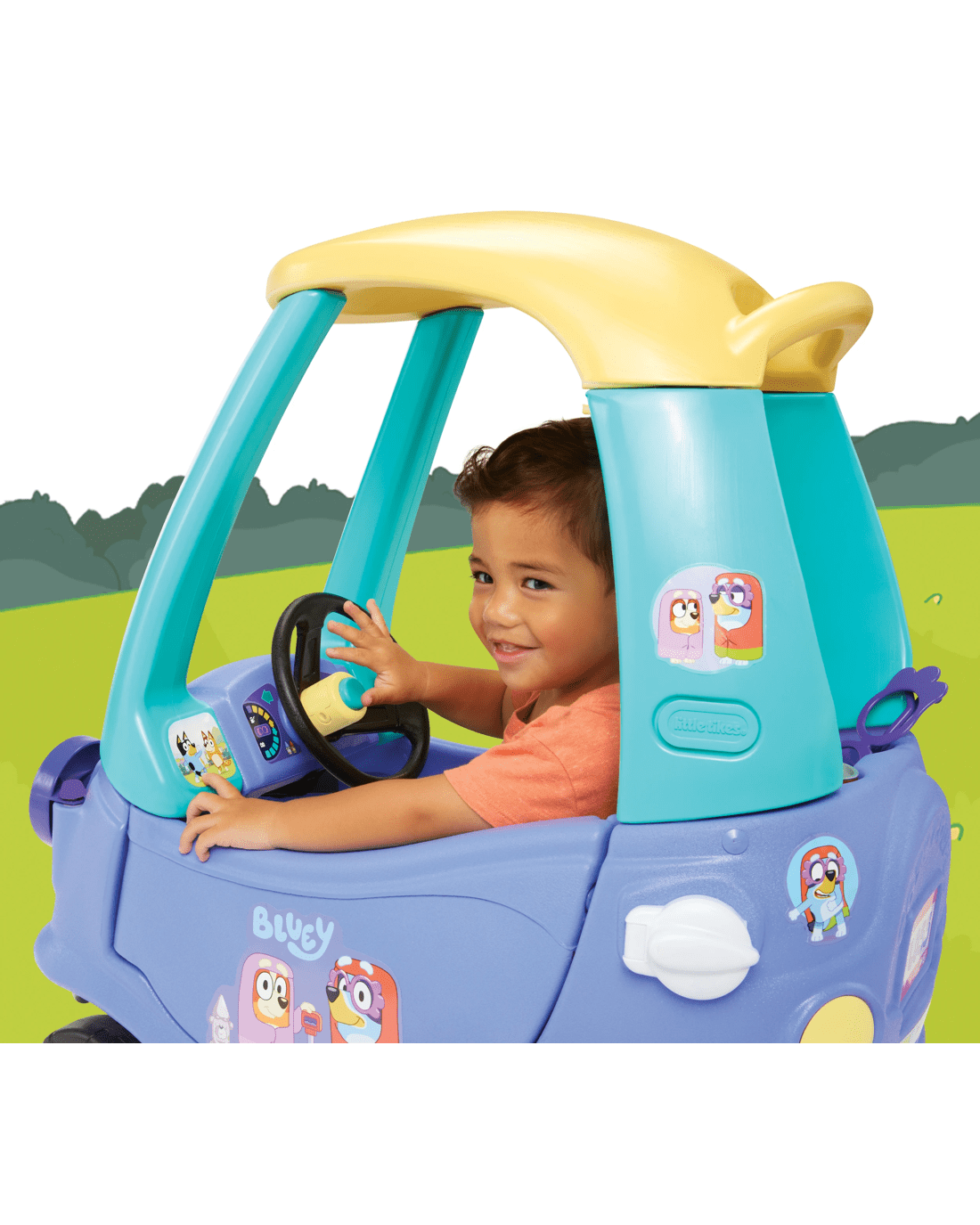 • BLUEY RIDE-ON- With show sound effects and cute decals, this cozy coupe brings all the Bluey fun! Racing in this buggy encourages fun, active play and the development of large motor skills in young children.