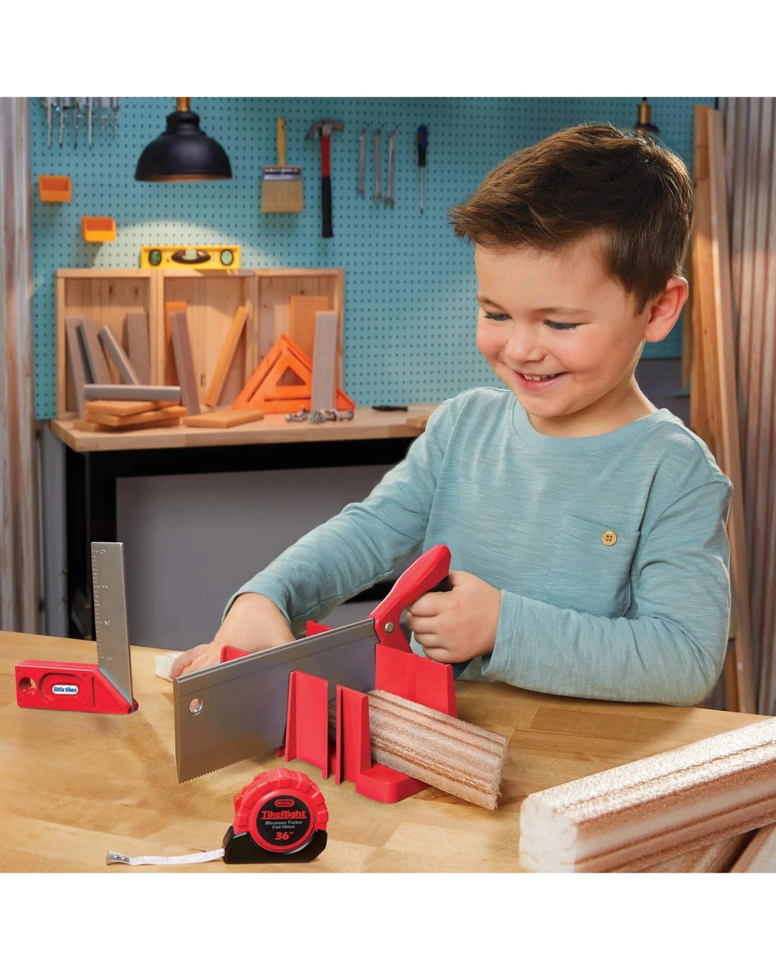 - 5 REALISTIC ACCESSORIES. This construction role play set includes miter saw, miter box, carpenter's square, measuring tape, foam wood boards in various shapes, and blueprint instructions.