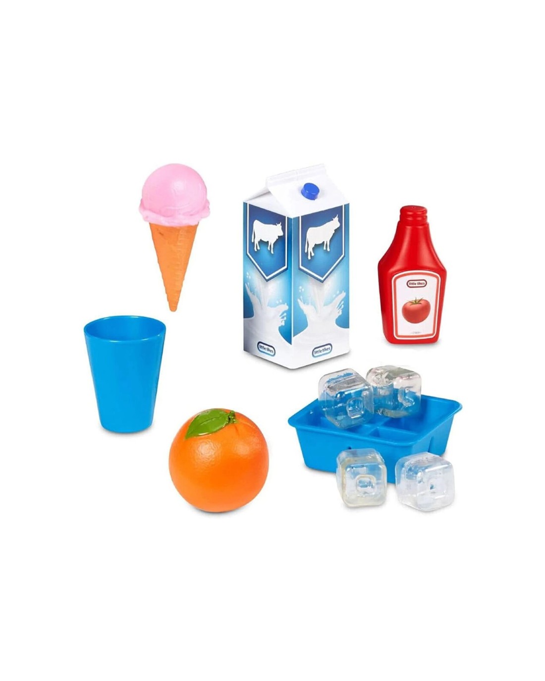 The fridge includes a working ice dispenser that makes crushed ice and water dispensing sounds, dual French doors with an interior light that turns on and off, and a separate freezer drawer that beeps when left open. It also offers space for kids to display grocery lists, artwork, or photos using the clips on the door. The set comes with 11 accessories, including an ice cube tray, ice cream cone, milk carton, ketchup bottle, orange, two clips, and four ice cubes, all of which can be stored inside the fridge for easy cleanup.