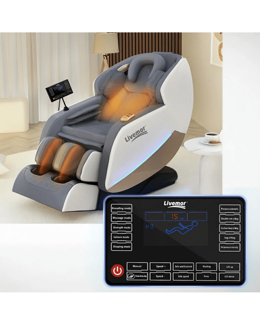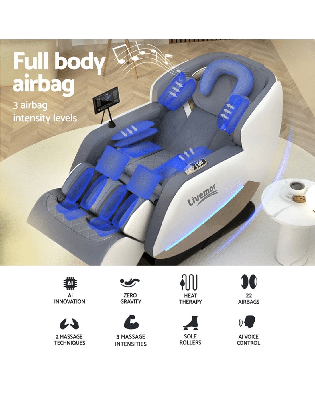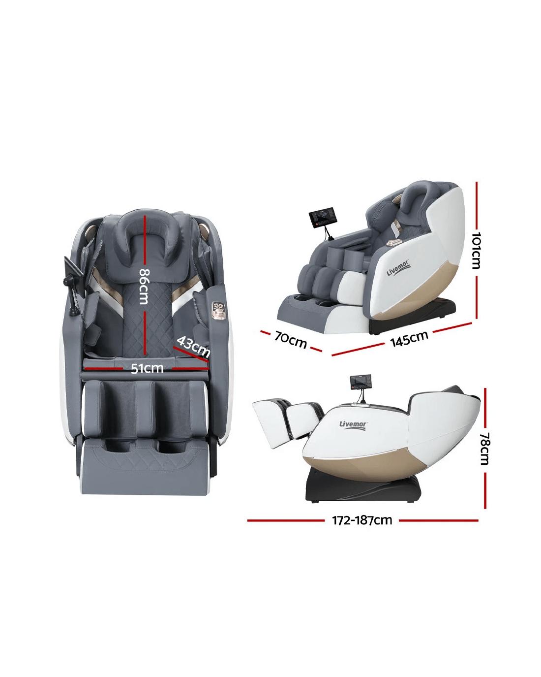 Using the latest smart massage technology, the Livemor Beryl Electric Massage Chair is designed to deliver an out-of-this-world massage experience. A deeply relaxing experience that rivals the professionals, all from the comfort of home. The zero-gravity automatic recline is designed to relieve spine pressure and give you a sense of relaxing weightlessness. Nine unique massage spots target key areas of the neck, back and legs for a consistent massage using two professional techniques. Using 5 signature full-body automatic programs, 3 levels of strength in the feet rollers and airbags, and various speed adjustments, you can tailor the massage to your exact specifications. Not only that, but you can enjoy ultimate relaxation with a heated massage function, AI voice control, a USB charger for your devices and built-in Bluetooth speakers to listen to your favourite audiobooks and music. Why pay for the professionals when you can have the luxury of a premium massage in your living room? Get your Livemor Beryl Electric Massage Chair today.