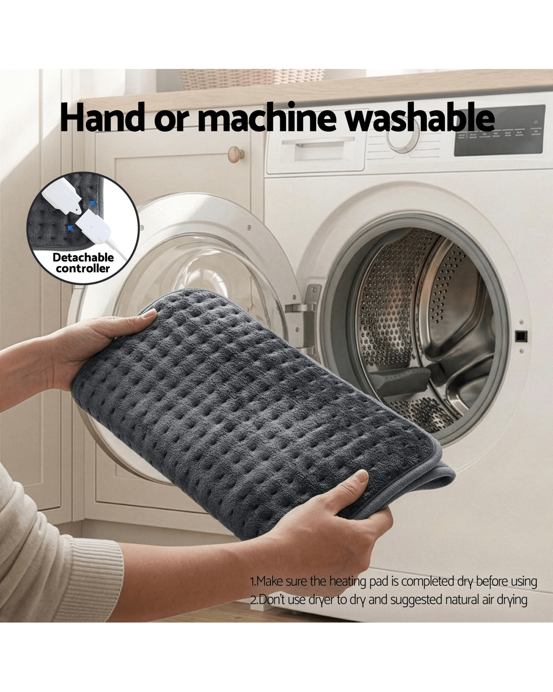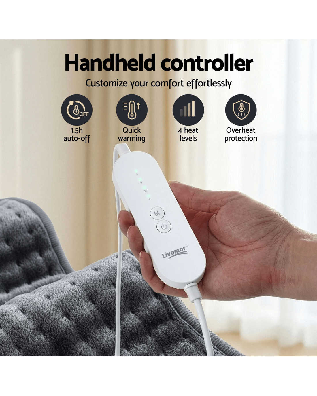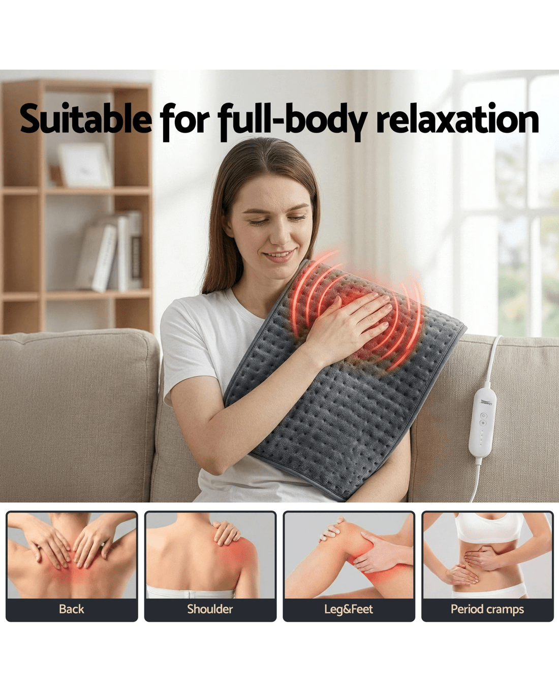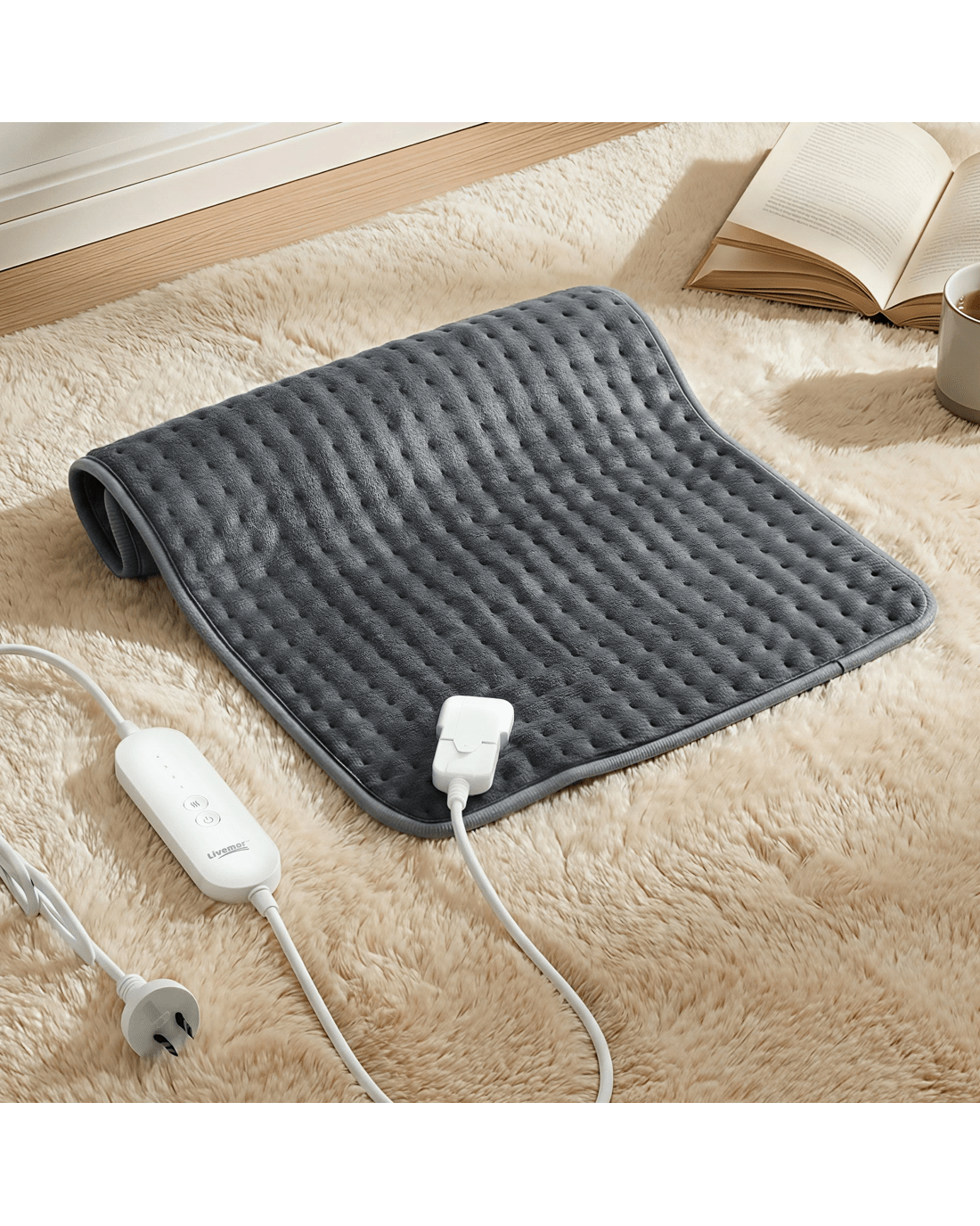 Elevate your relaxation routine with our Livemor Electric Heat Mat. Designed for those who appreciate cozy warmth, this versatile pad is the perfect companion for chilly evenings or simply unwinding after a long day. Whether you're lounging on the sofa or resting in bed, our 60x39cm pad offers ample coverage. Use it to warm your back, drape it over your shoulders, or snuggle up with it on your lap. With 4 adjustable settings, you can go from a gentle simmer to a deep, cozy warmth at the touch of a button. The pad is programmed with a 90-minute automatic switch-off and overheat protection, ensuring it stays within a comfortable range and saves energy while you rest. Made from high-quality, skin-friendly microfiber, this pad isn't just functional—it's incredibly soft. It's designed to be lightweight and flexible, contouring to your body for maximum snugness. Keep your heat pad looking and feeling like new. The detachable controller allows for easy machine washing, ensuring your comfort is always hygienic.