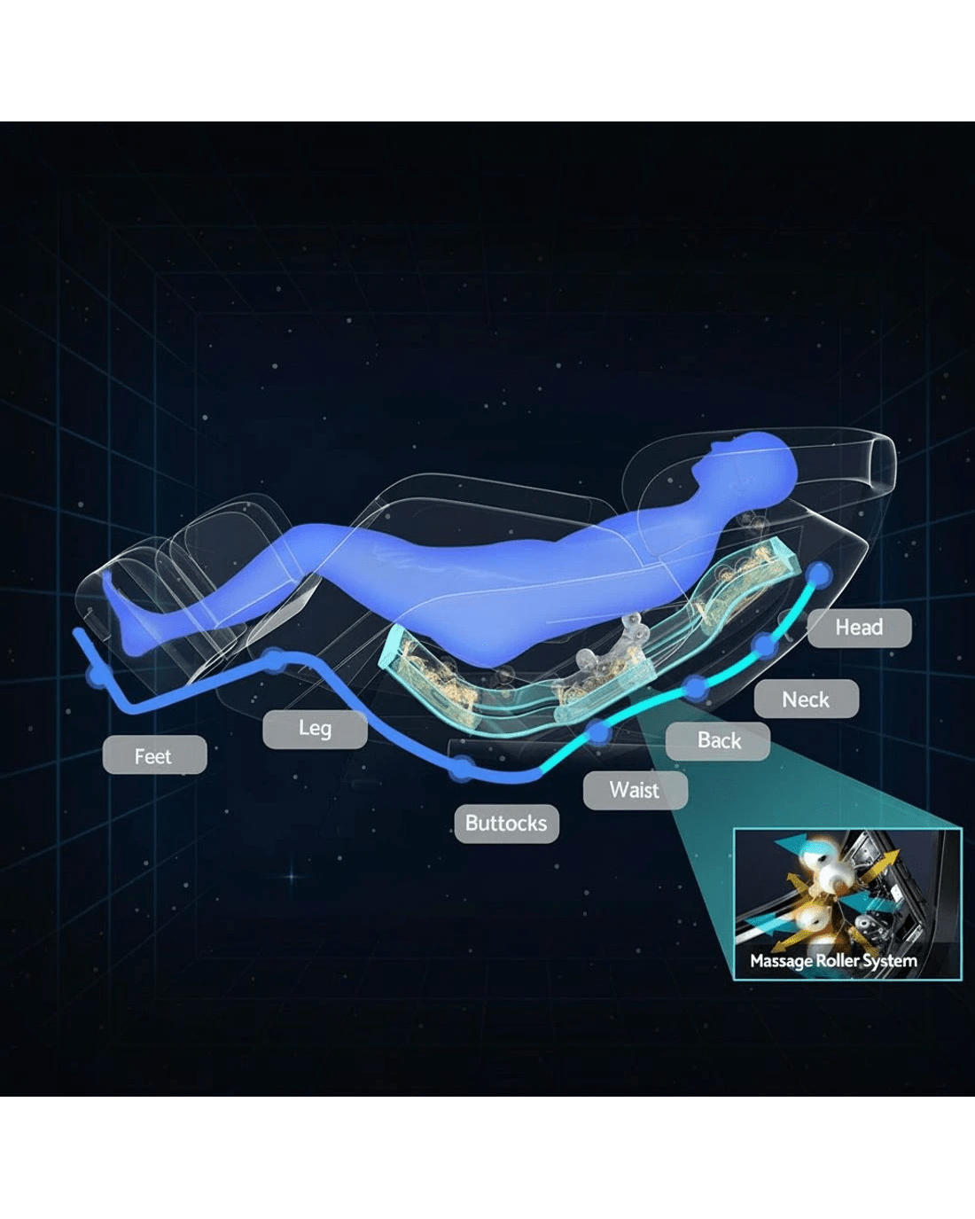 9 massage spots: head, neck, shoulder, arm, back, waist, buttock, calf, feet