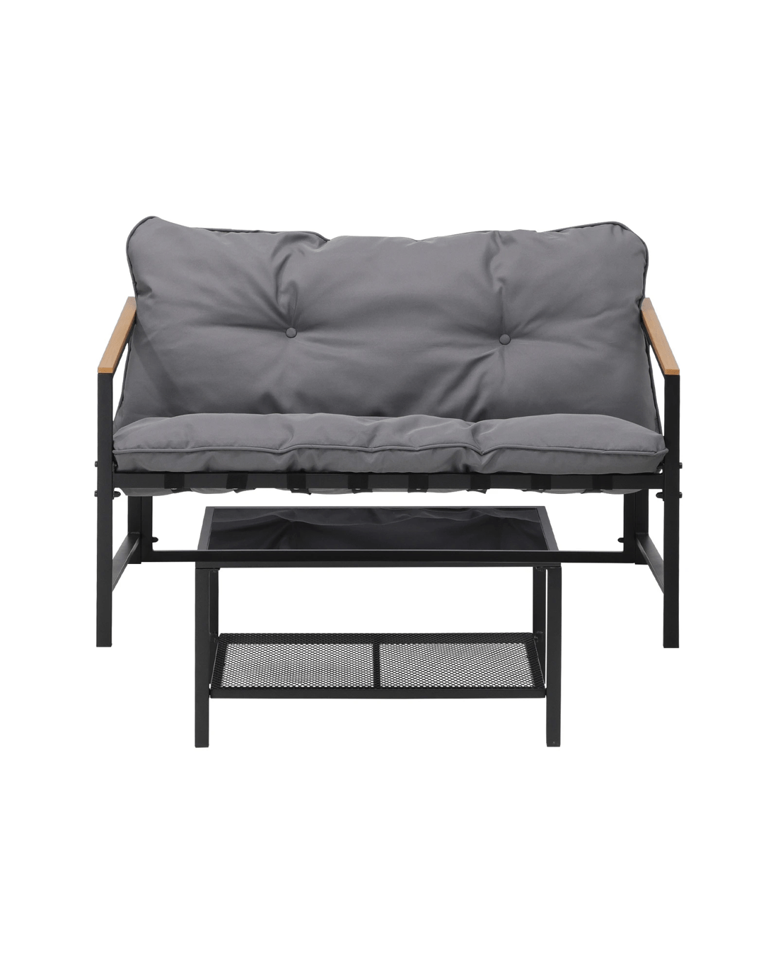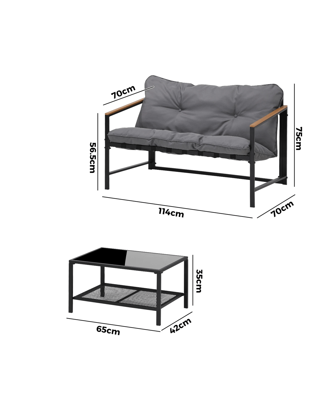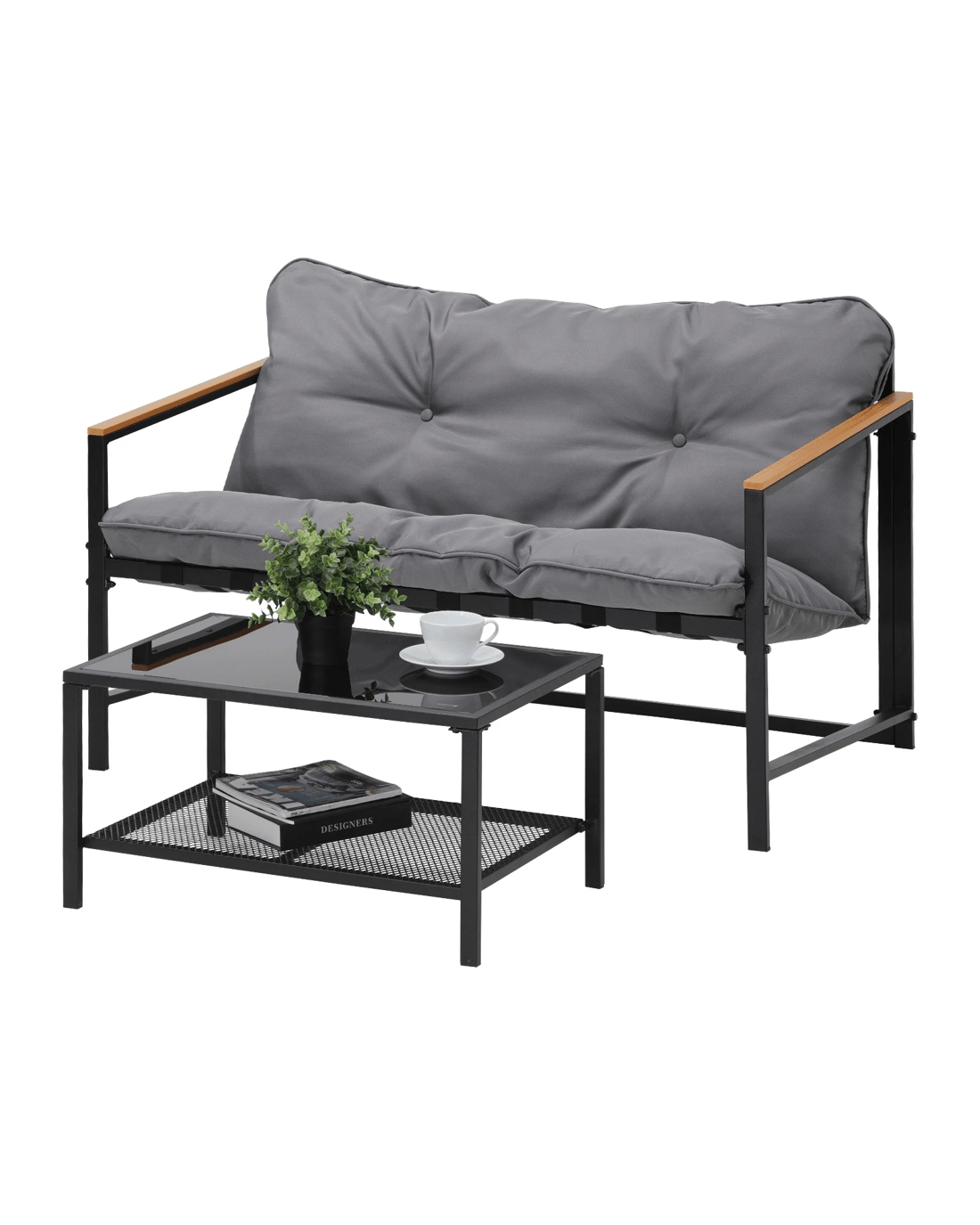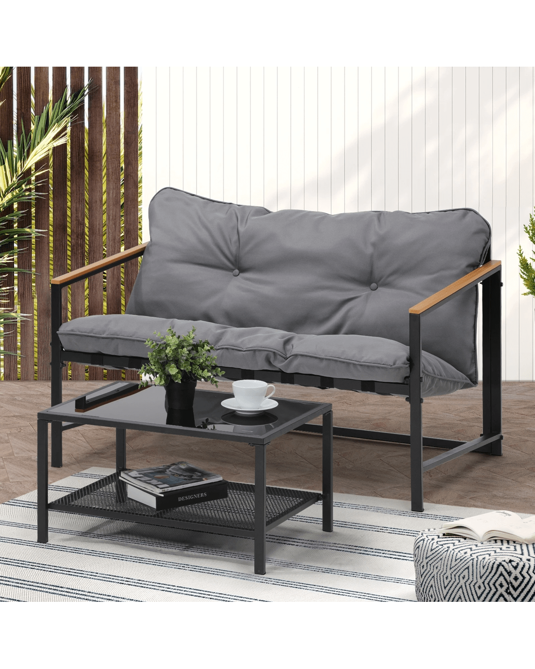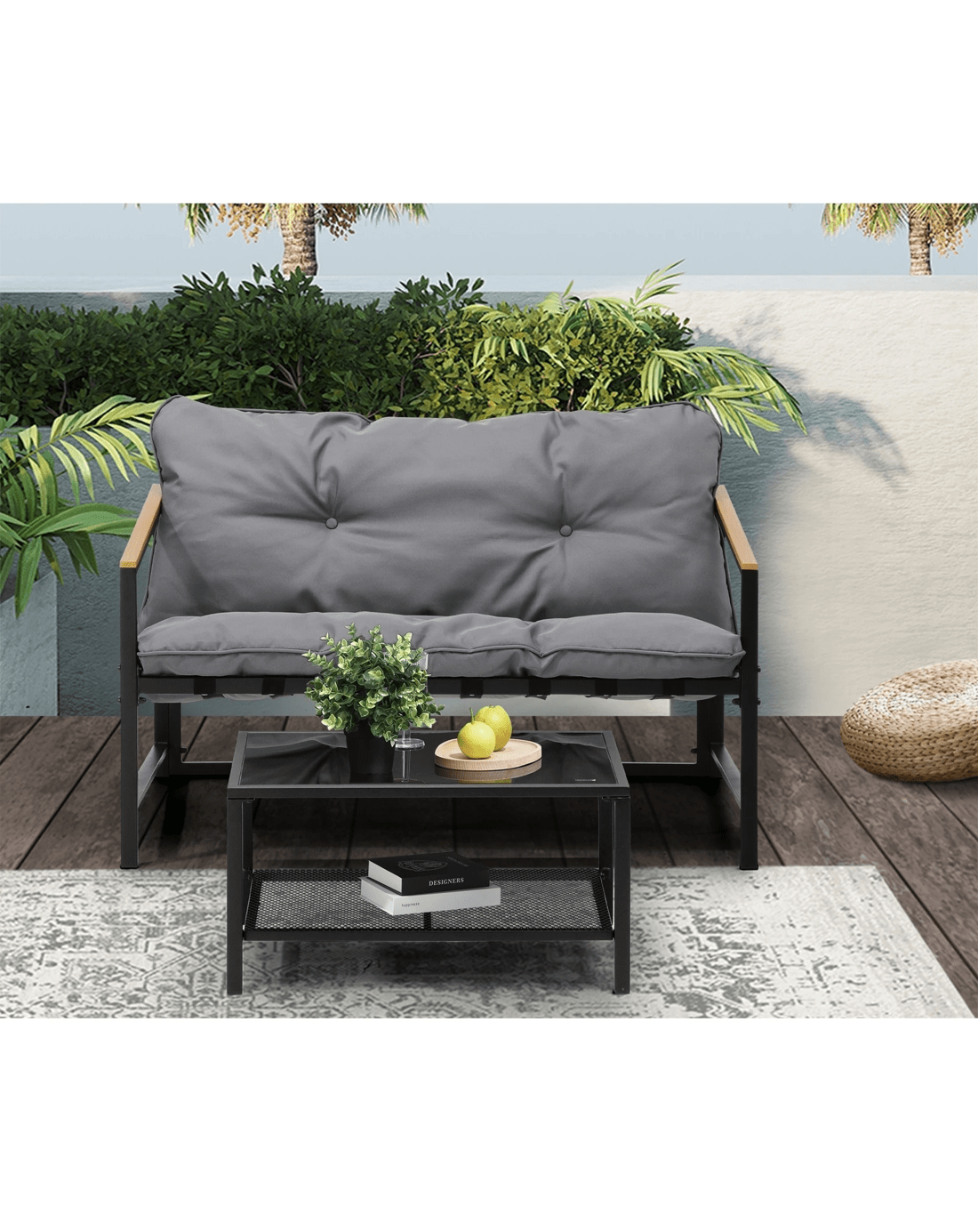Living life to the fullest. Chilling out under the sun, moon and stars. Alfresco dining. Enjoying cherished tete-a-tete and wonderful conversation. Celebrating milestones and successes and everything else in between. Simply pursuing and liking life that's meant to be. And the Livsip Outdoor Patio 2-pc Lounge Set is ready to be there at home with you. Stylish. Contemporary. Beautiful. It has all the makings of chic outdoor furniture that resonate with your discerning lifestyle. Sit back and feel the comfort of the well-padded cushioned seats and relax your arms on the smooth composite wood/plastic armrests. Have your lattes and savour that delicious food platter served on the matching coffee table. Not enough space on the glass table top? There's more real estate under the coffee table with a handy shelf for more delectable goodies and drinks to while the moments away. But how does it stand up to the harsh and sometimes fickle Australian weather? No worries mate as it's all weather-resistant with a powder-coated metal seat frame to add strength and durability for robust use. Not least, this twosome setup also looks fabulous with any indoor eclectic styling ideas that you may have. Convinced that this delightful outdoor package is for you? Click on the Buy option and soon you'll be having the best of company with the Livsip Outdoor Patio 2-pc Lounge Set in attendance.