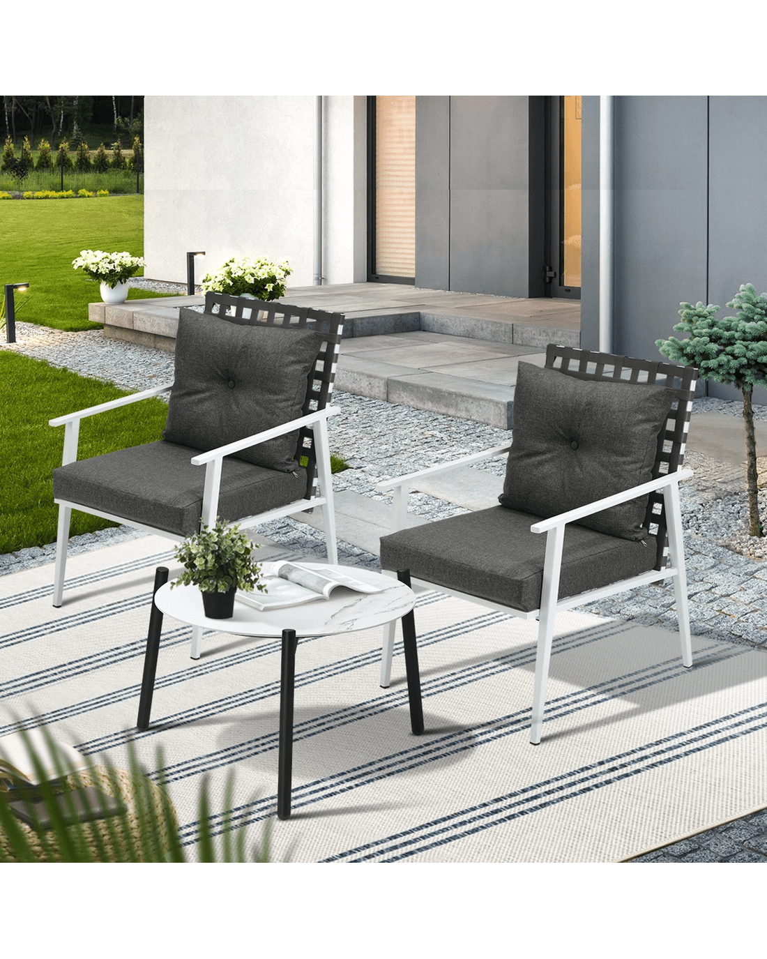 If you are looking for a classy and sophisticated outdoor set that adds a touch of marble-resque aesthetics to its setting, then this Livsip Outdoor Set is well within your radar of stylish furniture. None the ordinary and everything the exceptional.