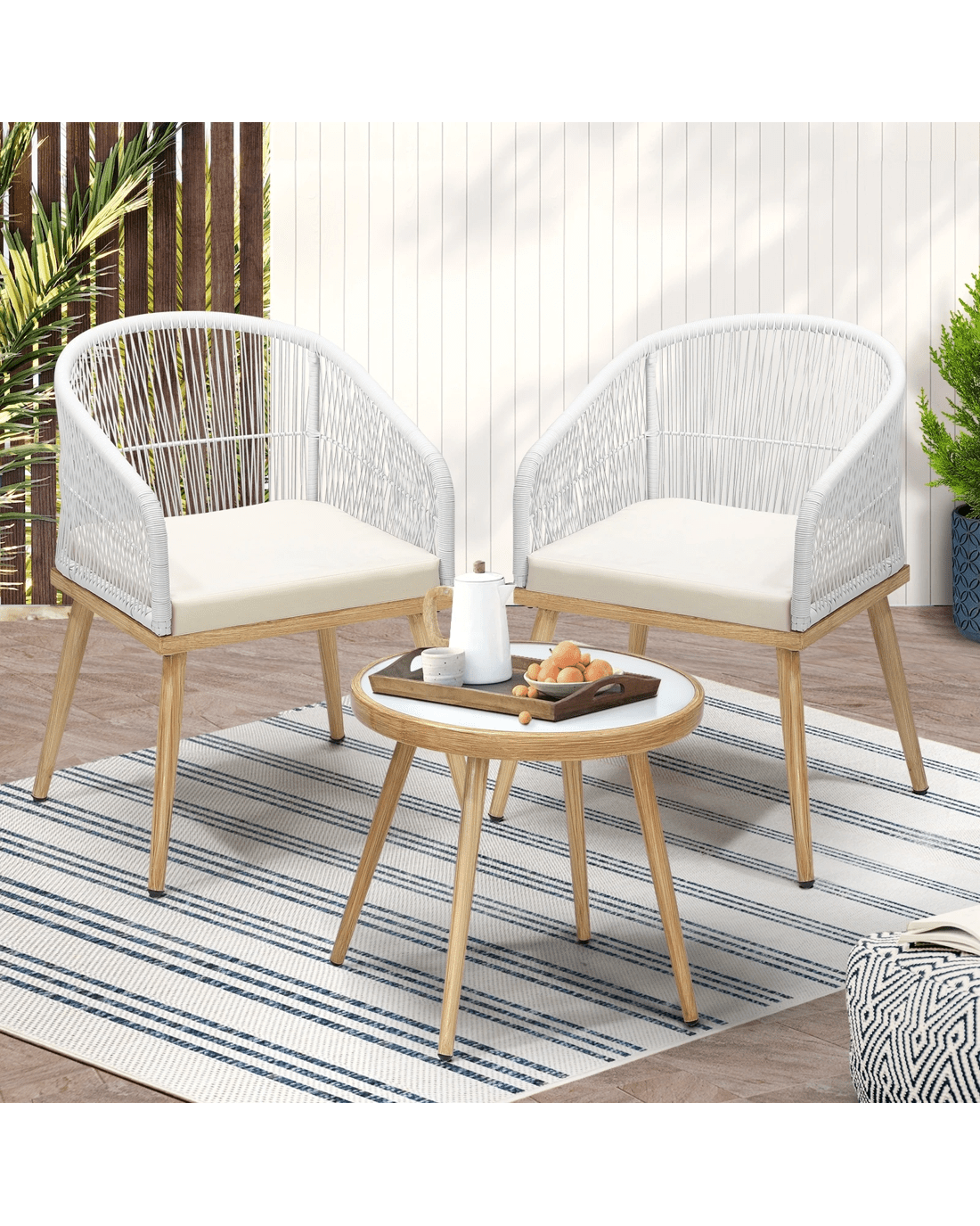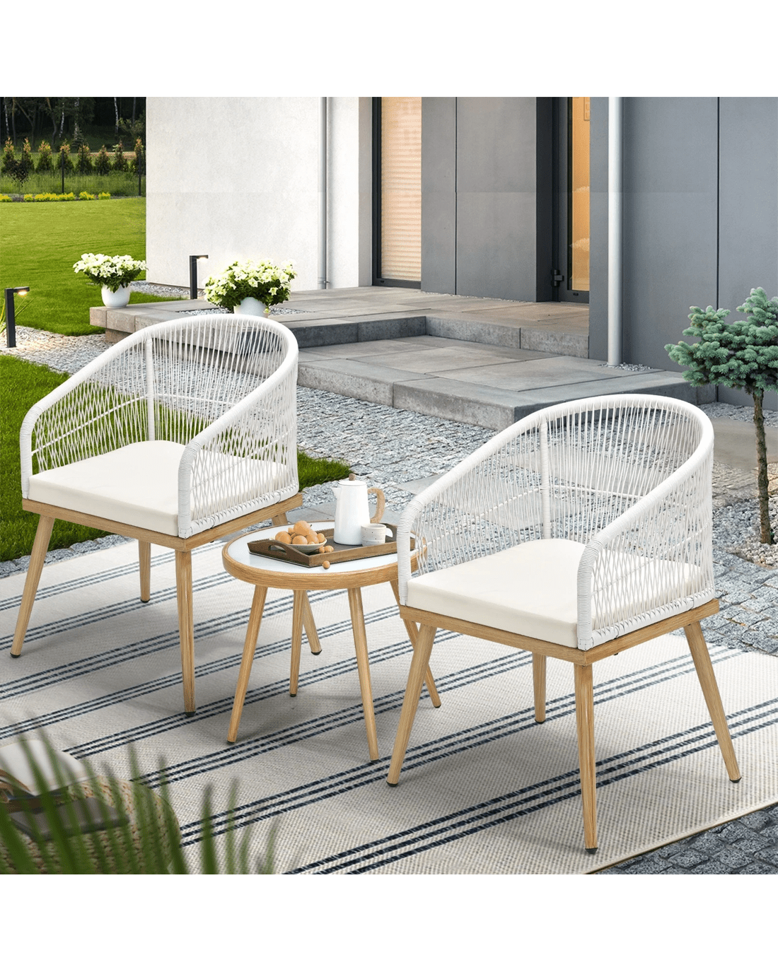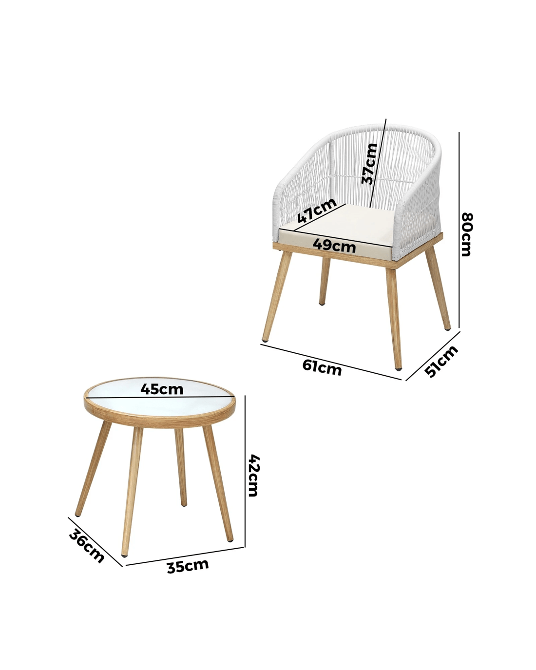 Designed with your comfort in mind, the outdoor armchair features a spacious seat and a padded seat cushion along with rope detailing around the chair frame. The side table included in the set is a practical and stylish addition. It provides a convenient surface for placing drinks, snacks, books, or other essentials within arm隆炉s reach. The table is crafted to match the design of the armchair, creating a cohesive and visually appealing ensemble for your outdoor space.