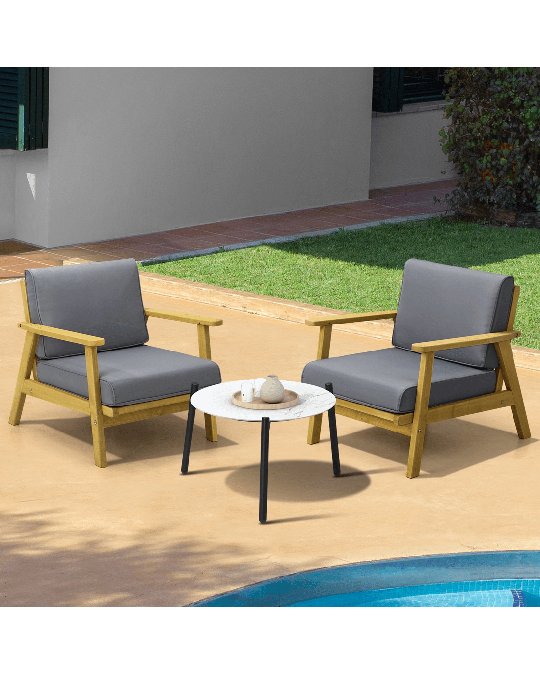 If you are looking for a classy and sophisticated outdoor set that adds a touch of marble-resque aesthetics to its setting, then this Livsip Outdoor Set is well within your radar of stylish furniture. None the ordinary and everything the exceptional.