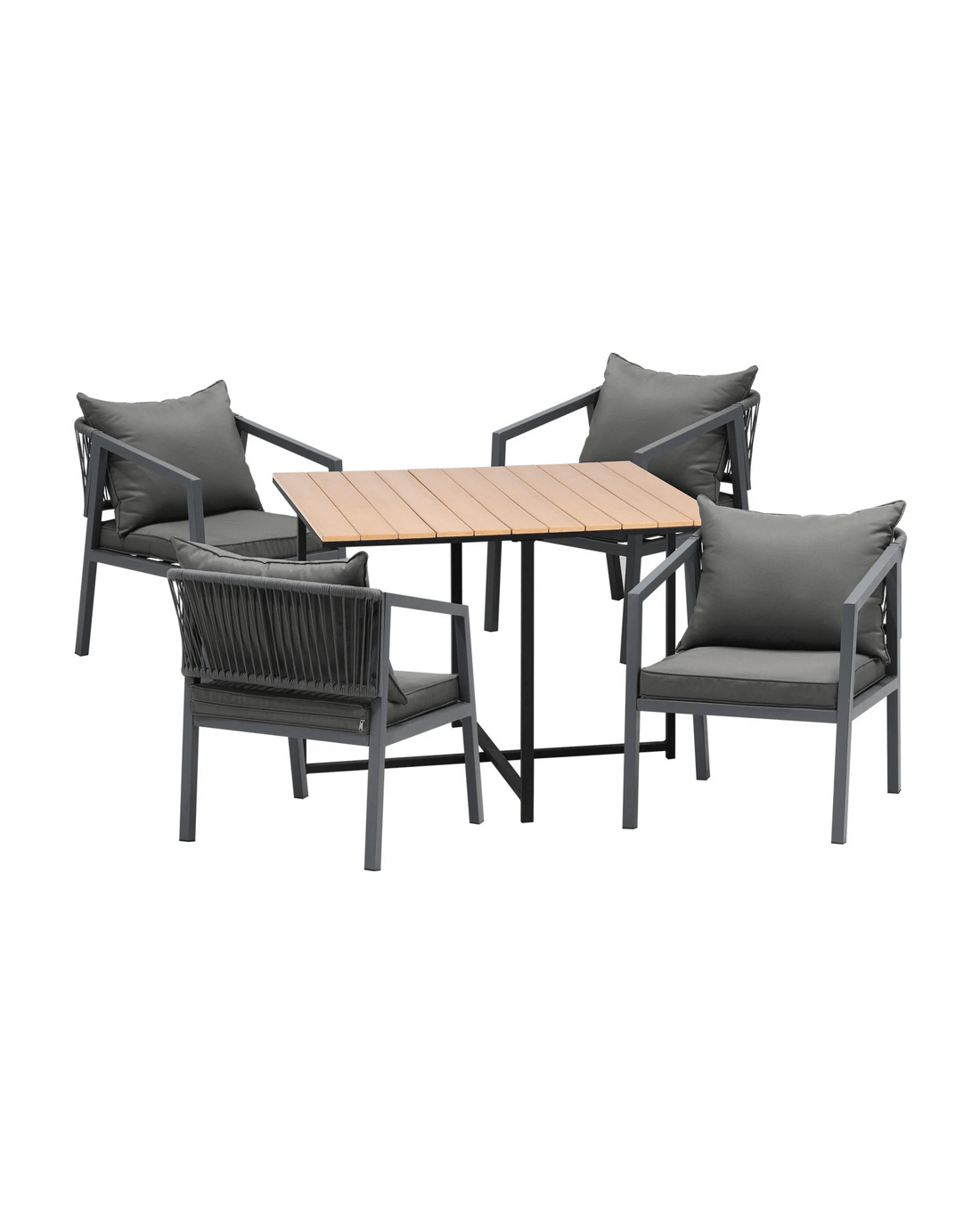But that is not all our innovative set also includes chairs that seamlessly tuck partially under the table, offering a space-saving solution that is both practical and visually appealing. The chairs are expertly designed to provide optimal comfort, with comfort contours and supportive cushions that encourage hours of relaxed dining. When not in use, simply slide them neatly beneath the table, instantly transforming your outdoor space into a clutter-free oasis.