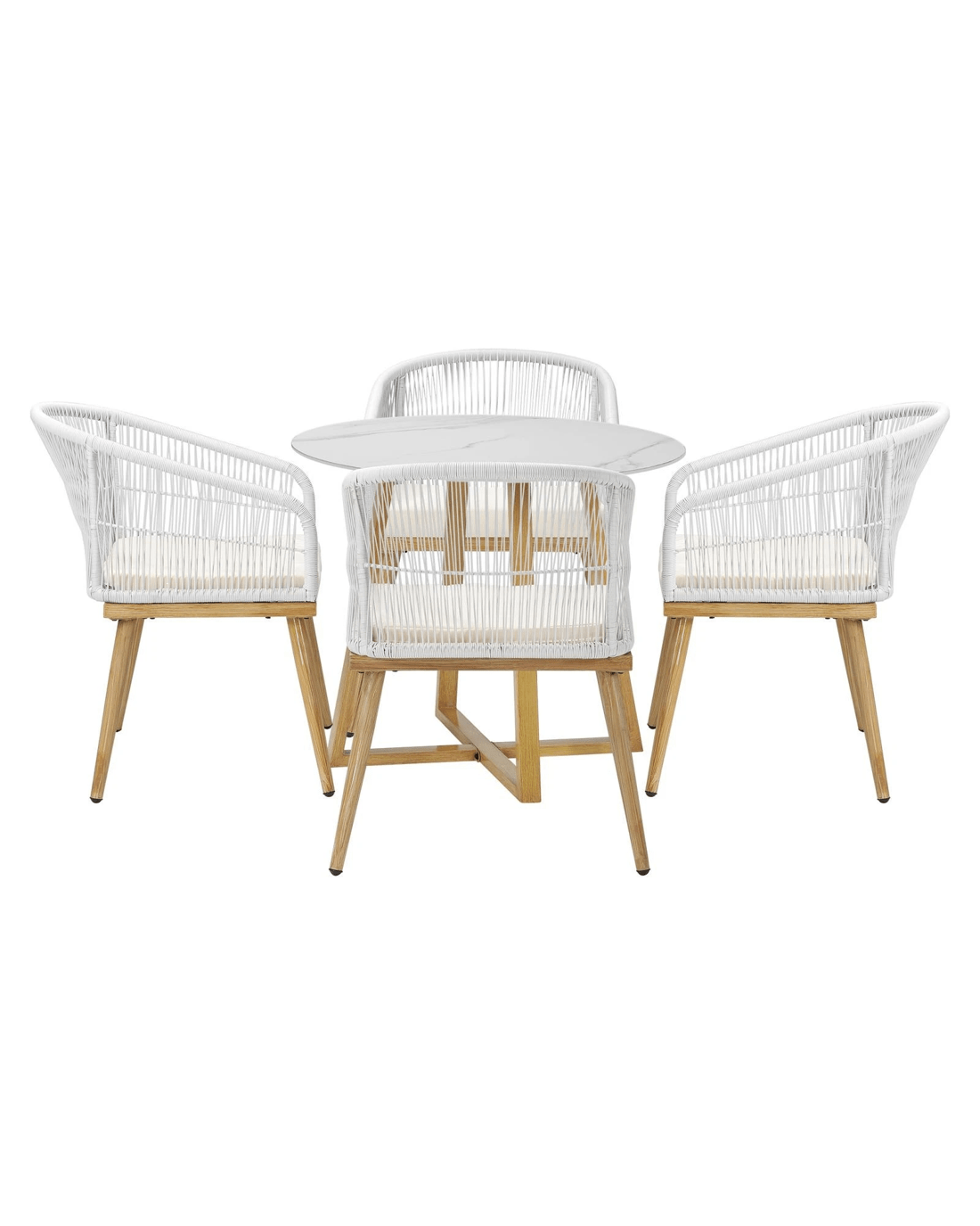 The set includes a nice round table and comfortable chairs, creating an inviting and functional outdoor dining area. The table provides ample room for serving meals, playing games, or simply enjoying drinks with friends and family. Its sturdy construction ensures stability, while the sintered stone tabletop surface makes cleaning a breeze.