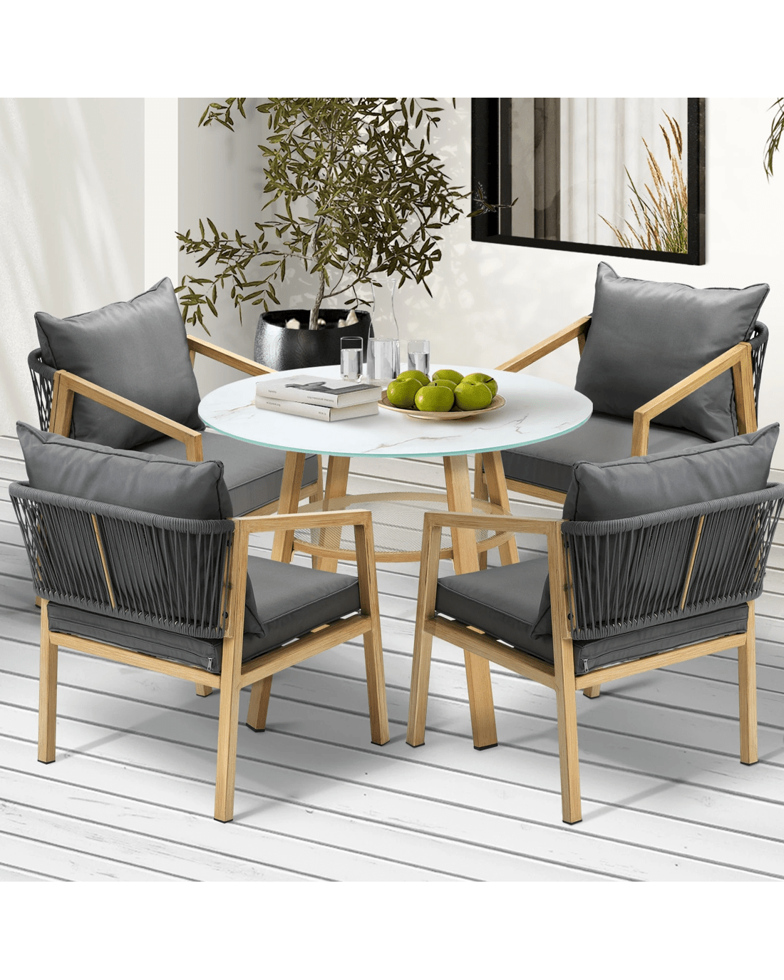 Living life to the fullest. Chilling out under the sun, moon and stars. Alfresco dining with friends, family or just with your precious me-time. Simply pursuing and enjoying life that is meant to be. And the Livsip Outdoor Dining Set is ready to be there at home with you. Stylish. Contemporary. Beautiful. For the dining table, a white ceramic tempered glass top with handy storage shelf beneath. And for the dining chairs, equally attractive pieces that go well with the table. The set has all the attributes of chic outdoor furniture that resonate with your discerning lifestyle. Have your lattes, your favourite brews and savour delectable cuisines and other gastronomical delights. Eat, drink and be merry! But how does the dining set stand up to the harsh and sometimes fickle Australian weather? No worries mate as it is all weather-resistant, chairs and table, with strength and durability for robust use. Not least, this dining setup also looks fabulous with any indoor eclectic styling ideas that you may have. Convinced that this delightful outdoor package is for you? Click on the Buy option and soon you will be feasting to your (and many others too) heart's content at the Livsip Outdoor Dining Set day and night, night and day, in every season.