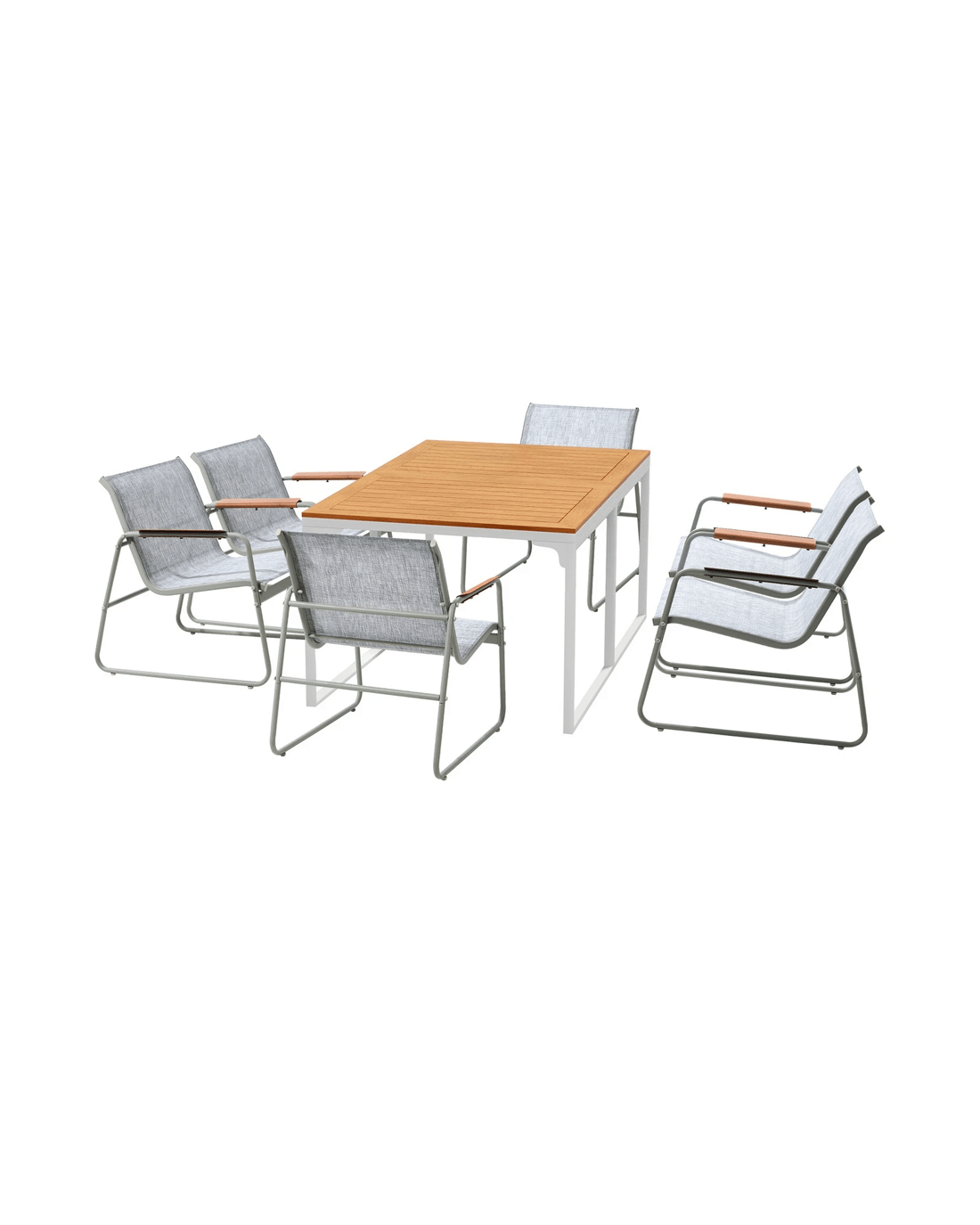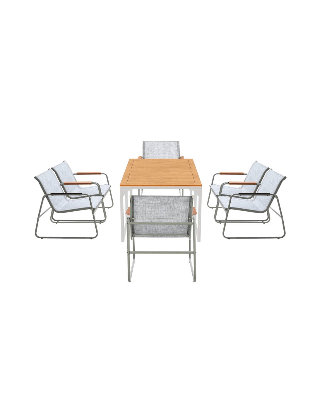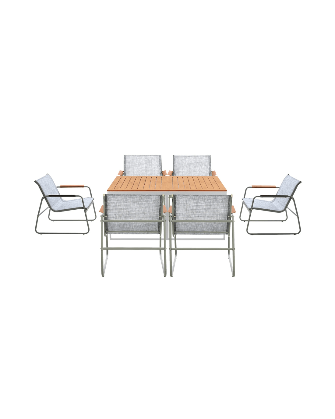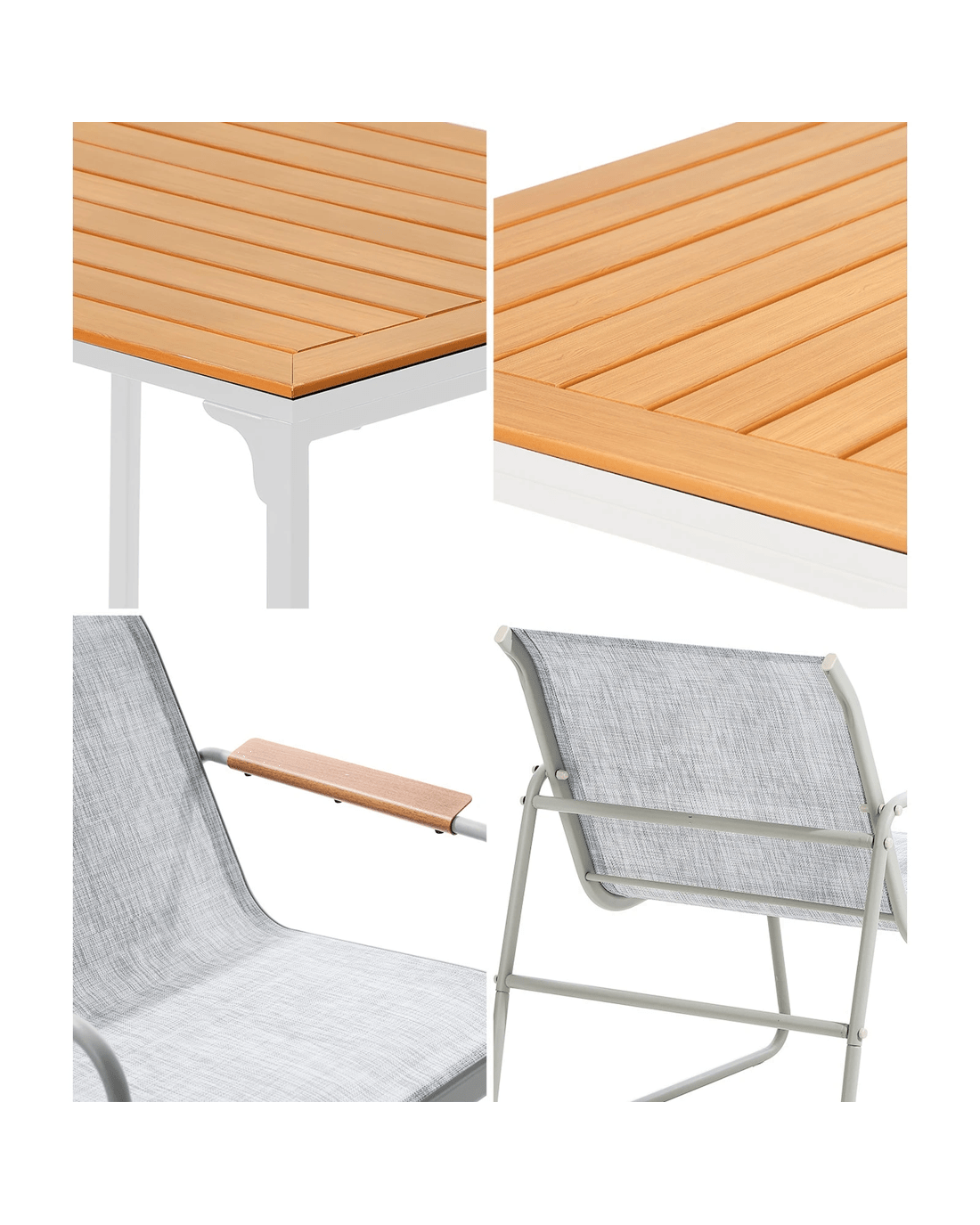 For the patio chair, the integrated seat and backrest with textilene fabric upholstery and wood-coloured armrest tops is matched with a sturdy steel frame for a chic casual look that is absolutely timeless. As a whole, the outdoor set is finished with meticulous attention to details and committed workmanship.