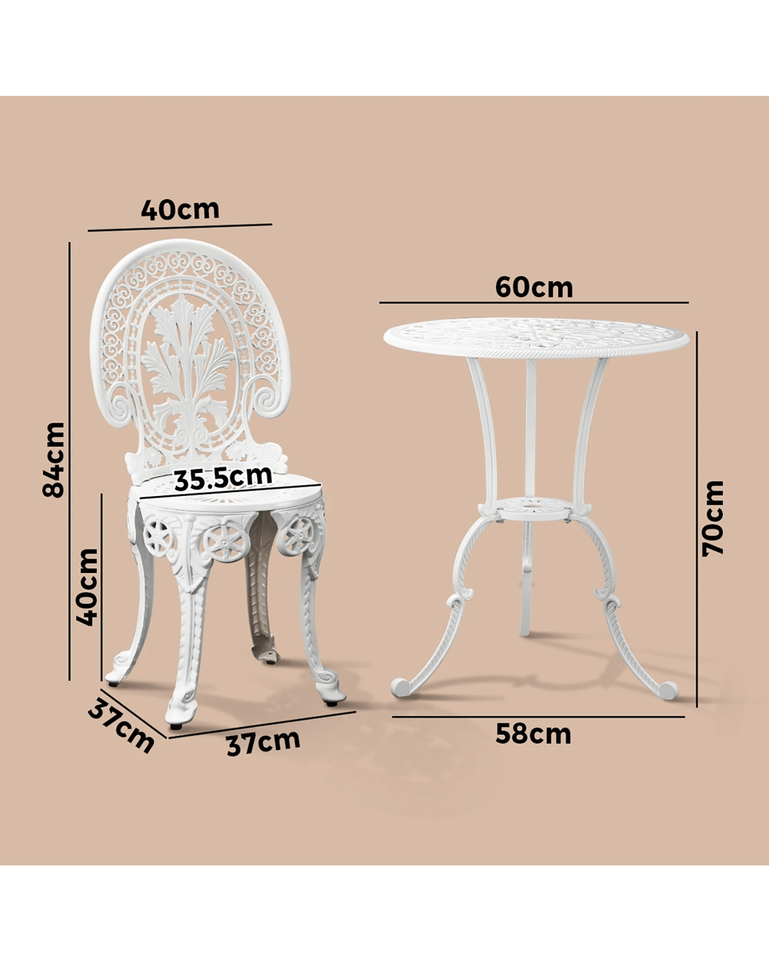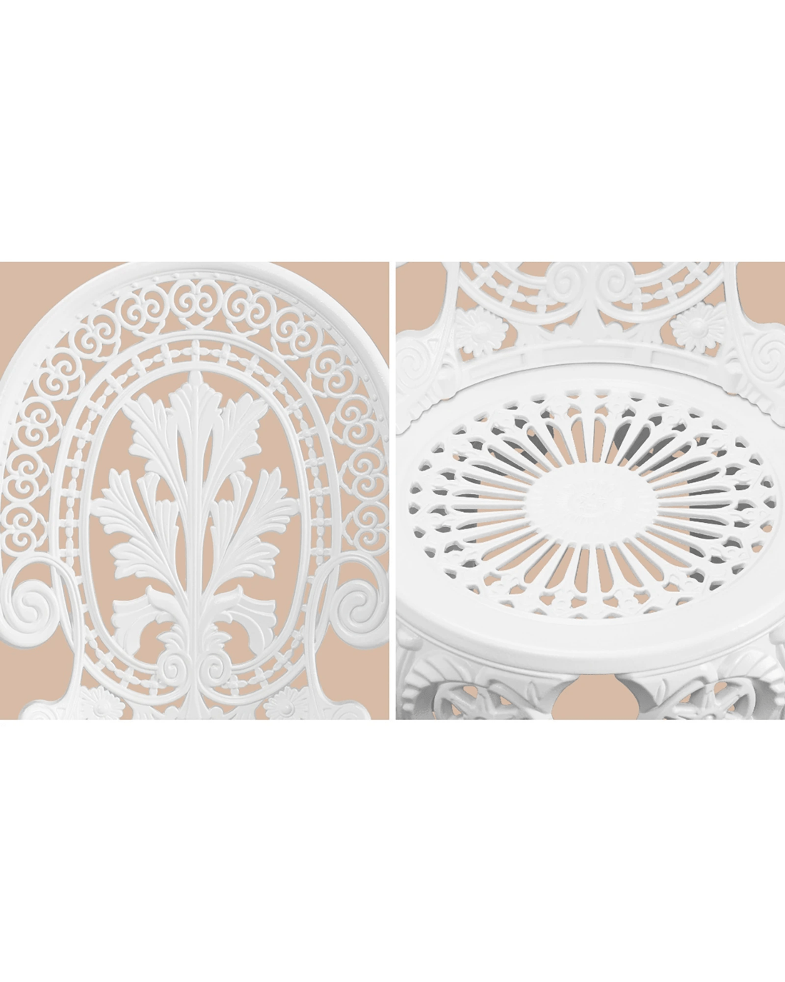 With its meticulous craftsmanship in showcasing the intricate design work, the bistro set is exceptionally stunning with every curve and motif. The Victorian-inspired craftwork is clearly displayed. From its sculpted profile to the detailed pattern etchings, the table and chairs are simply beautiful in every aspect.