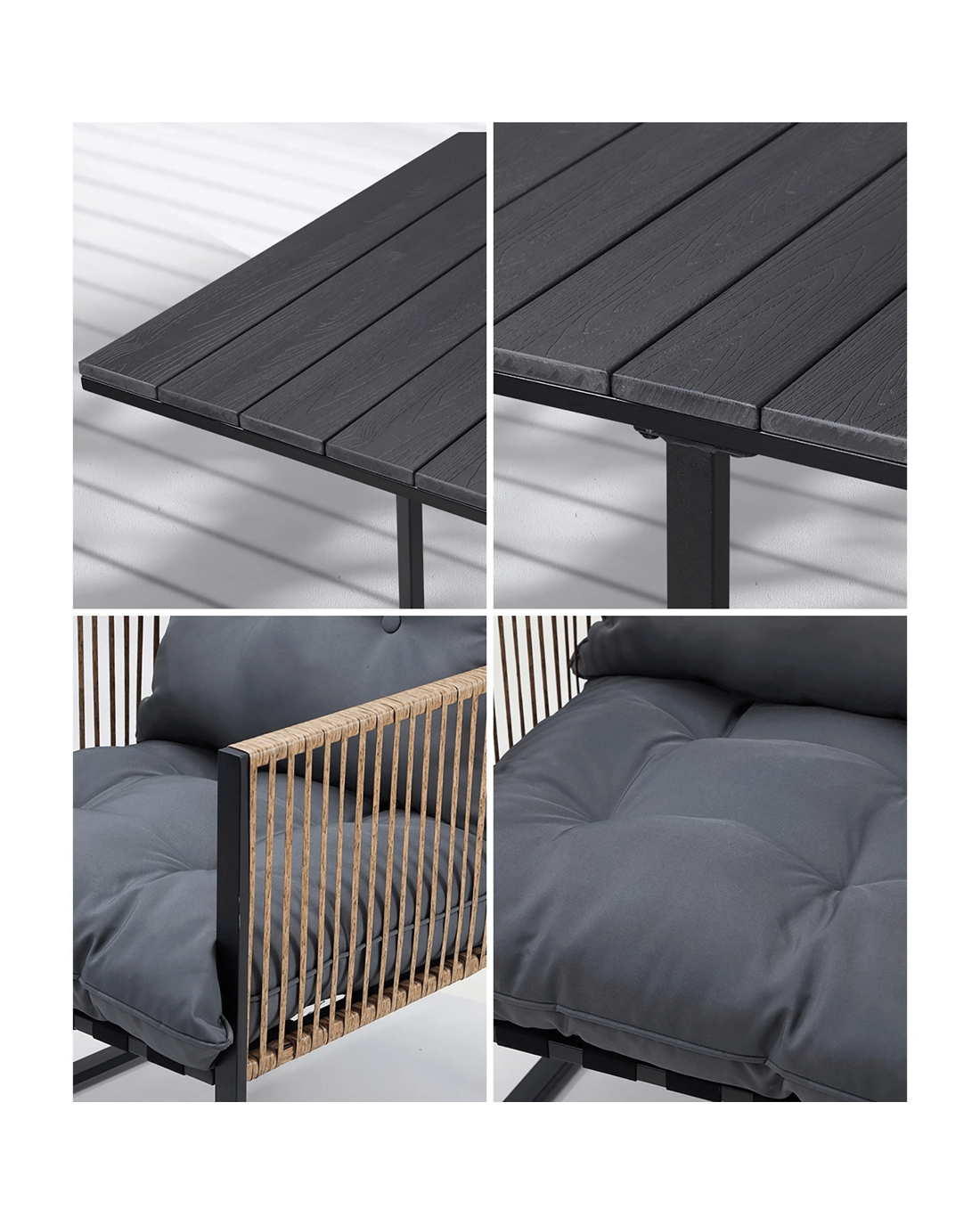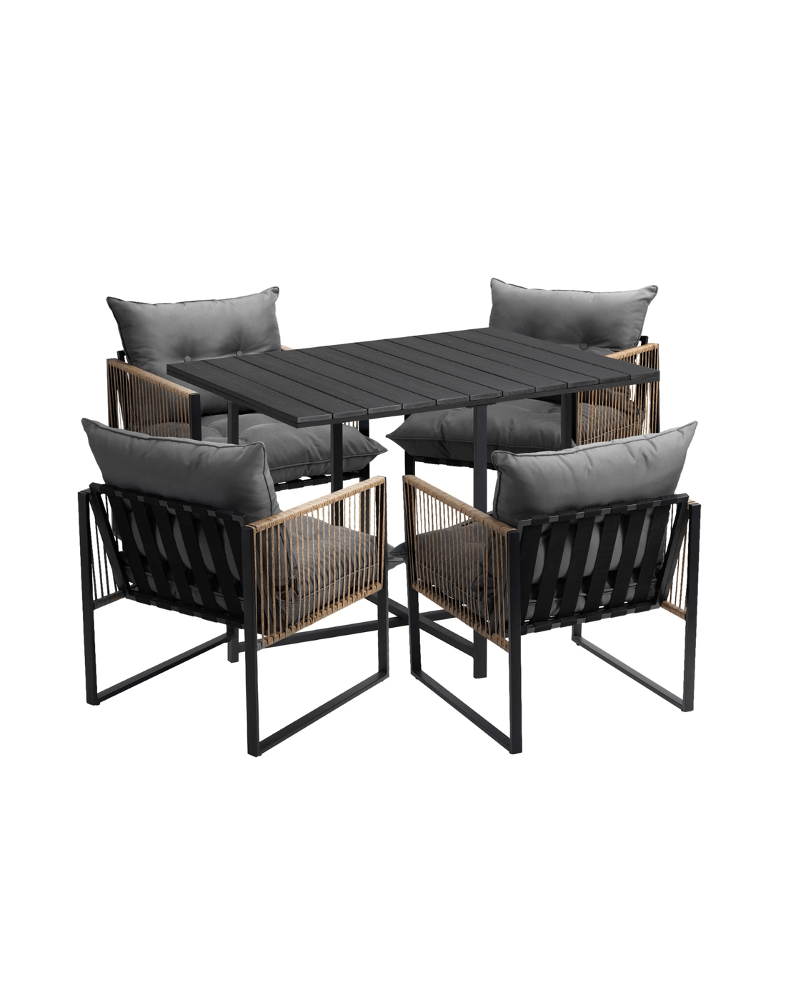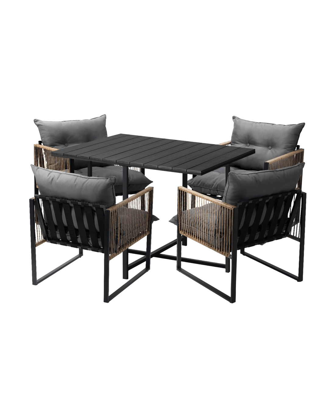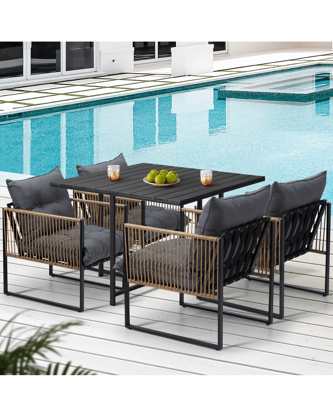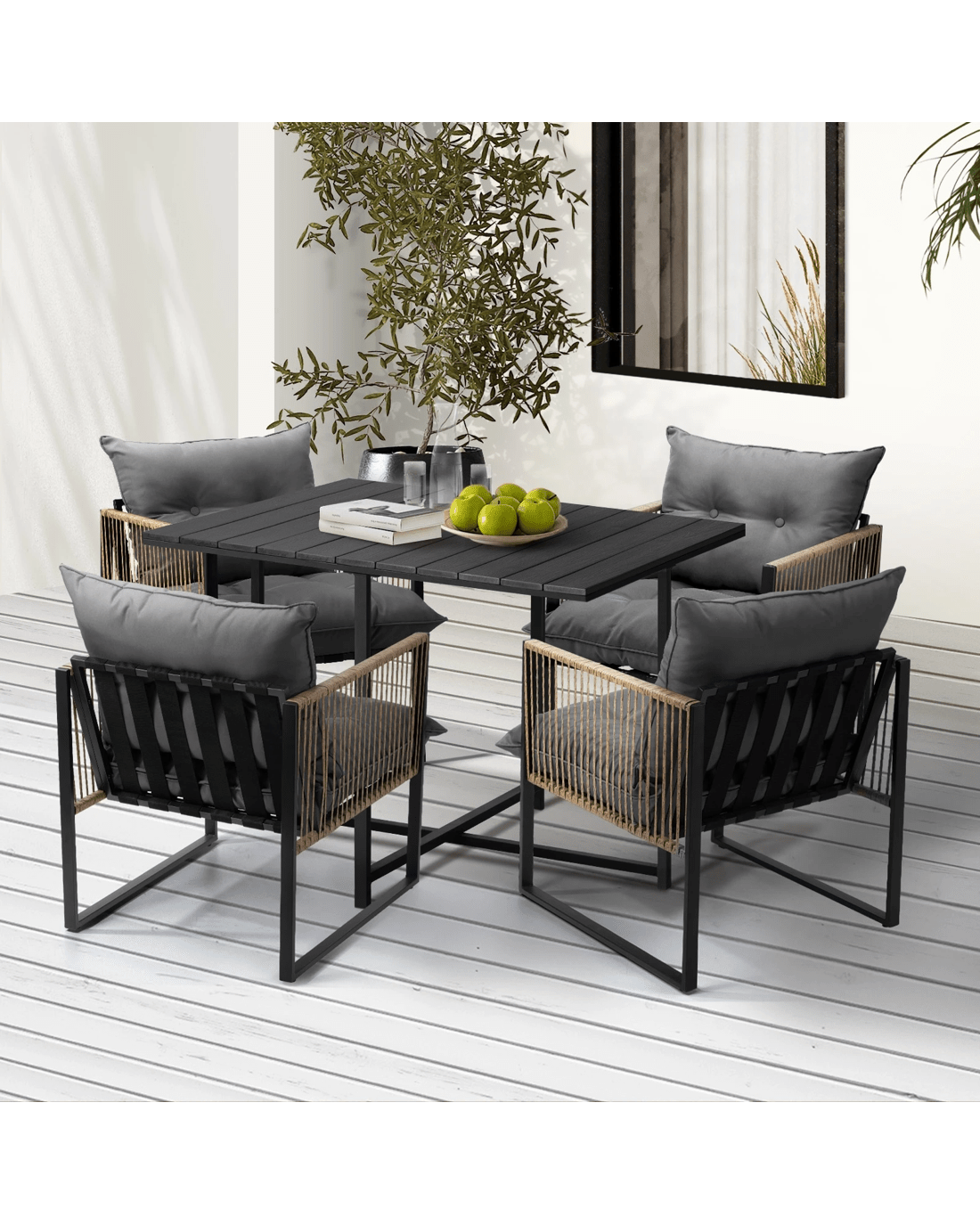 Living life to the fullest. Chilling out under the sun, moon and stars. Alfresco dining with friends, family or just with your precious me-time. Simply pursuing and enjoying life that's meant to be. And the Livsip Outdoor Dining Set is ready to be there at home with you. Stylish. Contemporary. Beautiful. For the dining table, a unique composite wood/plastic top with a natural wood grain finish. And for the dining chairs, equally attractive pieces that go well with the table. The set has all the attributes of chic outdoor furniture that resonate with your discerning lifestyle. Have your lattes, your favourite brews and savour delectable cuisines and other gastronomical delights. Eat, drink and be merry! But how does the dining set stand up to the harsh and sometimes fickle Australian weather? No worries mate as it's all weather-resistant, chairs and table, with strength and durability for robust use. Not least, this dining setup also looks fabulous with any indoor eclectic styling ideas that you may have. Convinced that this delightful outdoor package is for you? Click on the Buy option and soon you'll be feasting to your (and many others too) heart's content at the Livsip Outdoor Dining Set day and night, night and day, in every season.