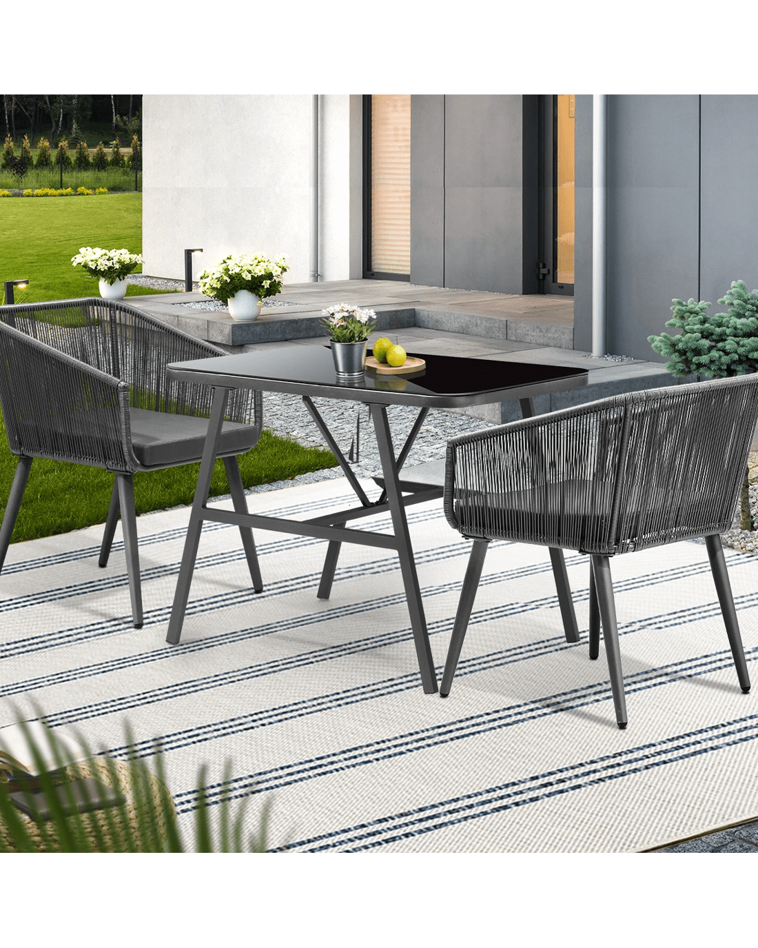 Crafted with meticulous attention to detail, our outdoor dining table is a masterpiece of design and engineering. The table features a spacious, sturdy surface that provides ample room for your delectable meals, refreshing drinks, and delightful conversations. Its tempered glass top and steel frame ensure long-lasting durability, allowing you to enjoy countless outdoor gatherings without worrying about wear and tear.