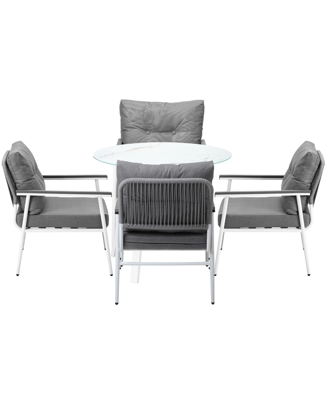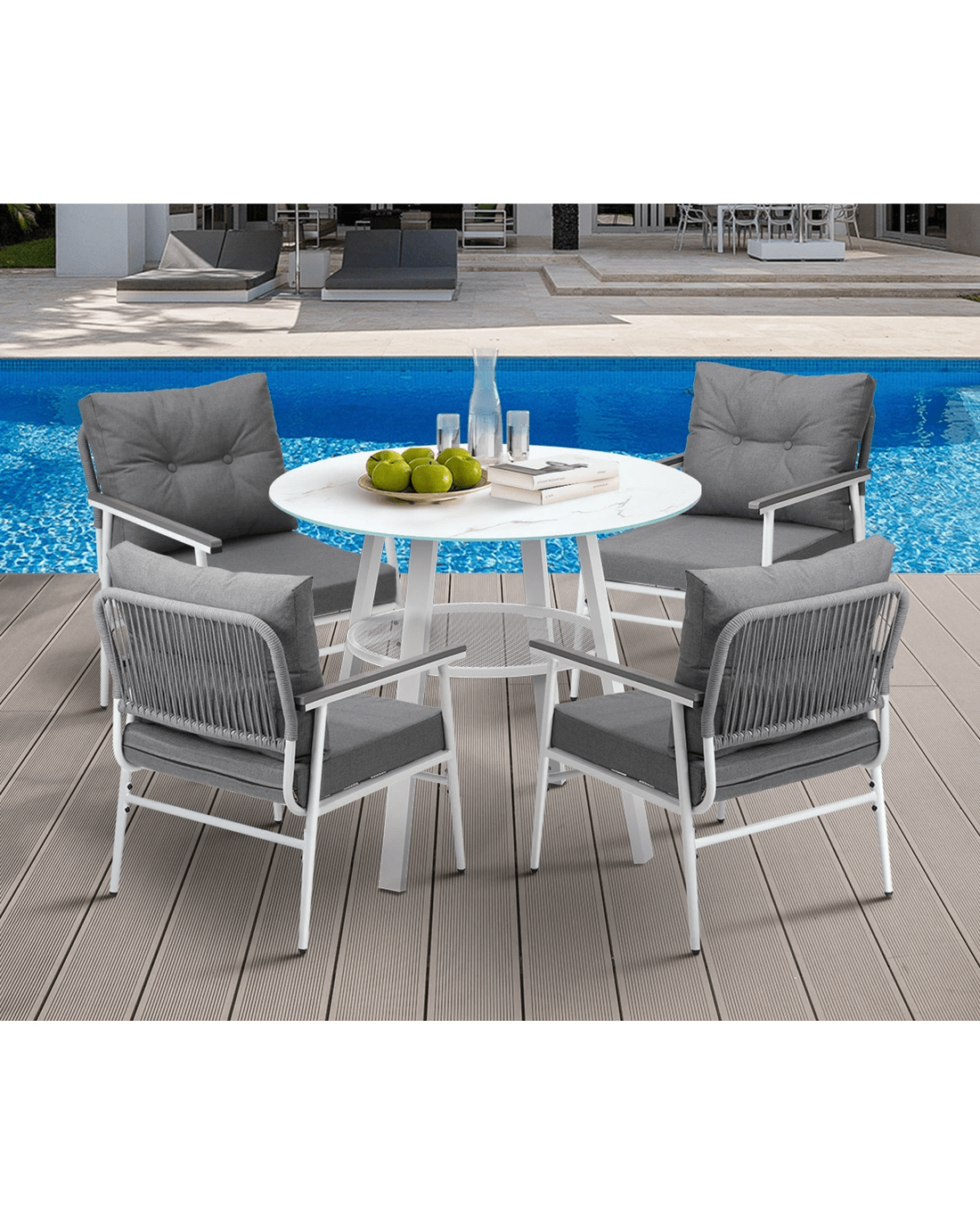 Living life to the fullest. Chilling out under the sun, moon and stars. Alfresco dining with friends, family or just with your precious me-time. Simply pursuing and enjoying life that is meant to be. And the Livsip Outdoor Dining Set is ready to be there at home with you. Stylish. Contemporary. Beautiful. For the dining table, a white ceramic tempered glass top with handy storage shelf beneath. And for the dining chairs, equally attractive pieces that go well with the table. The set has all the attributes of chic outdoor furniture that resonate with your discerning lifestyle. Have your lattes, your favourite brews and savour delectable cuisines and other gastronomical delights. Eat, drink and be merry! But how does the dining set stand up to the harsh and sometimes fickle Australian weather? No worries mate as it is all weather-resistant, chairs and table, with strength and durability for robust use. Not least, this dining setup also looks fabulous with any indoor eclectic styling ideas that you may have. Convinced that this delightful outdoor package is for you? Click on the Buy option and soon you will be feasting to your (and many others too) heart's content at the Livsip Outdoor Dining Set day and night, night and day, in every season.