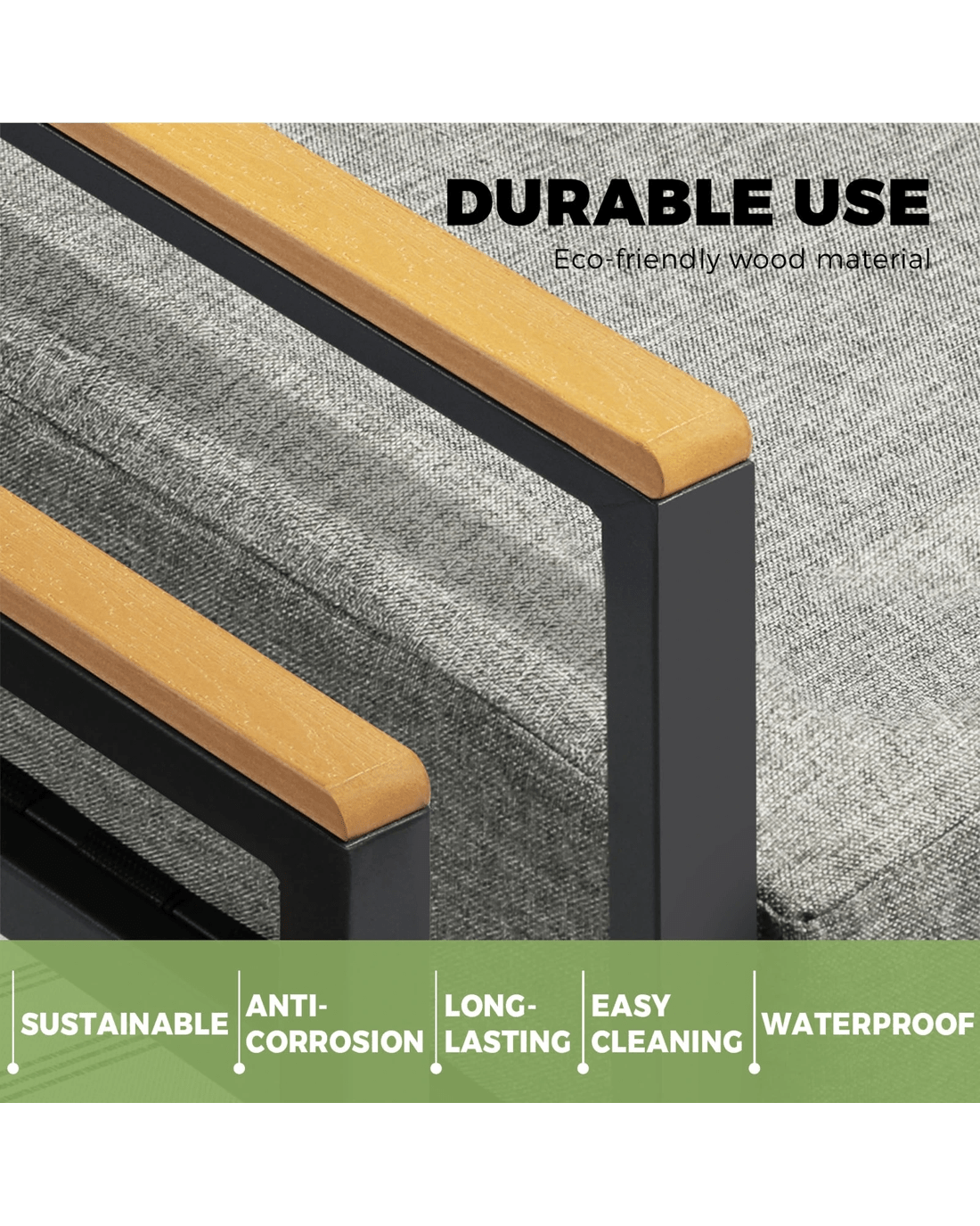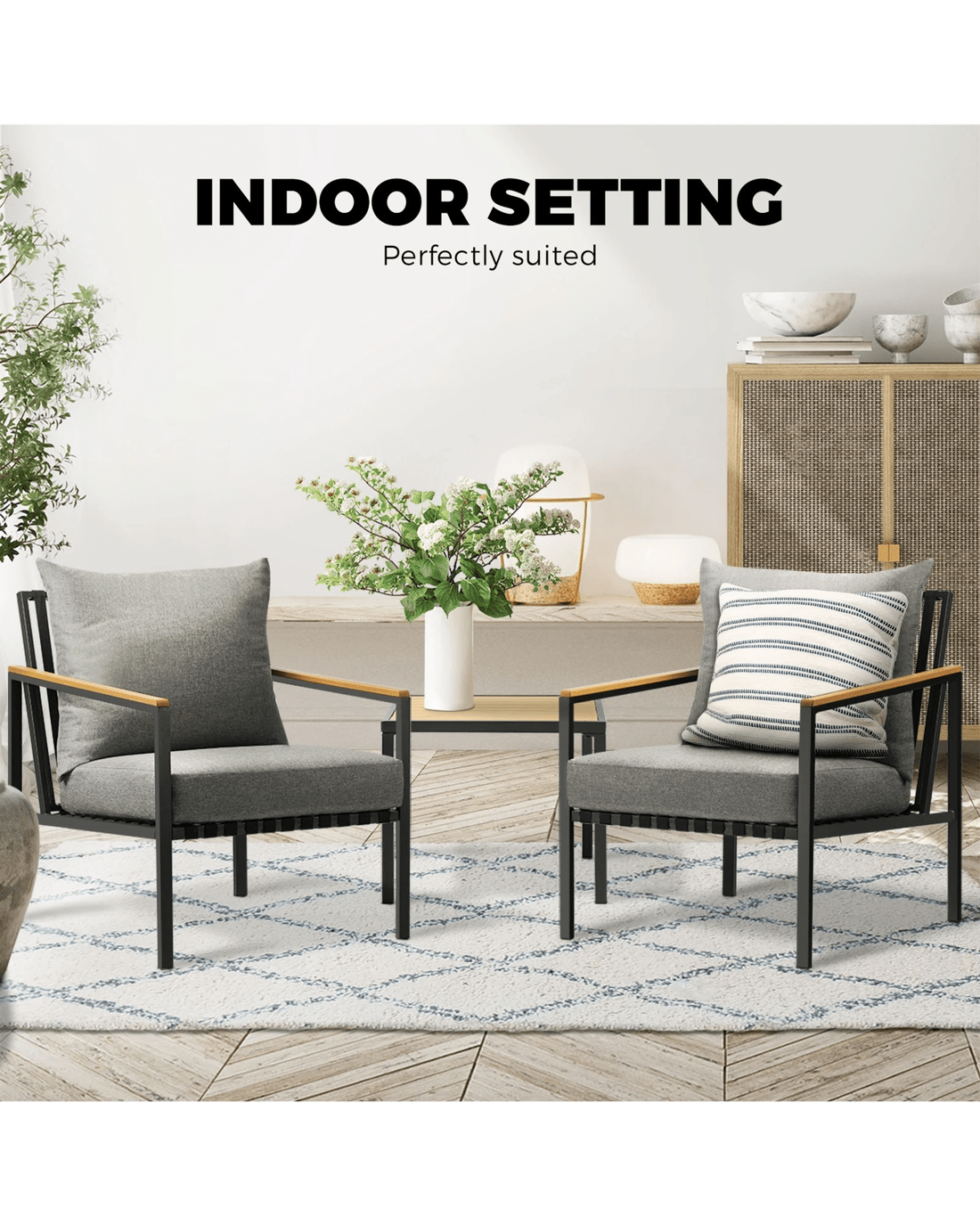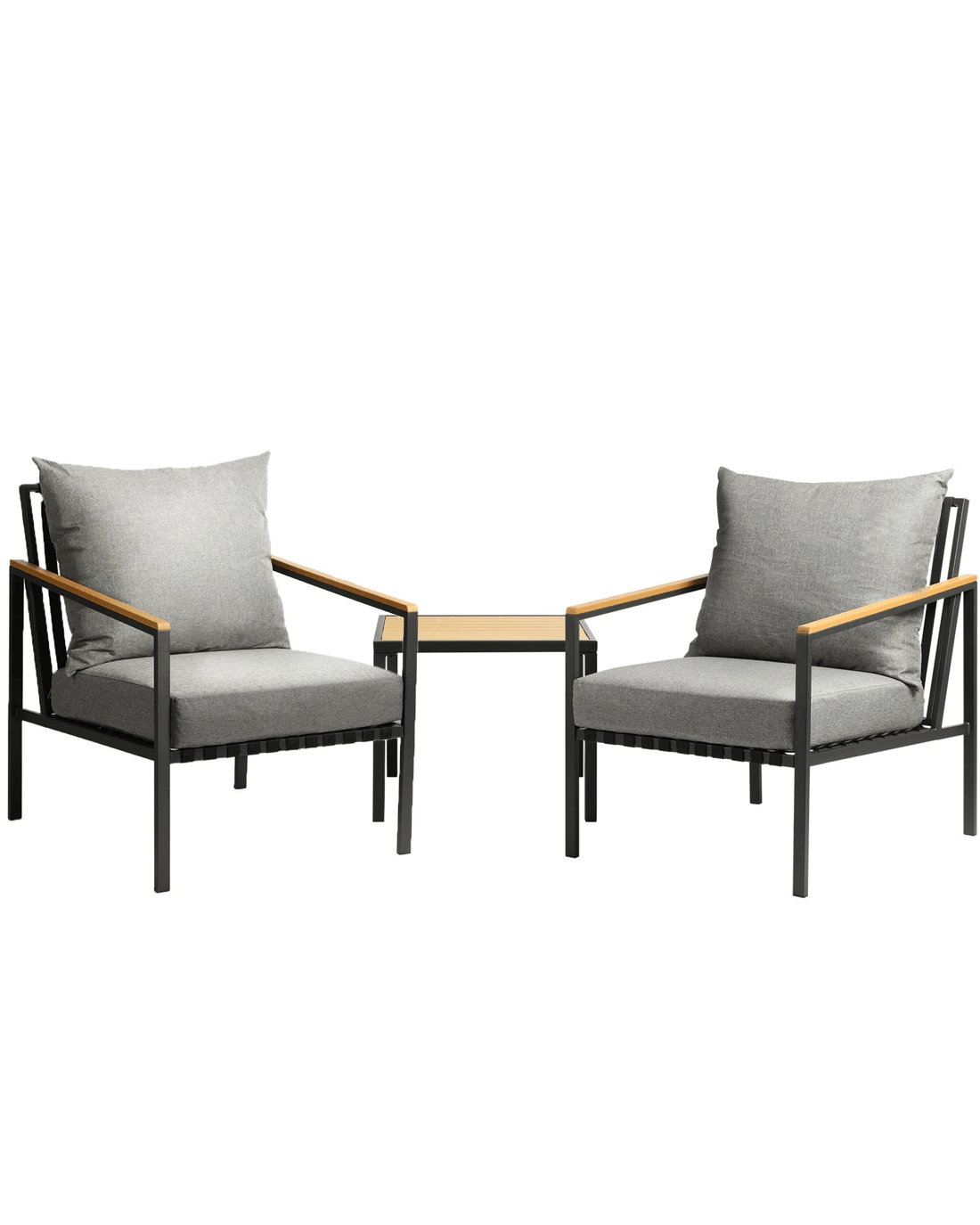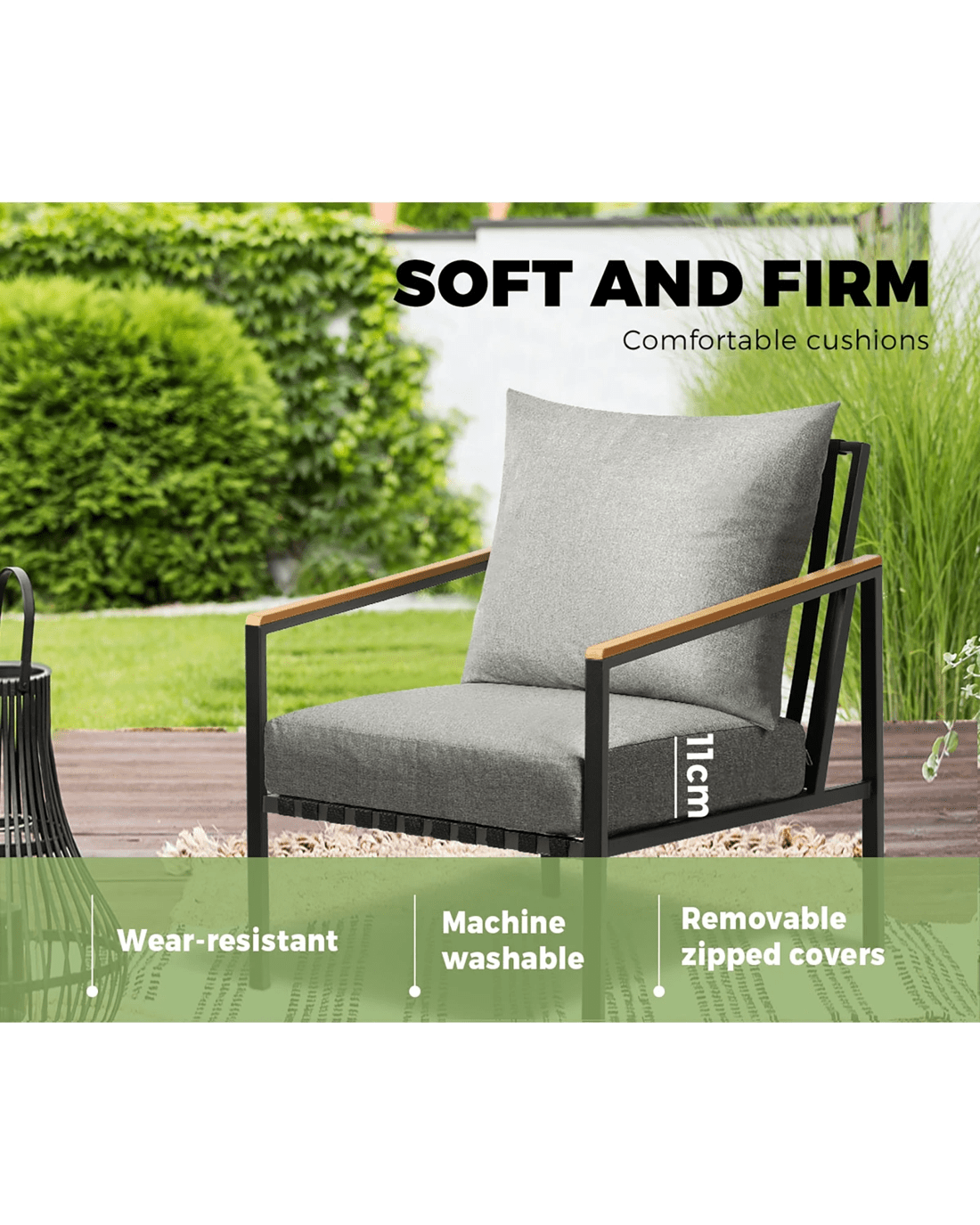 Naturally, we also ensure that the furniture is made with responsible and sustainable processes. Such as the eco-friendly wood material lining the armrests that not only looks good, but also display long-lasting qualities. Not to be outdone, the frame is made of heavy-duty powder-coated steel to enable robust use and high load bearing. Comfort is also not forgotten as all the seating features thickly padded high resilience cushions and an angled backrest that is perfected to let you seat for hours with nary a complaint. Not least, rounding off this exceptional set is a matching coffee table.