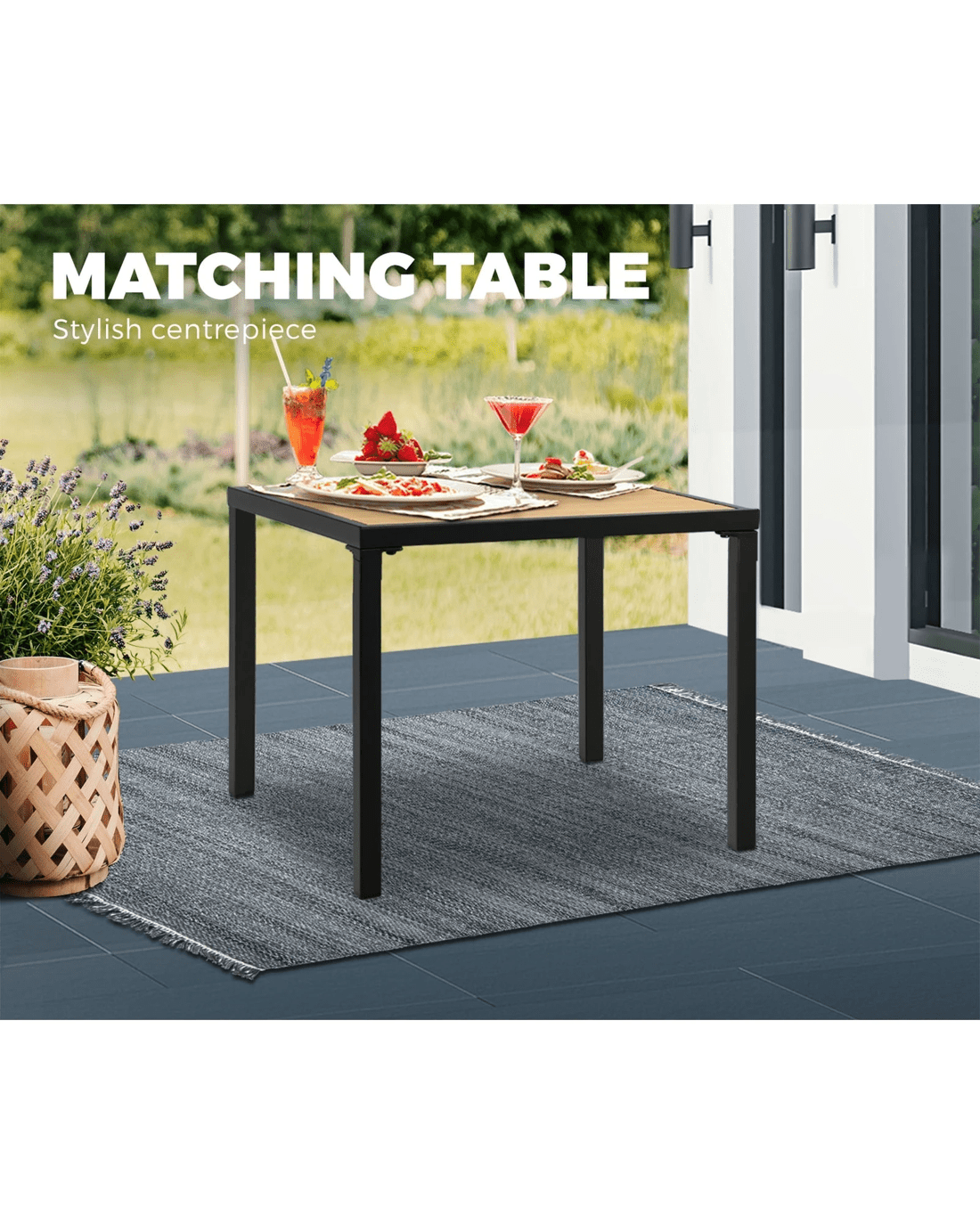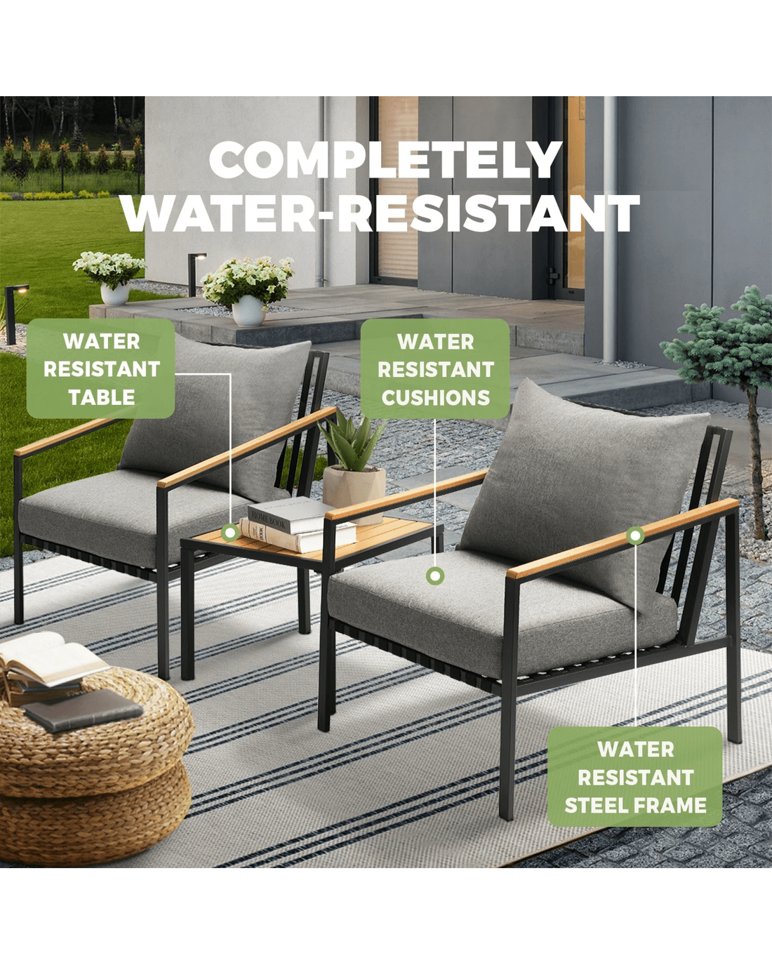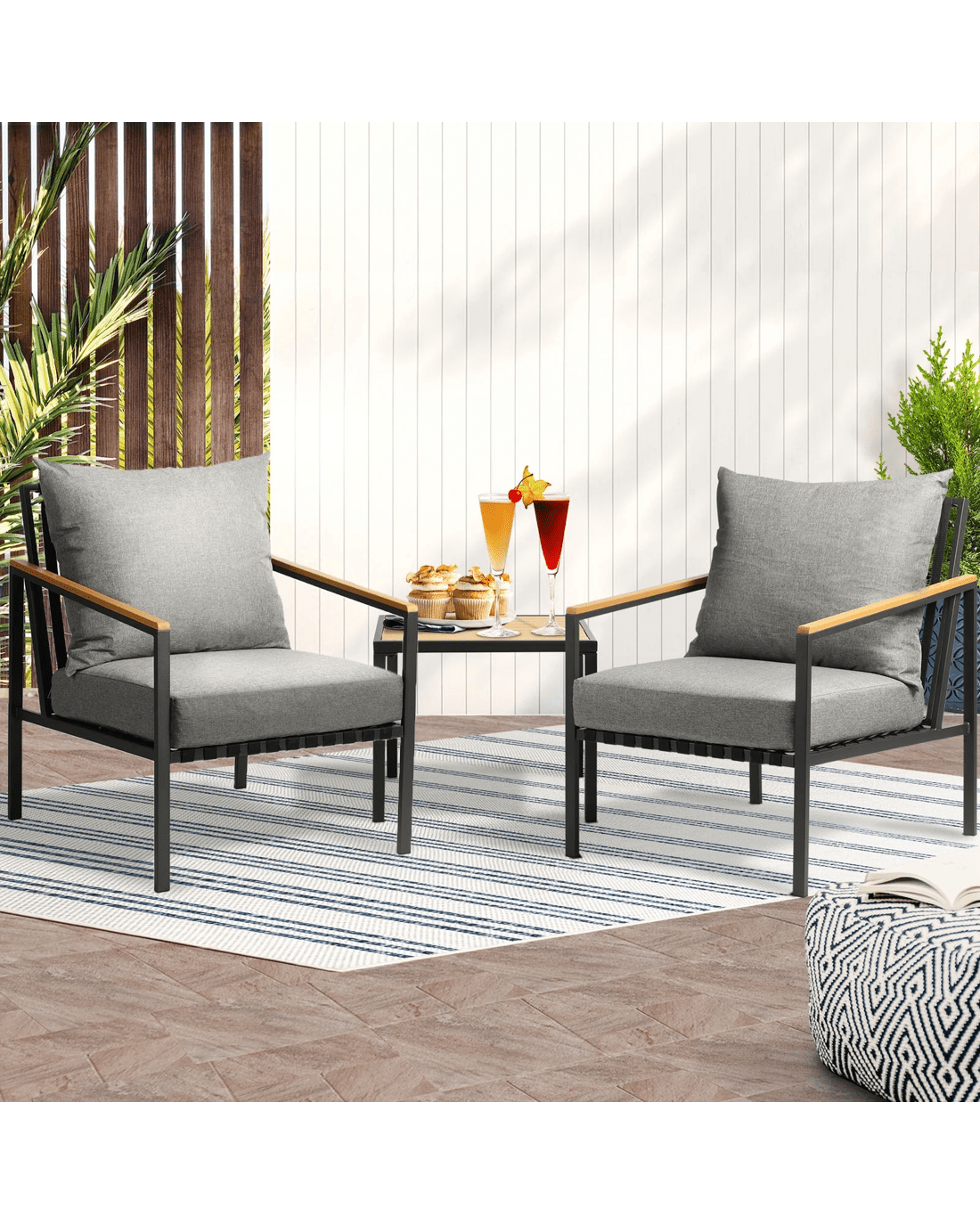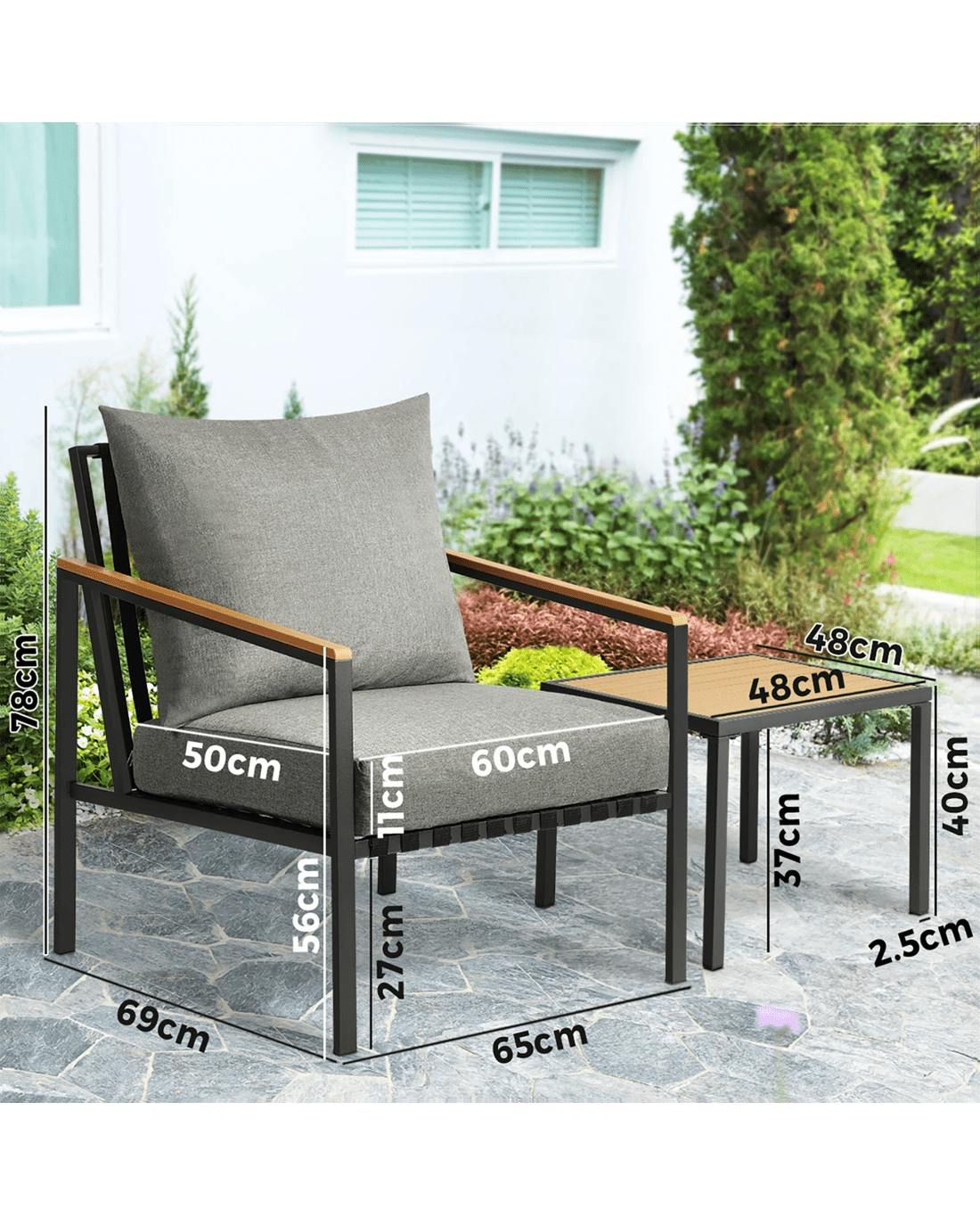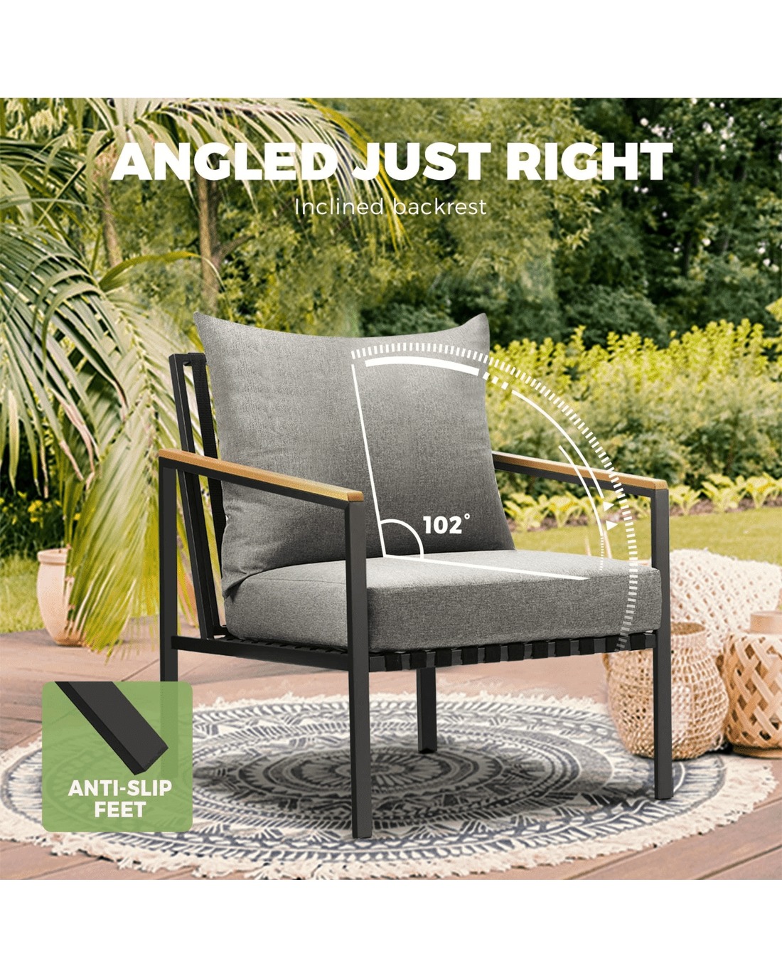 Naturally, we also ensure that the furniture is made with responsible and sustainable processes. Such as the eco-friendly wood material lining the armrests that not only looks good, but also display long-lasting qualities. Not to be outdone, the frame is made of heavy-duty powder-coated steel to enable robust use and high load bearing. Comfort is also not forgotten as all the seating features thickly padded high resilience cushions and an angled backrest that is perfected to let you seat for hours with nary a complaint. Not least, rounding off this exceptional set is a matching coffee table.