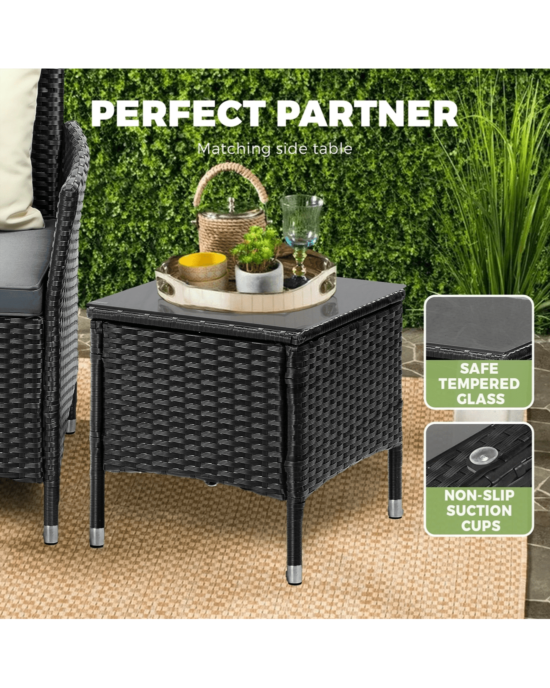 Comfort is also not forgotten as the seating features high resilience cushions and a contoured backrest that is angled perfectly to let you sit for hours with nary a complaint. Not least, the matching side table comes with a 5mm tempered glass top for safe use always.