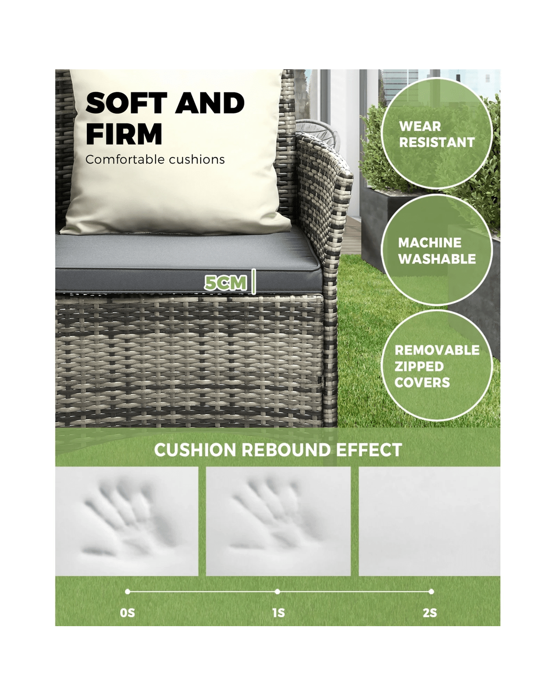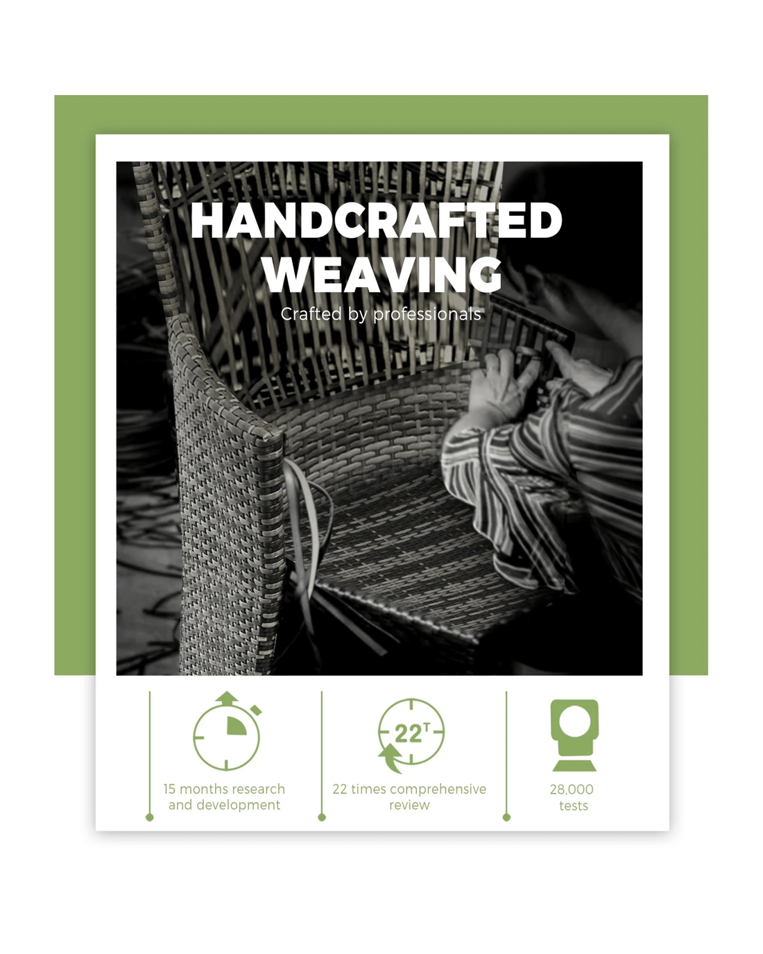 The handcrafted rattan weave design is a classic and the entire ensemble is totally weather-friendly with high resistance to UV rays, heat, water and mould, and with little or no maintenance needed to maintain its colour and texture. Not to be outdone, the frame is made of smooth powder-coated steel to enable robust and long-lasting use.