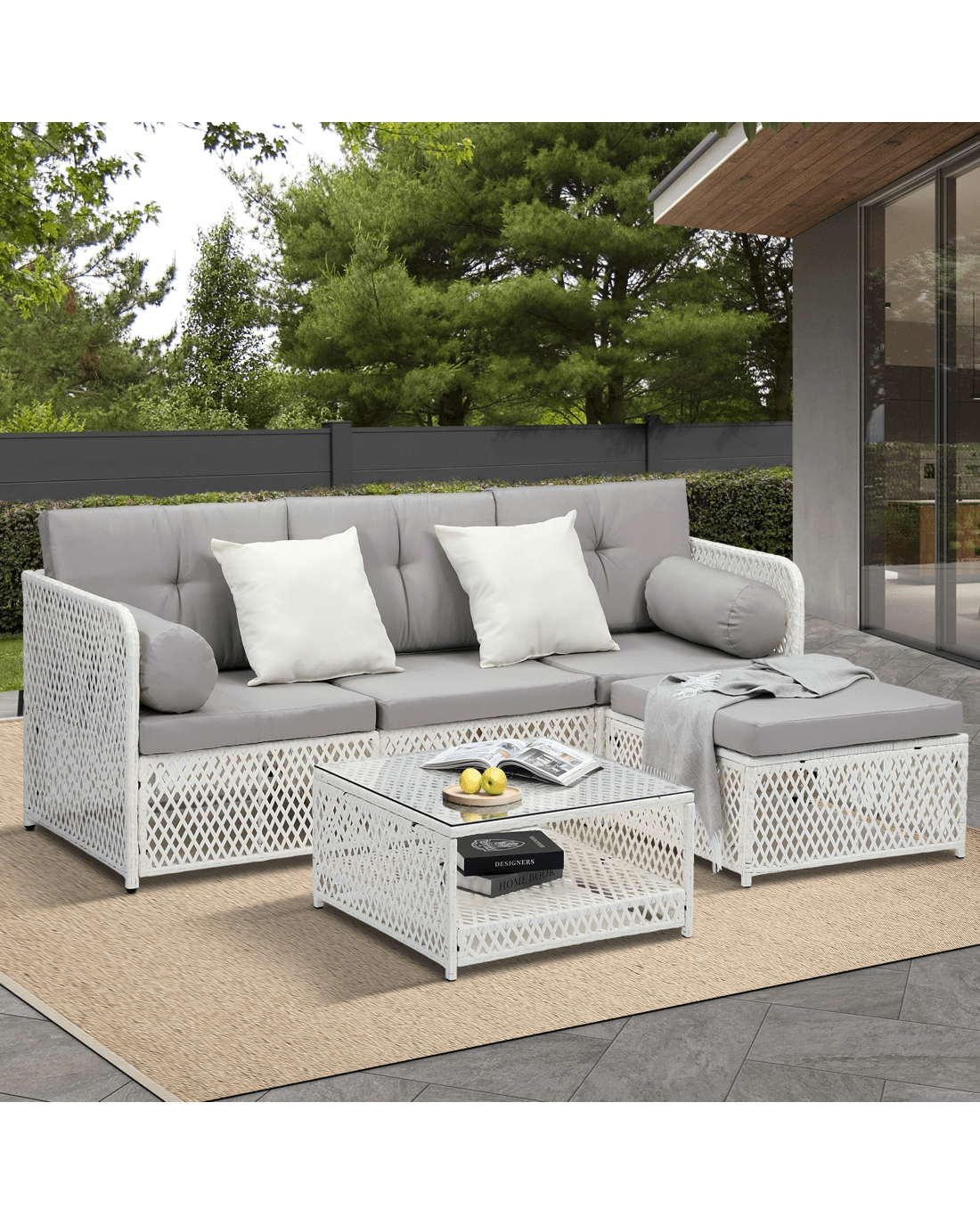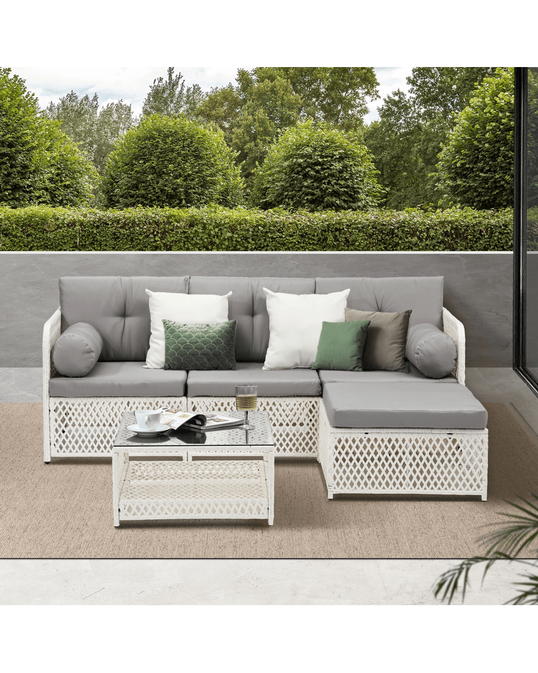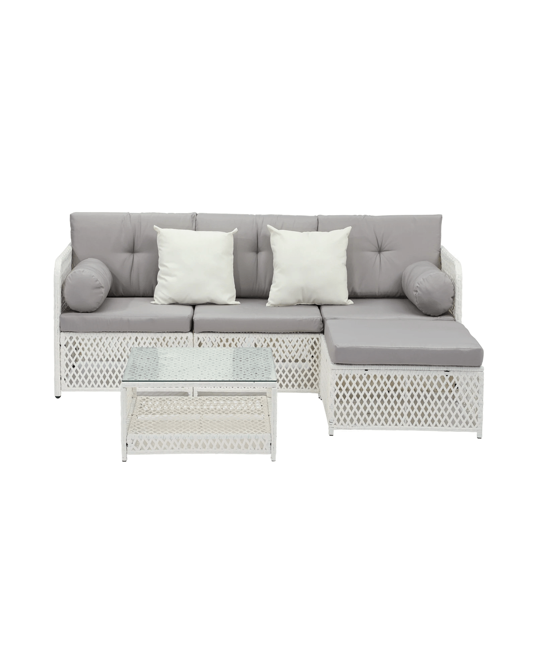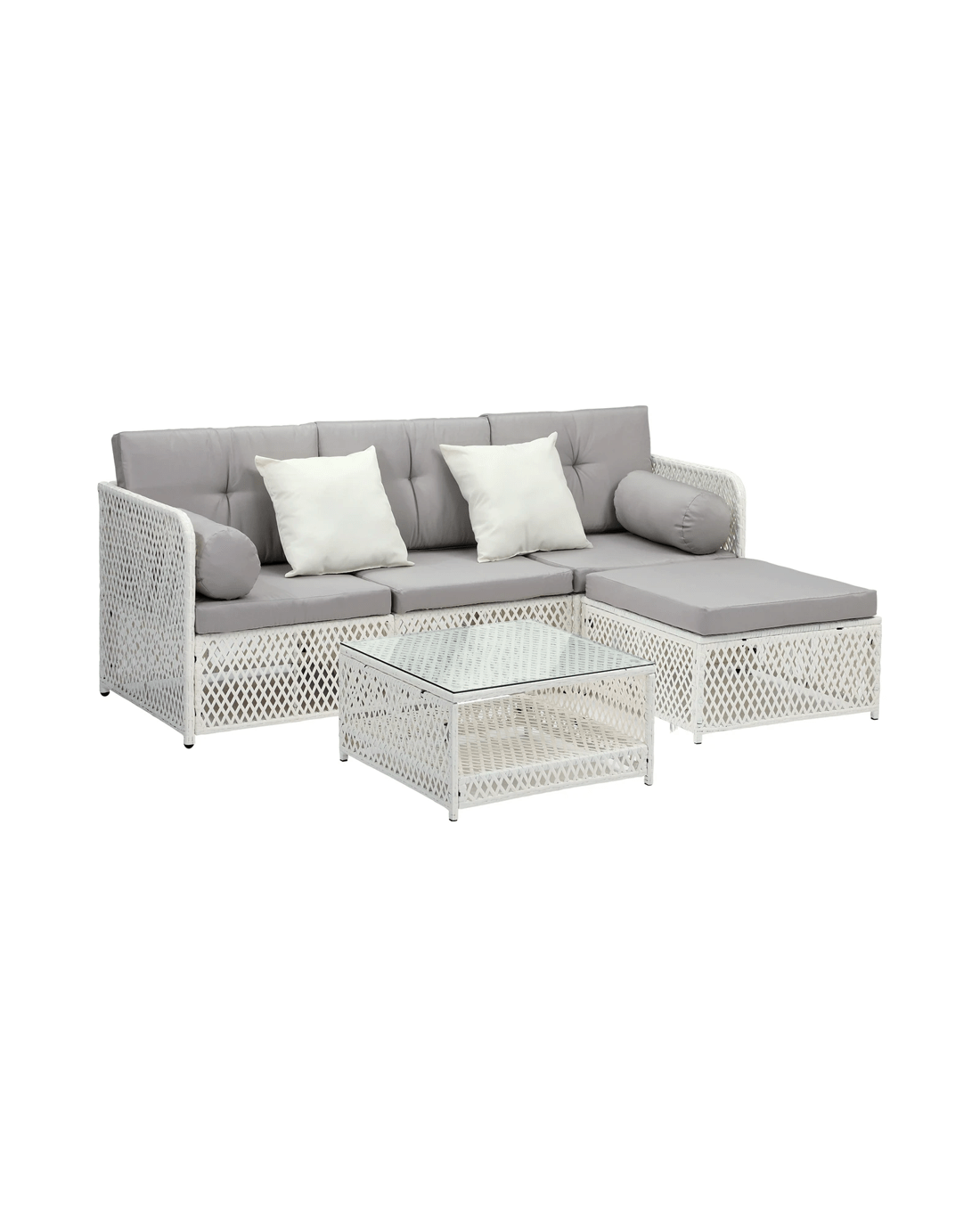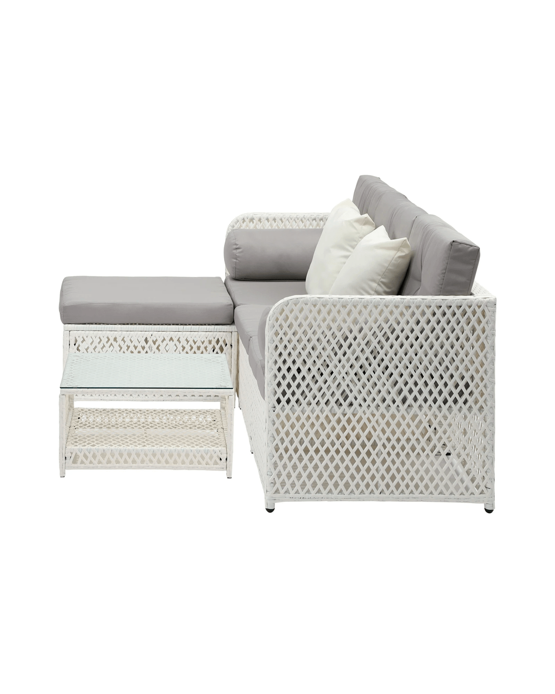 Every piece of the outdoor wicker sofa set is made with exacting standards. Starting with the strong wicker cum metal framework for the sofa and ottoman that enable heavy-duty usage and a matching thick glass top coffee table that provides ample space for all your entertaining and relaxation paraphernalia. The attention to details is meticulous throughout with no hard edges to be felt anywhere. Not to be outdone, the sofa cushions and pillows are equally enticing with rich form padding for long-lasting comfort and enveloped in removable and washable covers for hassle-free cleaning and washing.