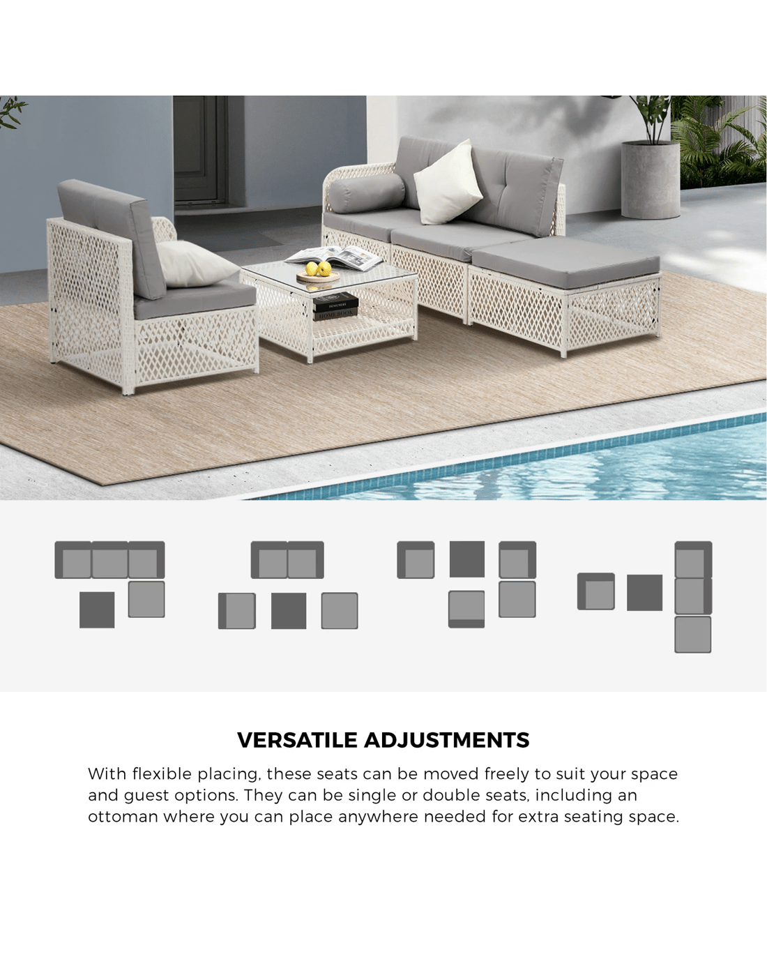With a 5-piece sofa set configuration comprising a 3-seater sofa, one ottoman and a matching coffee table to suit your requirements, our outdoor sofa set is highly versatile and flexible in use. Apartment balcony or house patio, the outdoor wicker sofa set simply makes its presence felt and enjoyed in more ways than one.