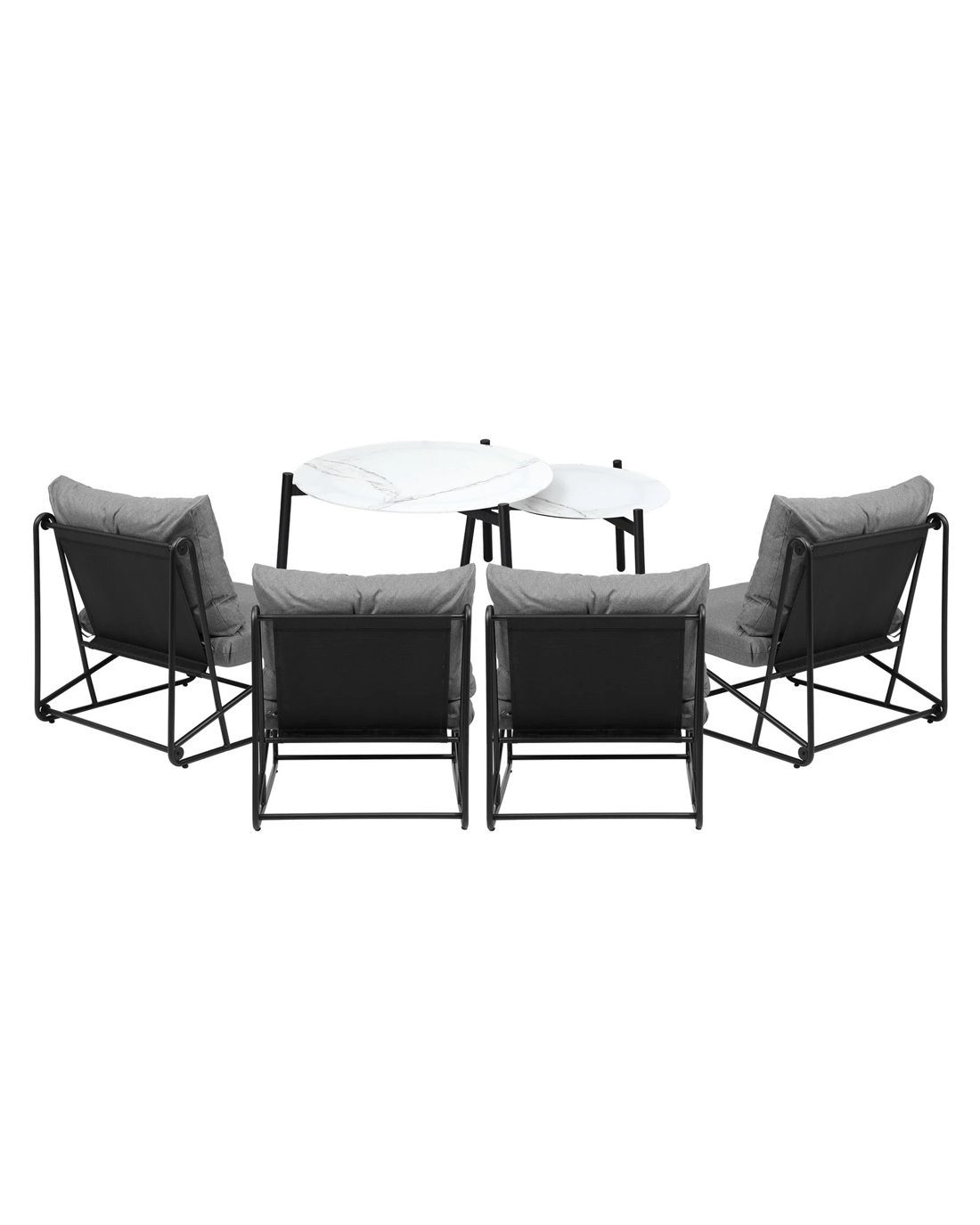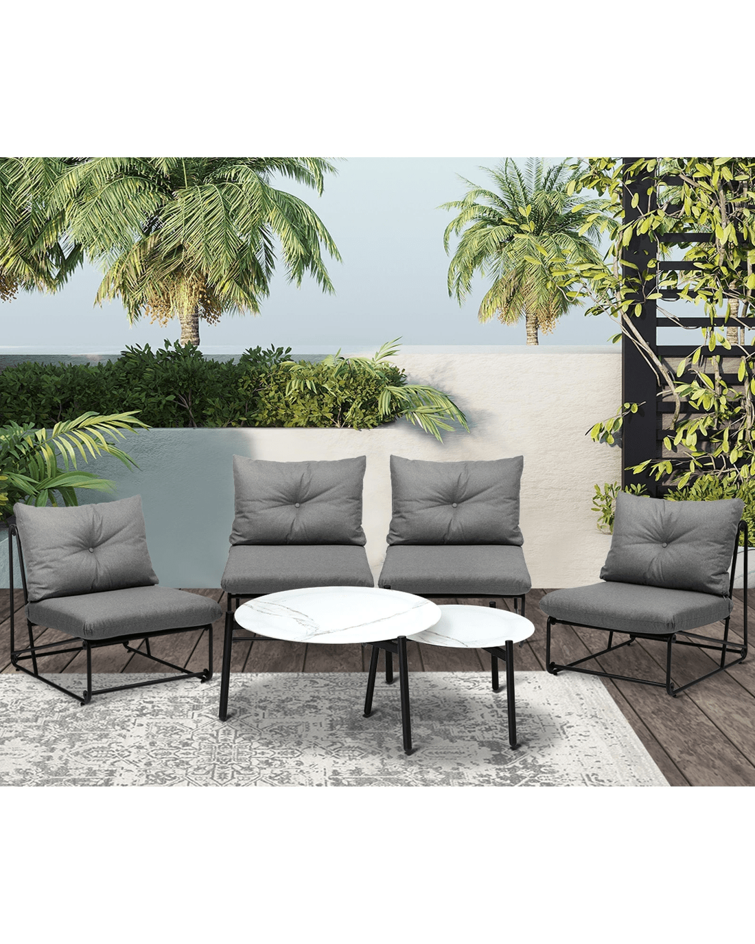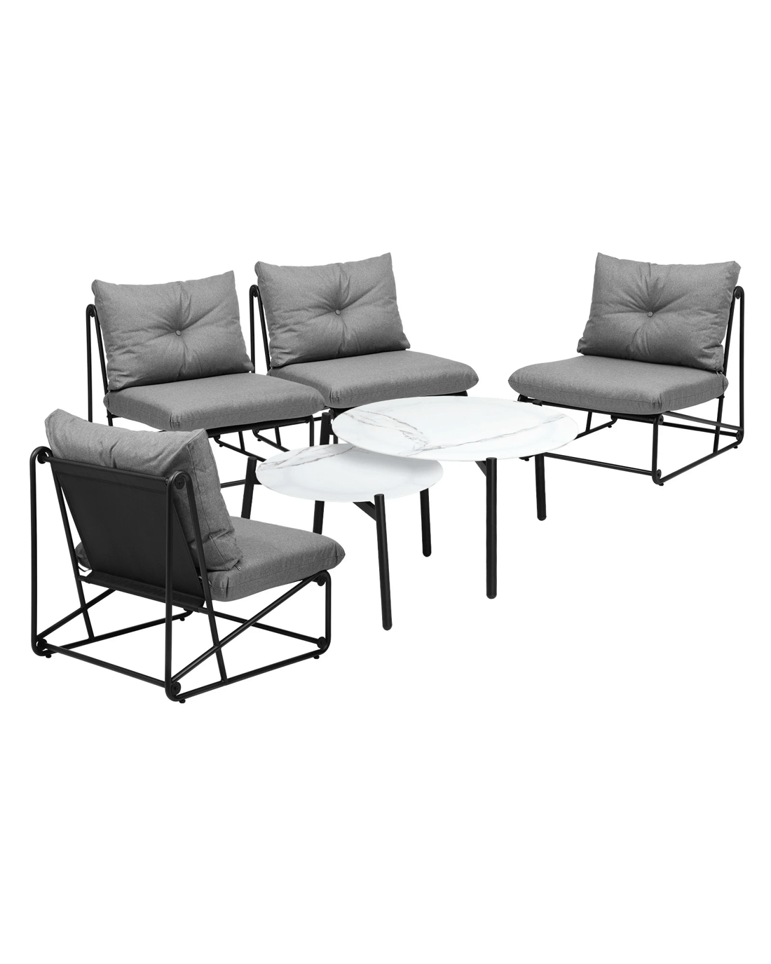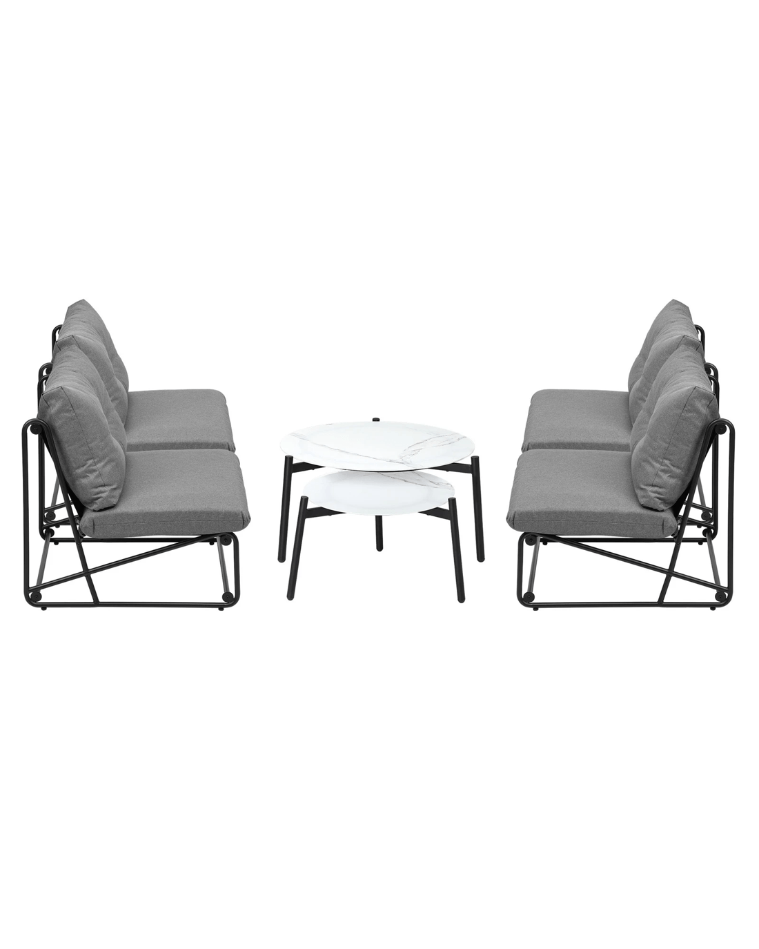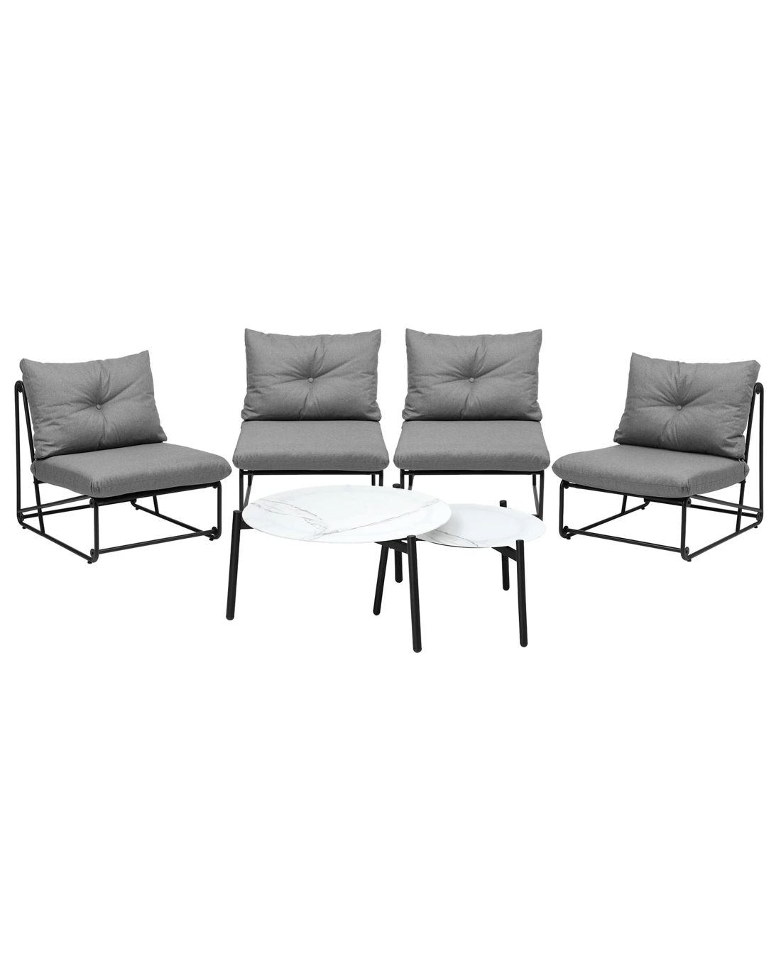 For the single chairs, thick and wide seat and backrest cushions are matched with a unique black powder-coated inter-locking steel frame for a classy and sophisticated look that transcends time and space. Likewise, with its stone-composite finish for the table top and black powder-coated metal legs, the nesting table adds even more elegance to the entire outdoor ensemble. As a whole, the sofa set is finished with meticulous attention to details and committed workmanship.