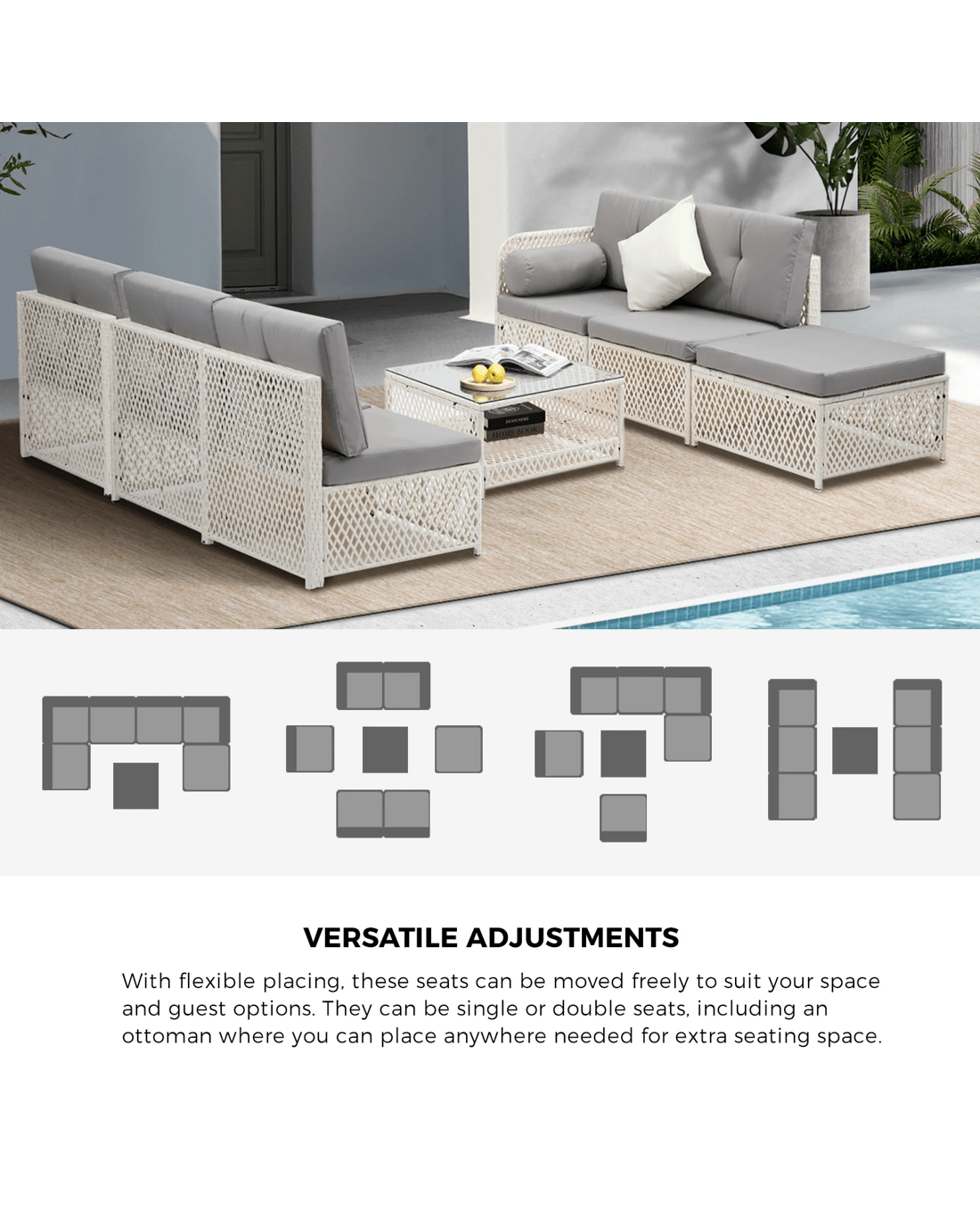 With a 7-piece sofa set configuration comprising a 3+2 sofa combination, one ottoman and a matching coffee table to suit your requirements, our outdoor sofa set is highly versatile and flexible in use. Apartment balcony or house patio, the outdoor wicker sofa set simply makes its presence felt and enjoyed in more ways than one.