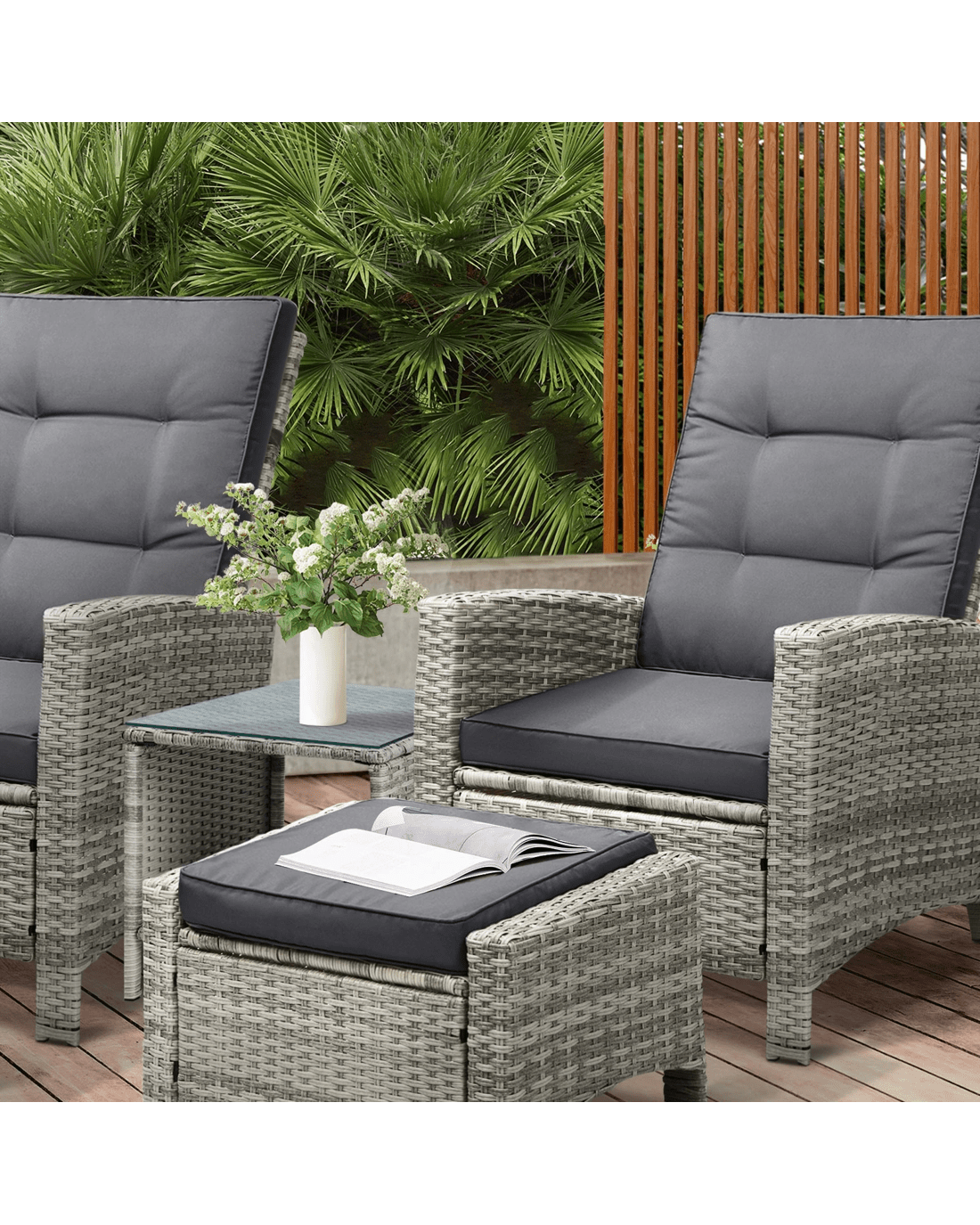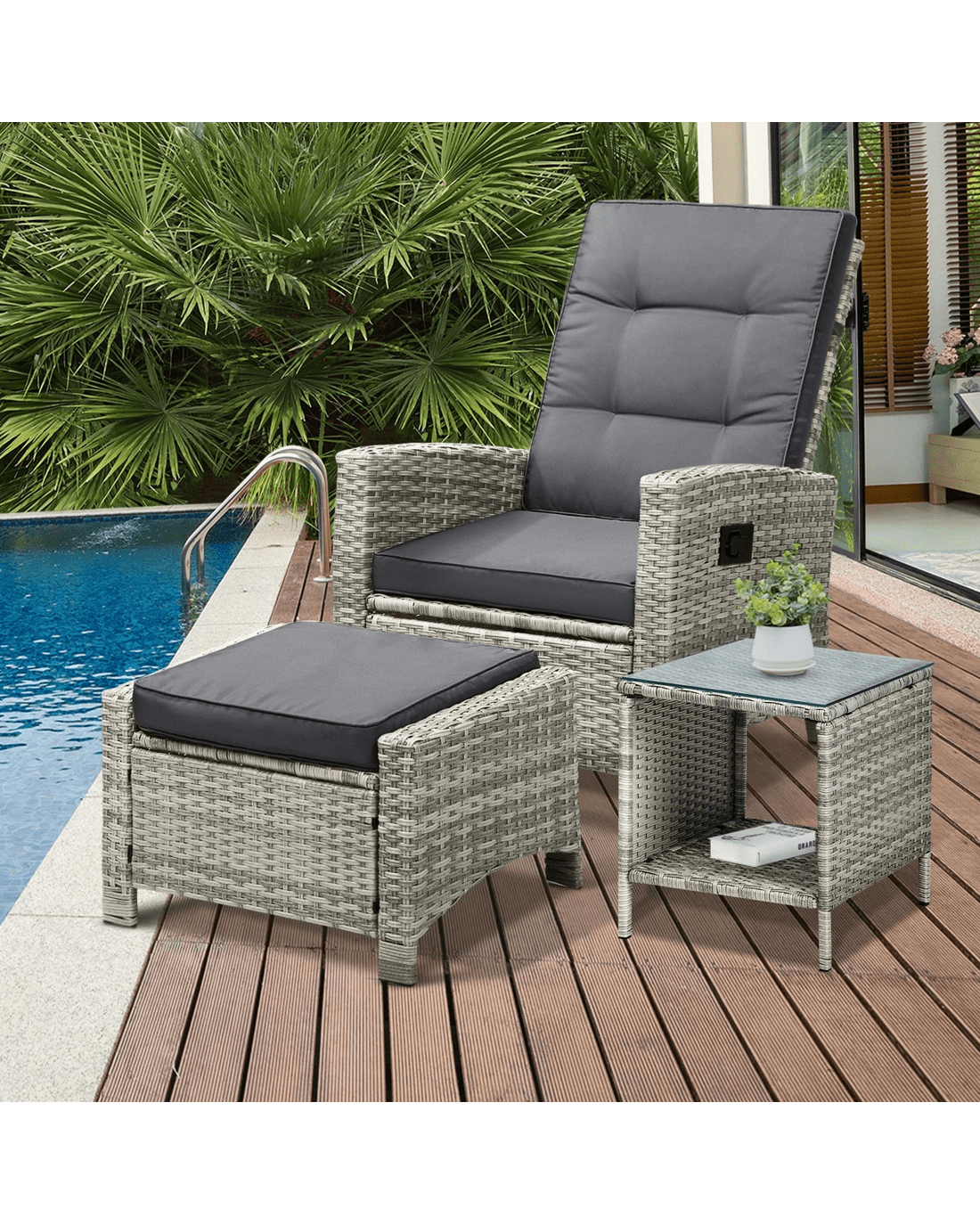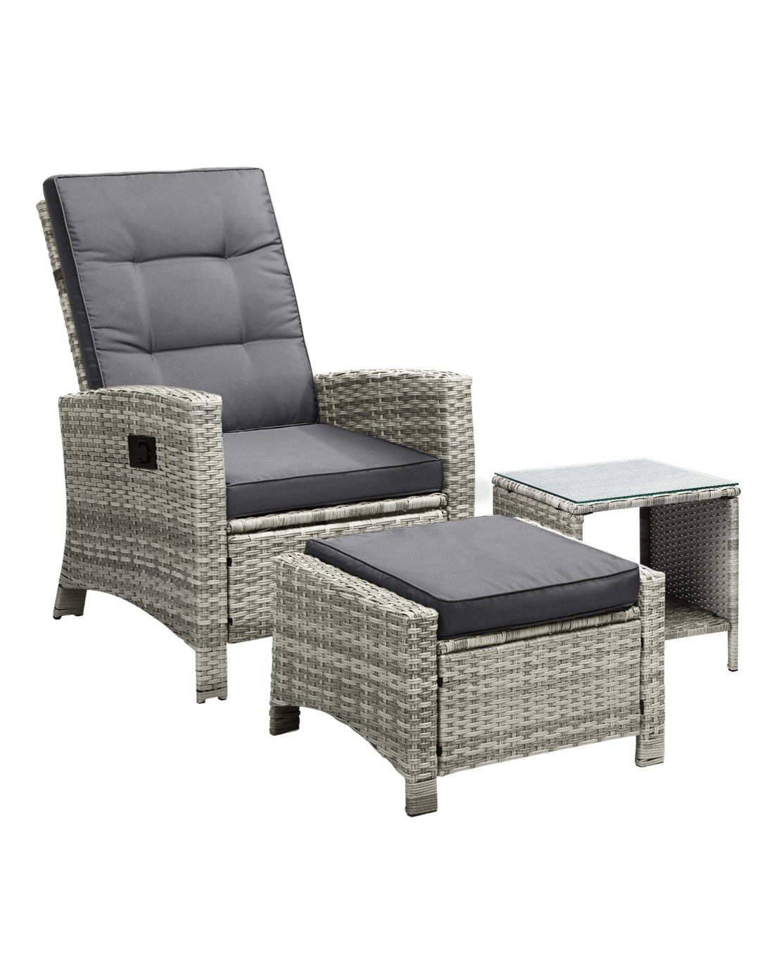 Livsip Recliner Chair Outdoor Sun Lounge Setting Wicker Sofa Patio Furniture 3pc - Grey