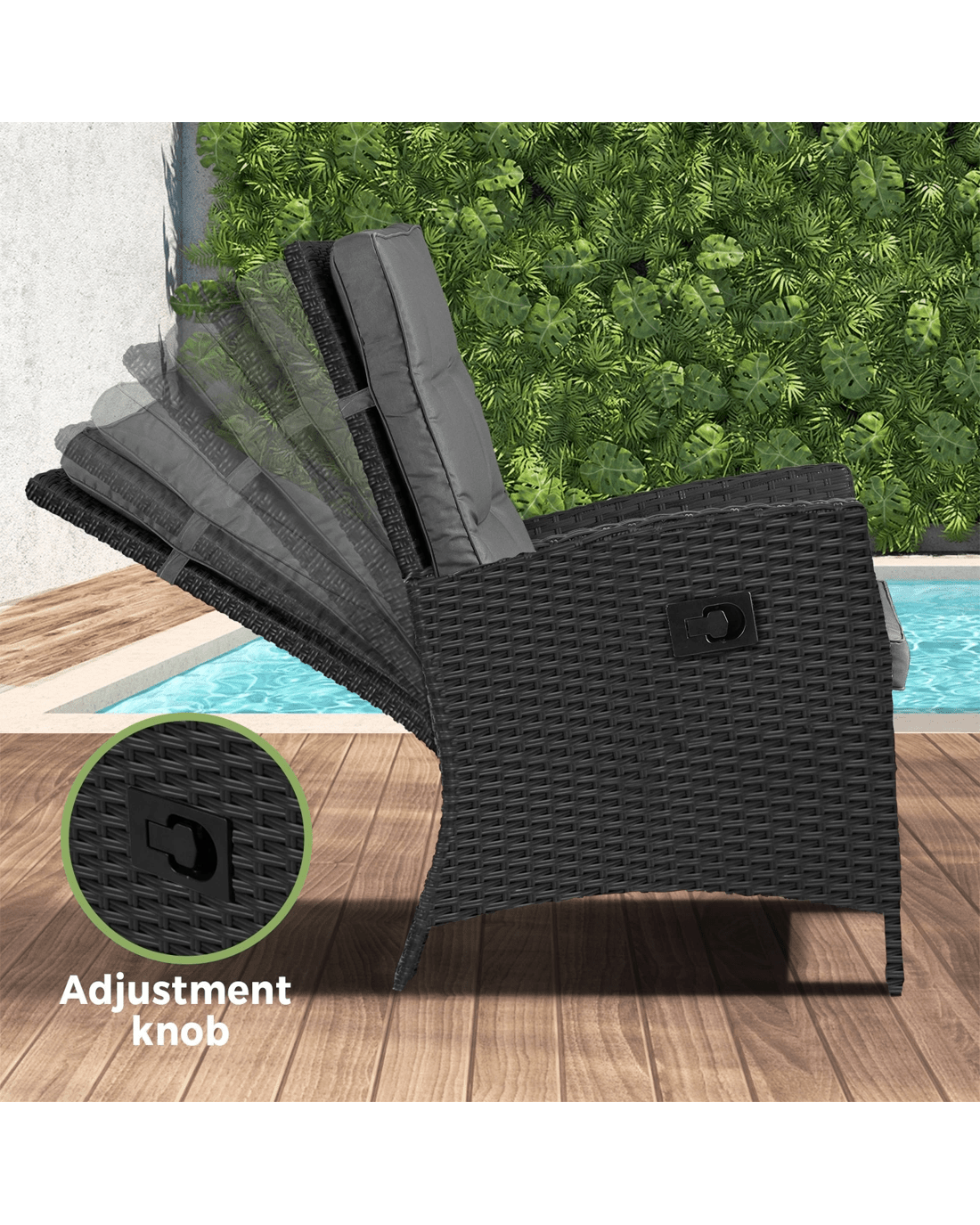 Handcrafted with durable PE rattan weaving, the recliner chair displays exceptional handiwork with meticulous attention to details. With good resistance to weather elements, the recliner also features a powder-coated galvanised steel frame that is strong and anti-corrosive, and a high backrest for ample support with up to five levels of angle settings to please. Better still, a complementary ottoman allows you to put your feet up for more extended relaxation. Not to be outdone, the 6cm thick waterproof cushions are equally comfortable with removable zipped covers that are machine washable.