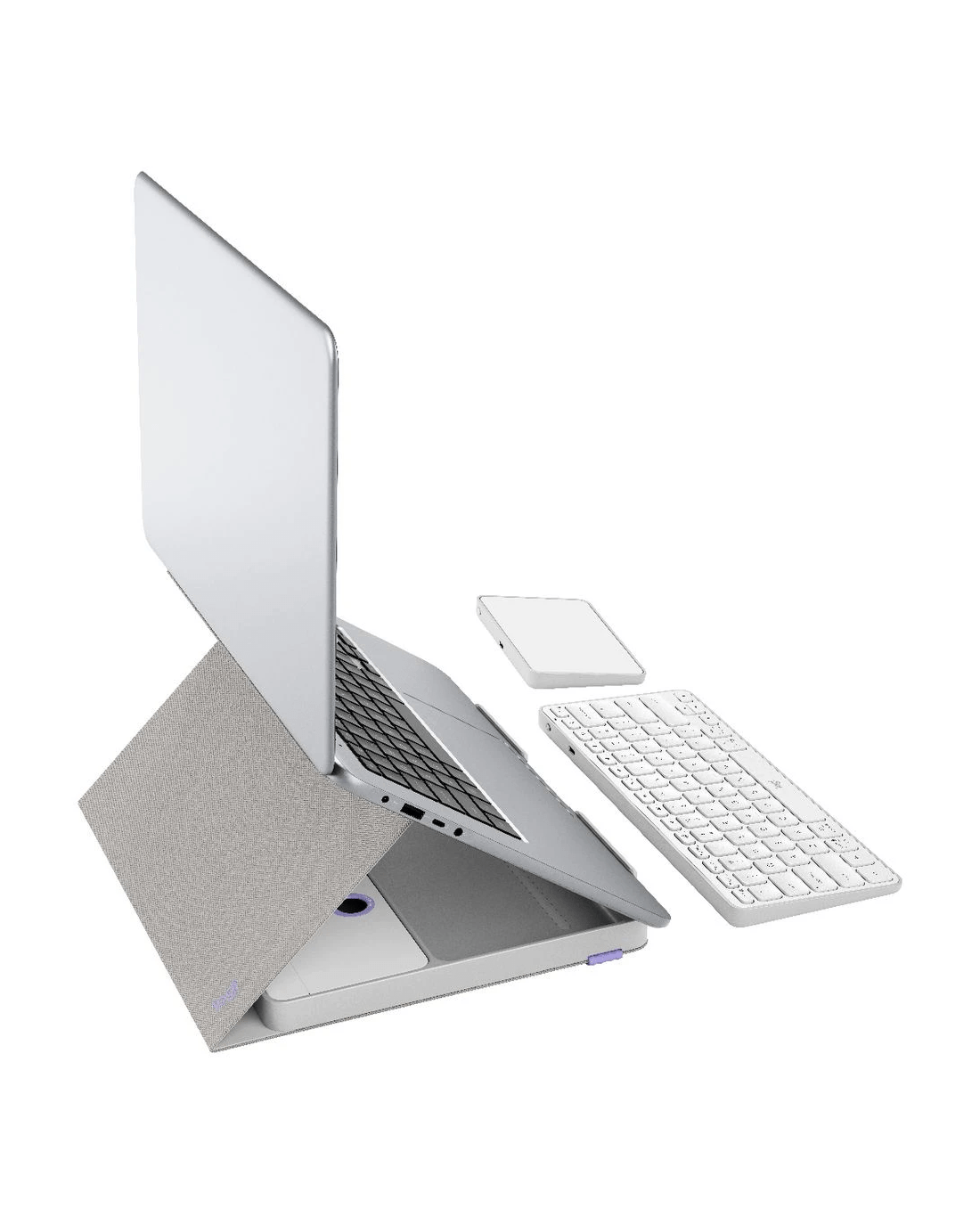 - The book-like case unfolds into an ergonomic laptop stand, raising your screen to eye level for noticeably better posture, however long you need it.
