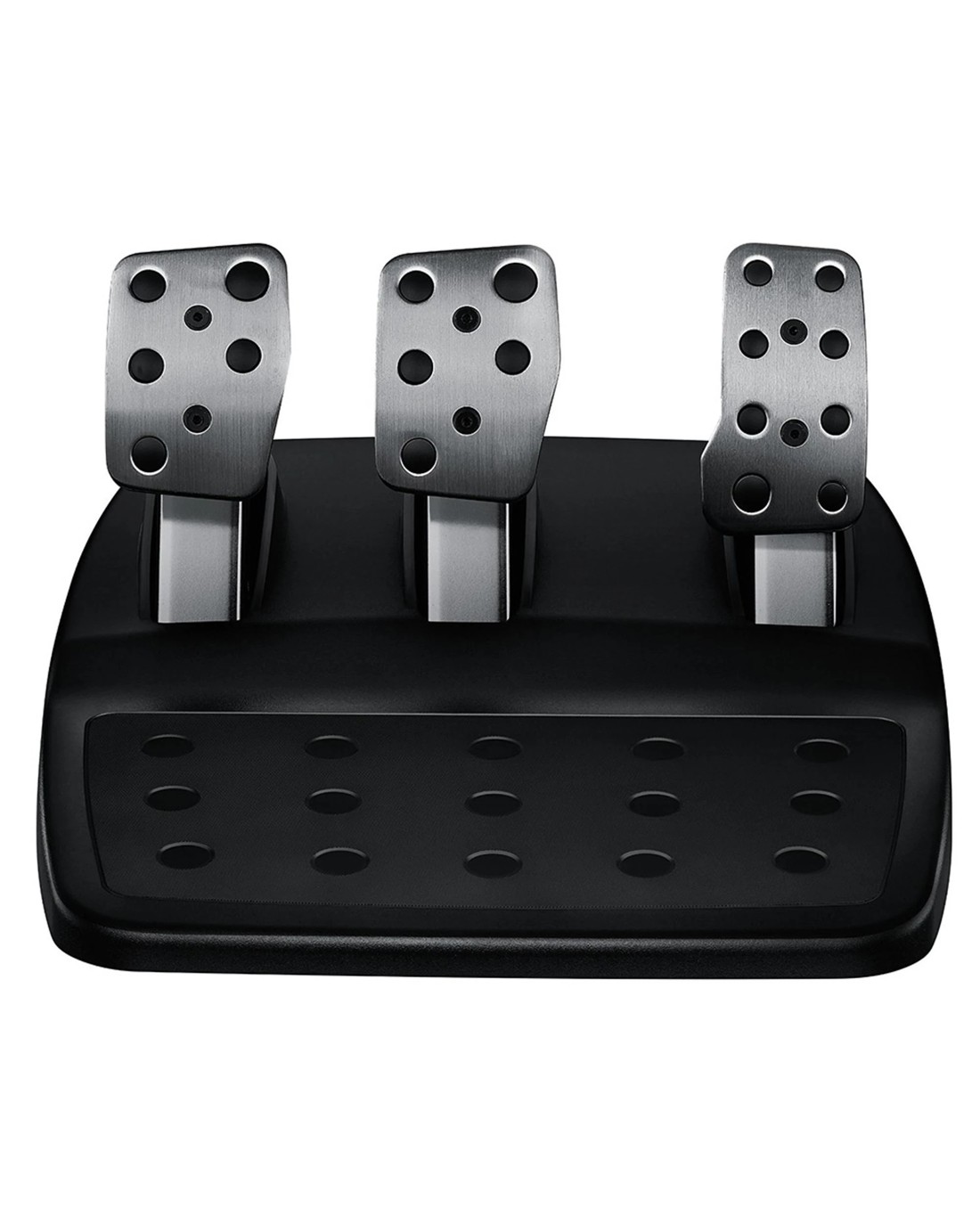 Immersive driving simulation comes to life in the details. Dual-motor force feedback makes you feel every tire slip and terrain change. Solid steel ball bearings in the wheel shaft give weight and durability. Stainless steel paddle shifters and floor pedals apply precision force. Hand-stitched leather covered wheel makes every car luxury. Helical gearing delivers smooth, quiet operation.