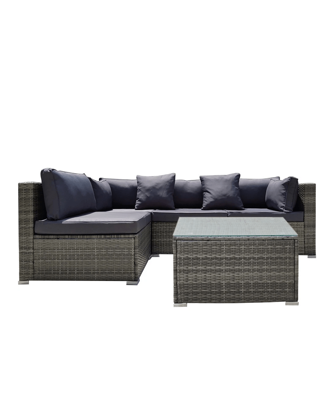 The set includes ultra-comfy 8cm thick water-resistant seat cushions, generous backrest cushioning and two throw cushions. The high-quality UV-resistant handwoven Suntech wicker in Marl Grey weave has a premium natural textured look. This a modular design comprising 2 sofas, two corner sofas, plus a coffee table with tempered glass table top. You can set it up in whatever configuration works best for you, making this London Rattan outdoor lounge setting a great addition to any outdoor space.