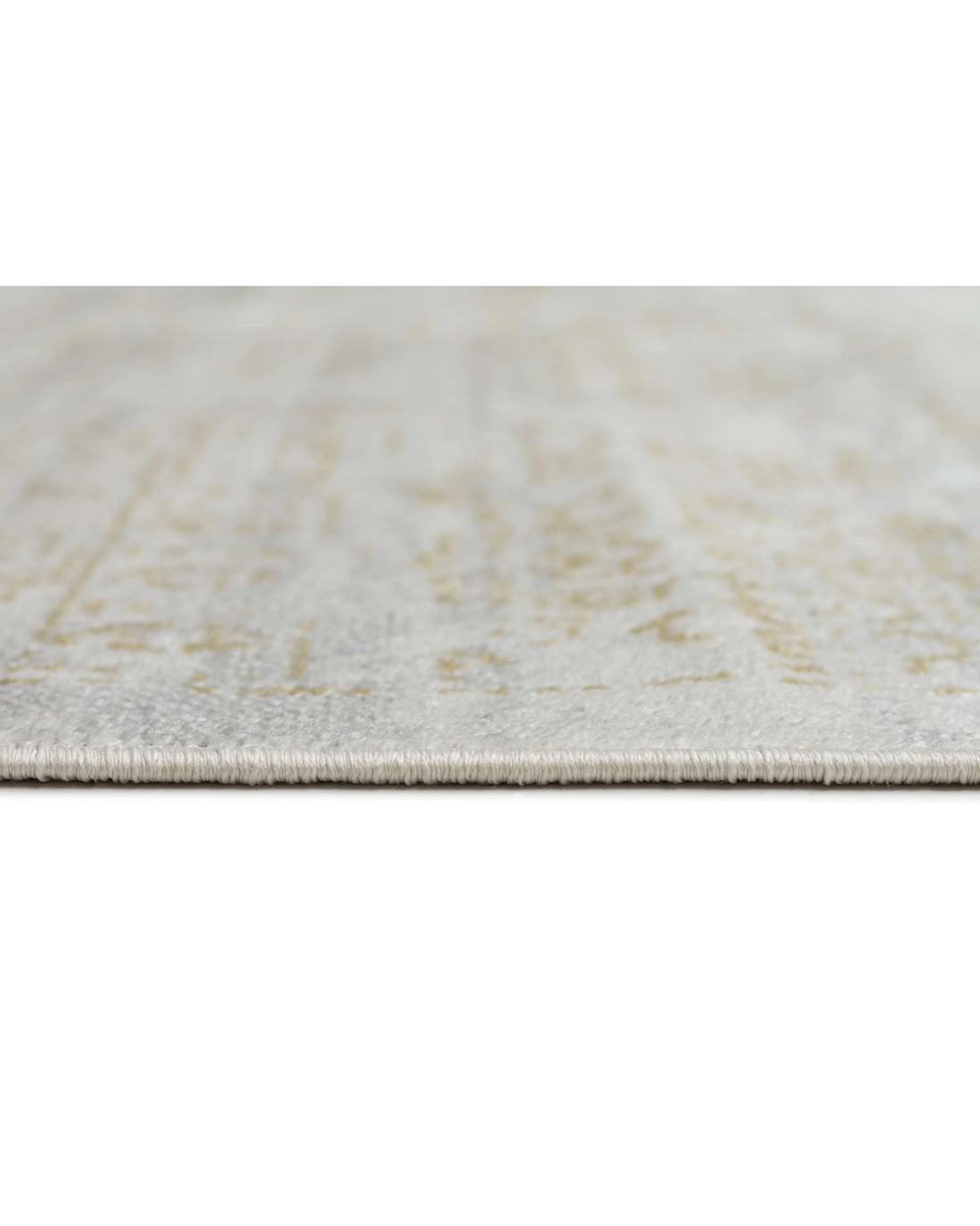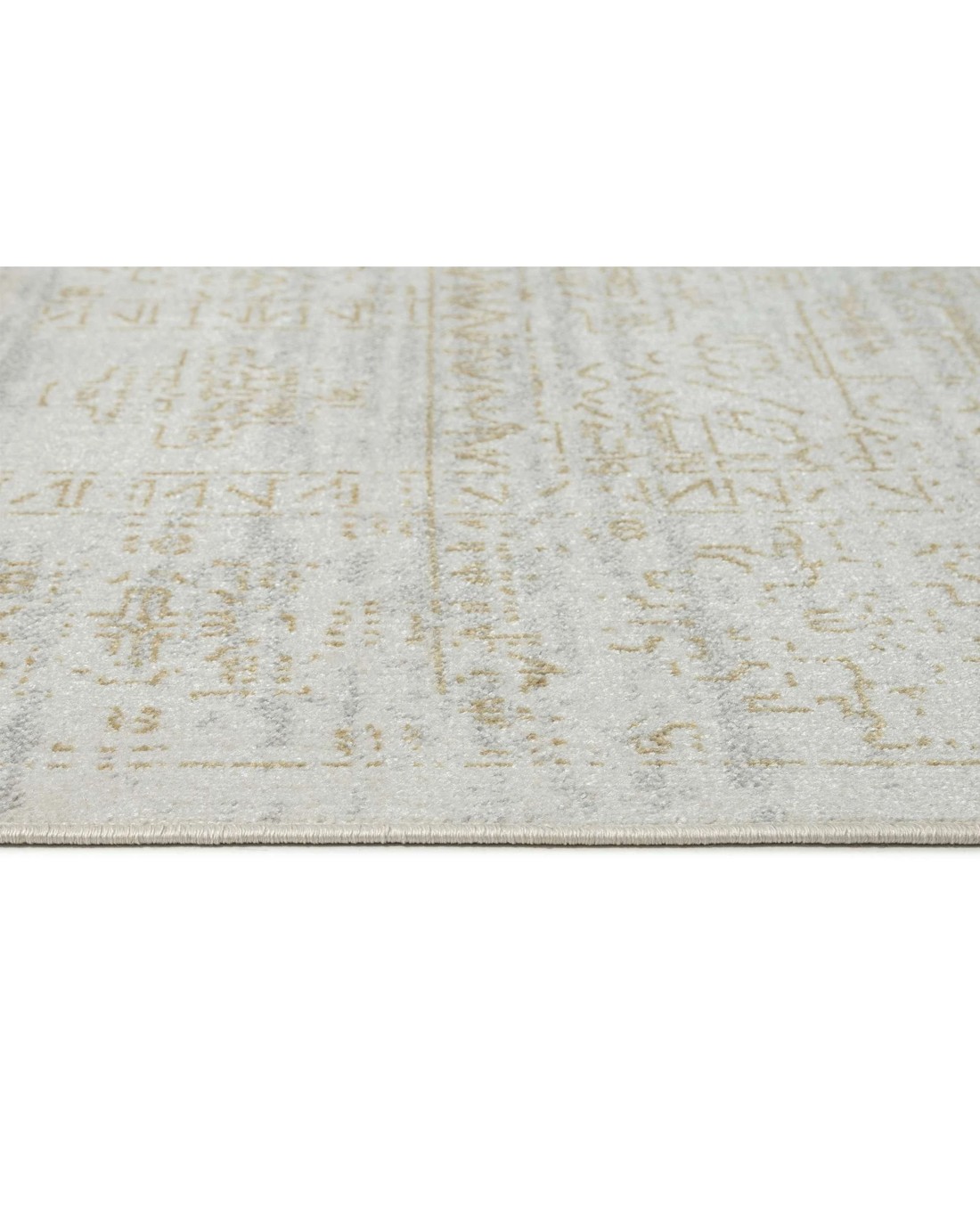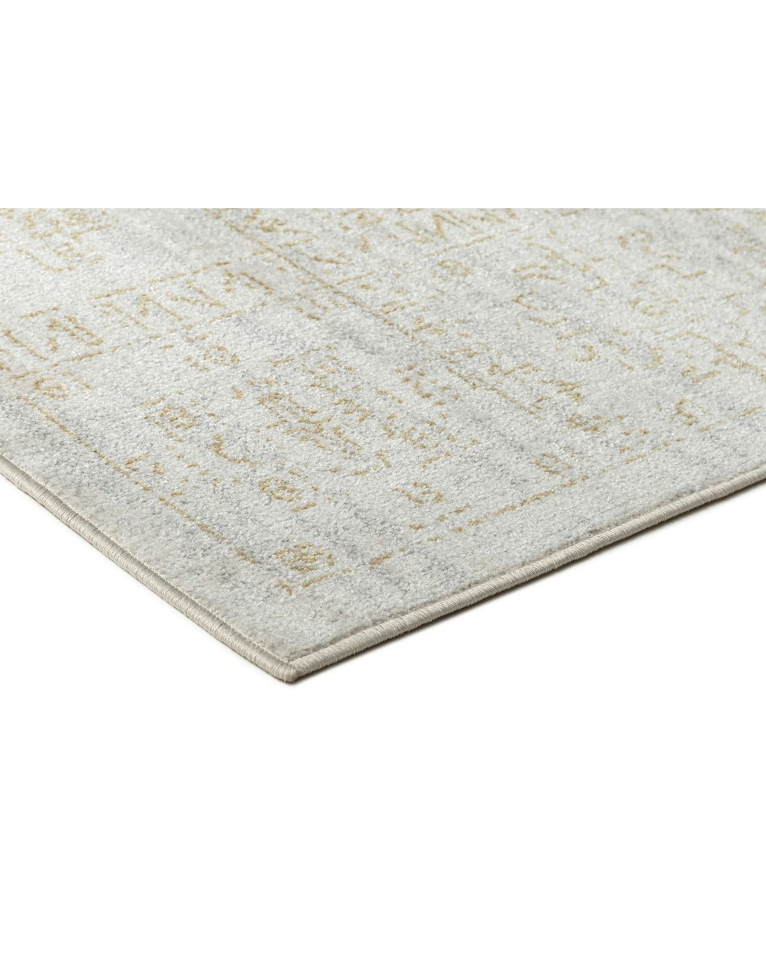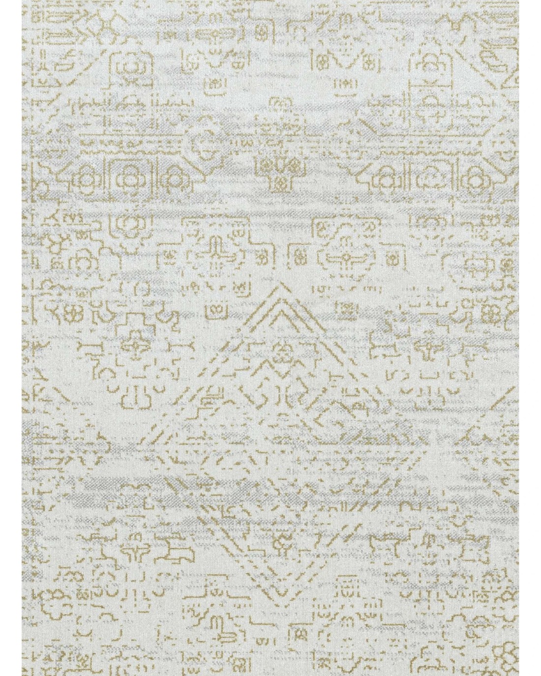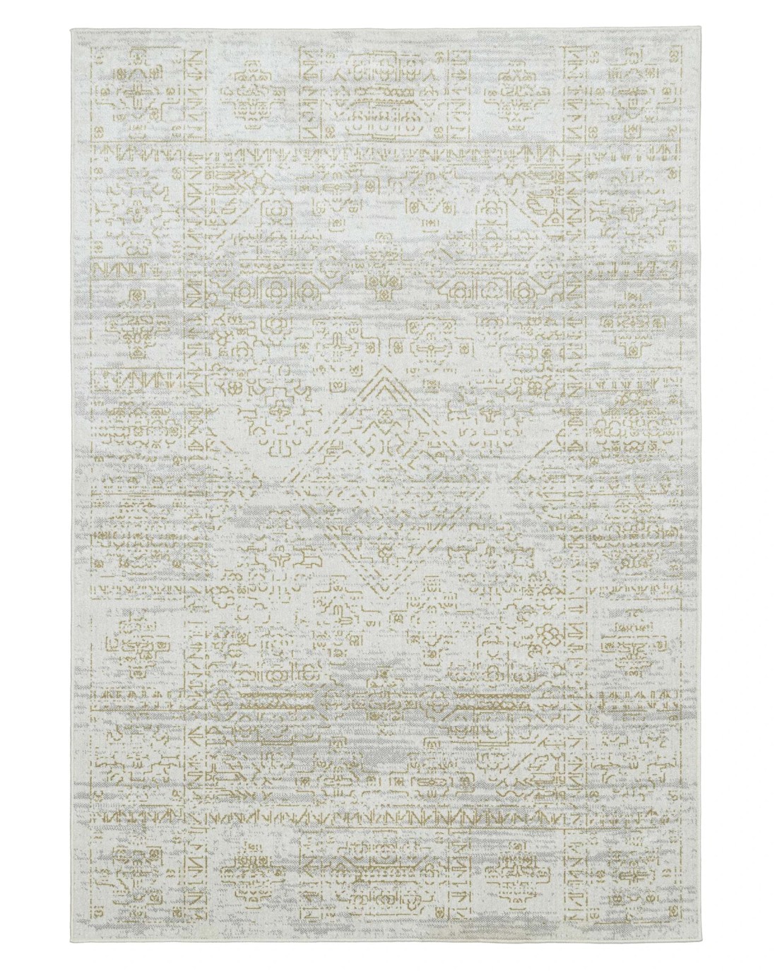 Andalen is a silky soft machine washable and foldable rug with a grey cream based background with hints of gold bronze tones in a distressed vintage tribal design.