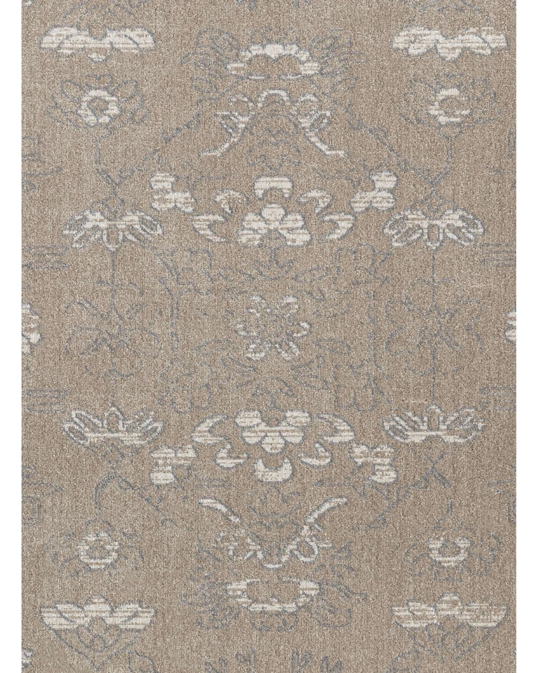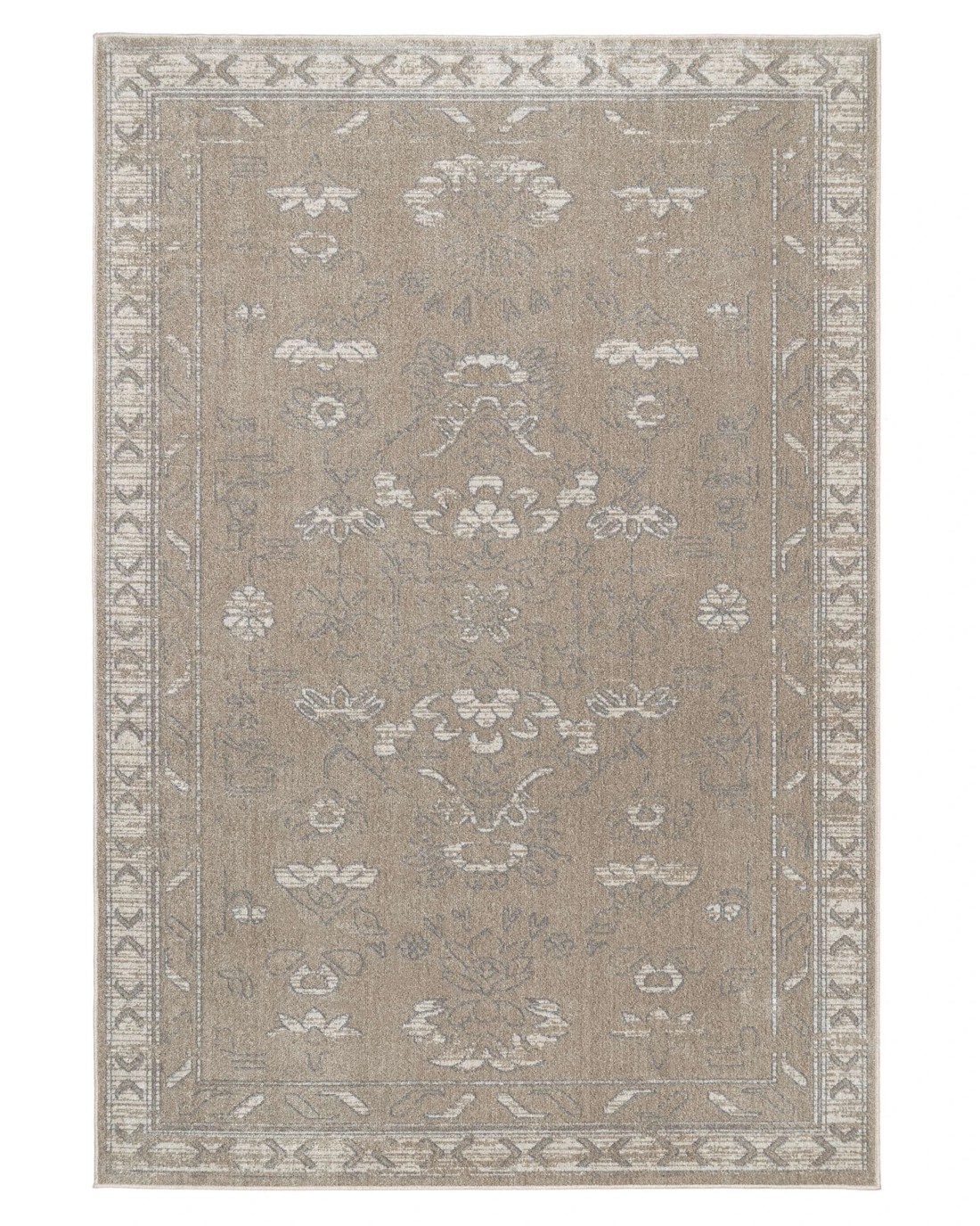 Hagastrom is a silky soft machine washable and foldable rug with a grey taupe based background with hints of grey tones in a distressed vintage traditional design.