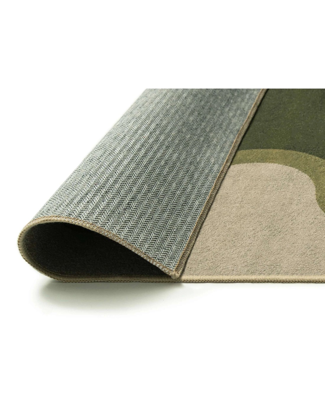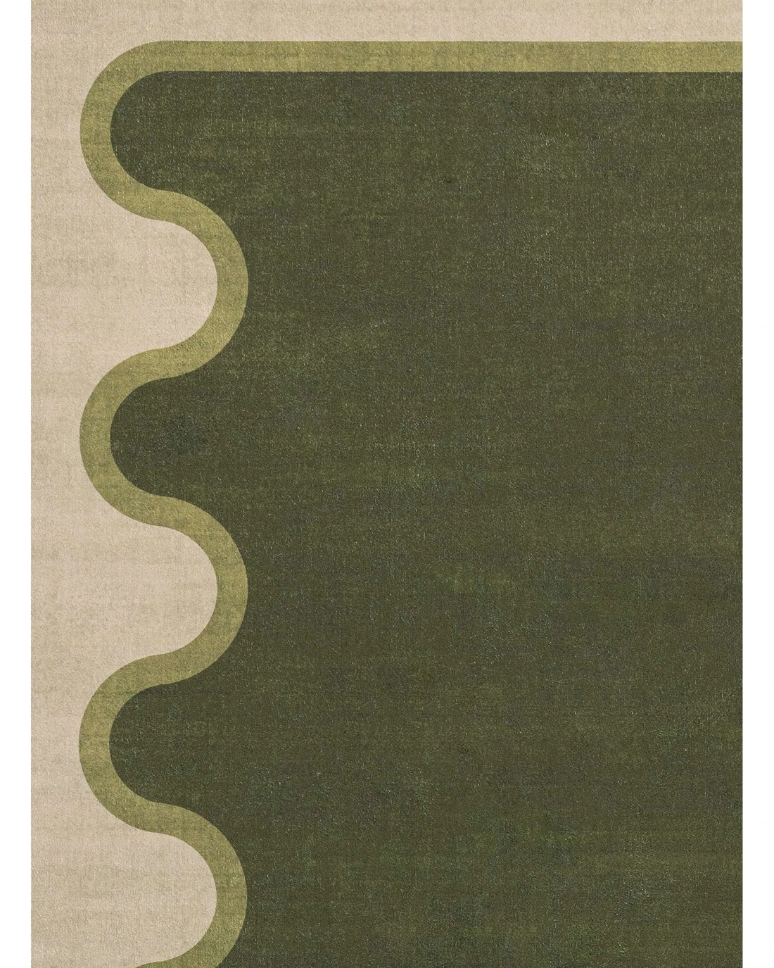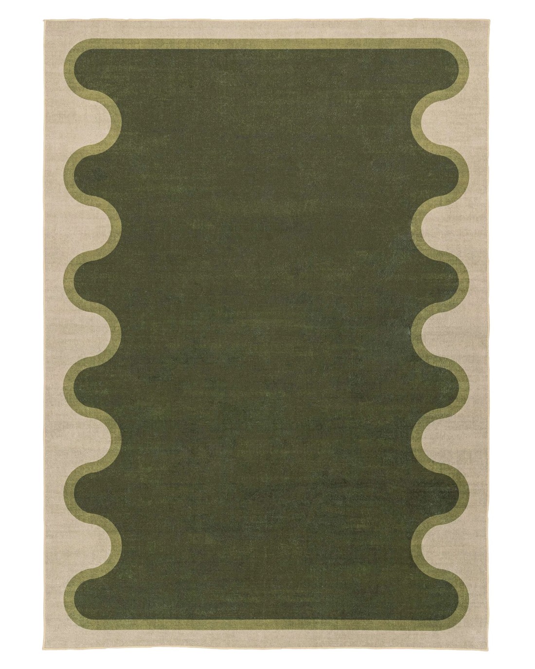 Kumu is a beige and green smooth machine washable and foldable flatweave rug, with a modern curved border design. A versatile and timeless addition to any space.