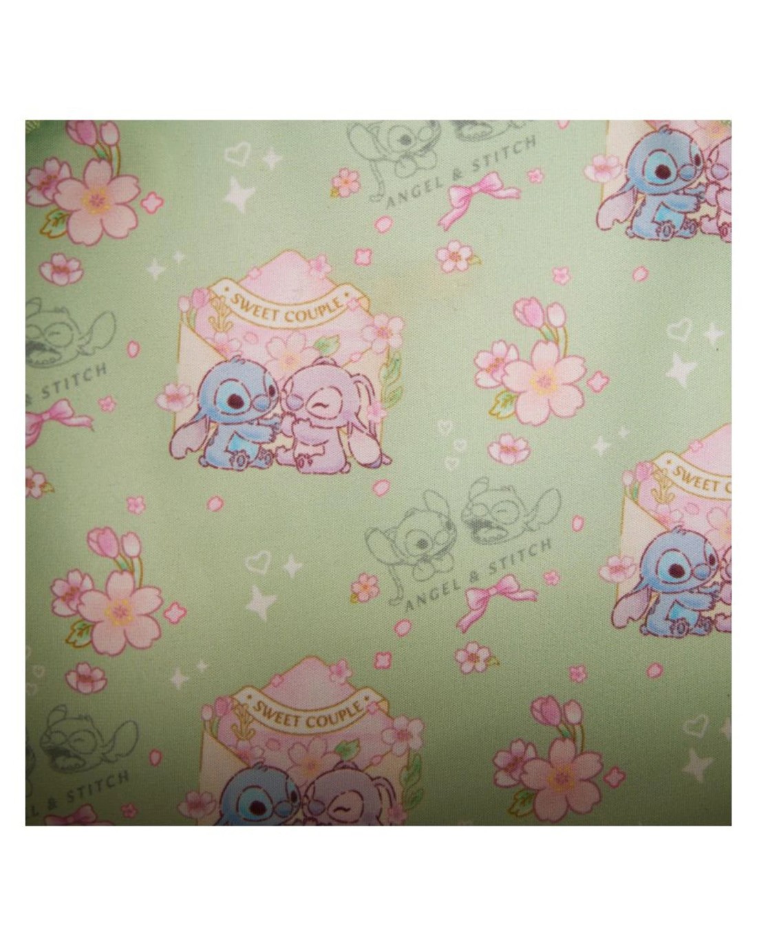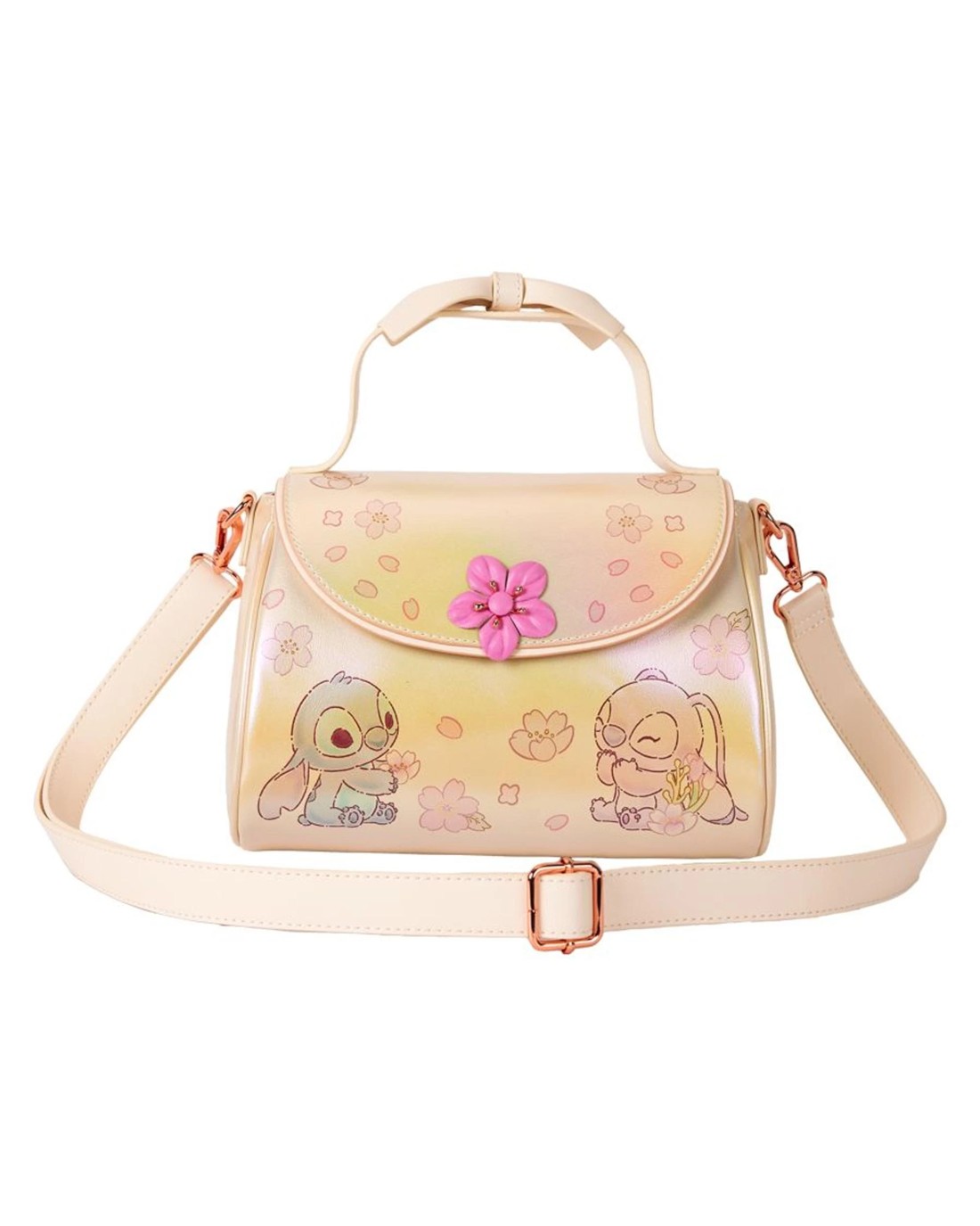 Keep your best boojiboos forever (BBFs) close with a fashionable flair. Take along this Disney's Stitch and Angel crossbody bag. Iridescent detail makes this accessory shimmer. On the front, a sweet moment between Stitch and Angel unfolds among the flowers. The 3D cherry blossom snap on the front adds a charming touch. There's enough room for packing just what you need for a fun-filled day of enchanting adventures.