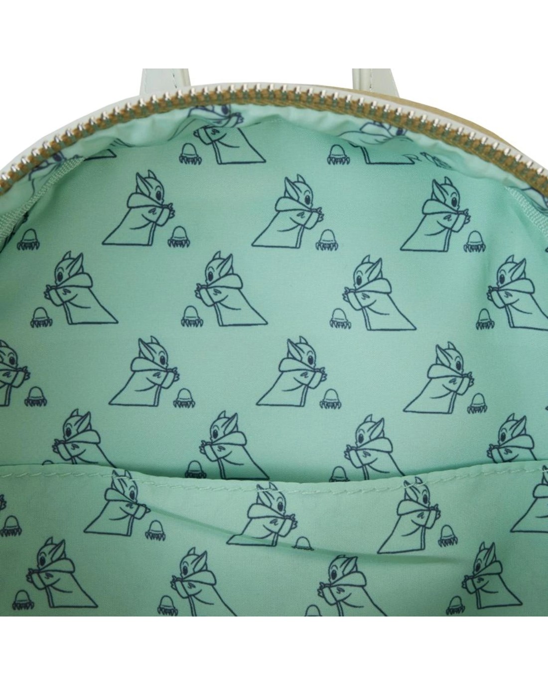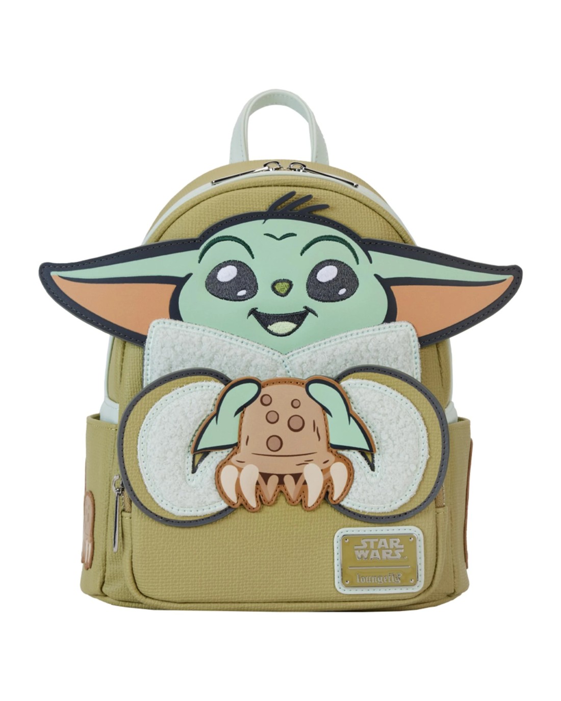 This tiny Force user is always looking to make new friends! On the Loungefly Grogu and Crabbies Cosplay Mini Backpack, Grogu smiles with oversized ears and embroidered details to highlight his facial features. The collar and sleeves of his coat are lined with a fuzzy sherpa material, giving him a cozy look for extra cuteness. Grogu holds a crablike creature on the front zipper pocket, and you'll find more of his crab friends on the bag's side pockets and back. This mini backpack makes an adorable addition to any outfit and will keep your cargo safe as you travel the galaxy.The Loungefly Grogu and Crabbies Cosplay Mini Backpack is made of vegan leather (polyurethane). Bag has adjustable shoulder straps and shiny silver hardware. Additional features include applique, debossed, embroidered, sherpa, and printed details. Take note of the coordinating inside lining.