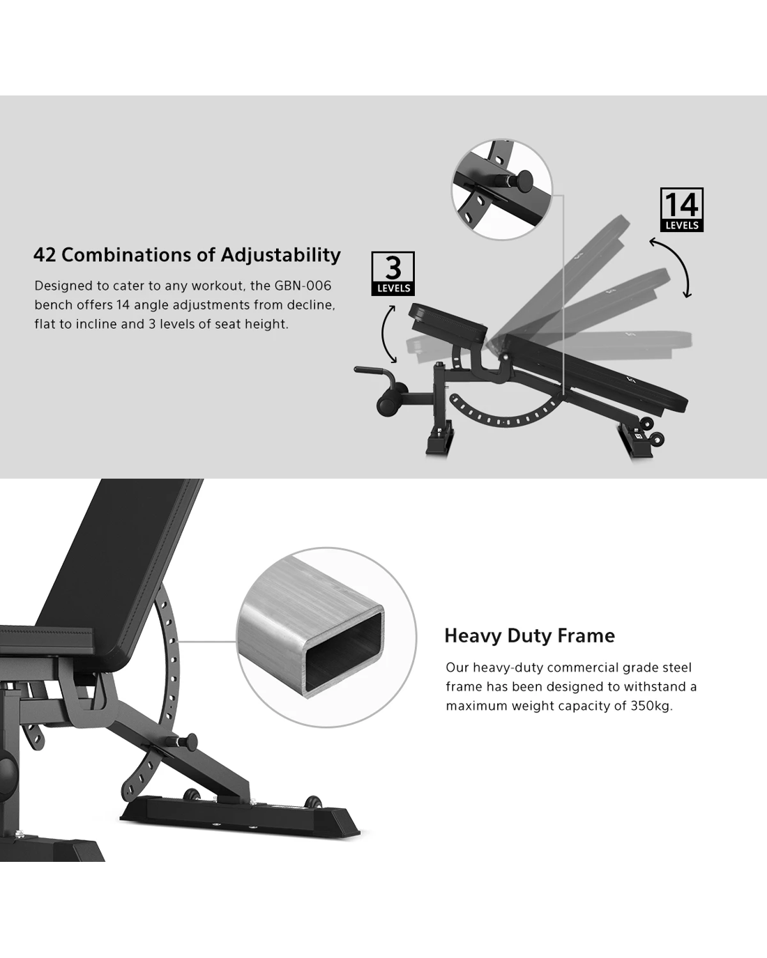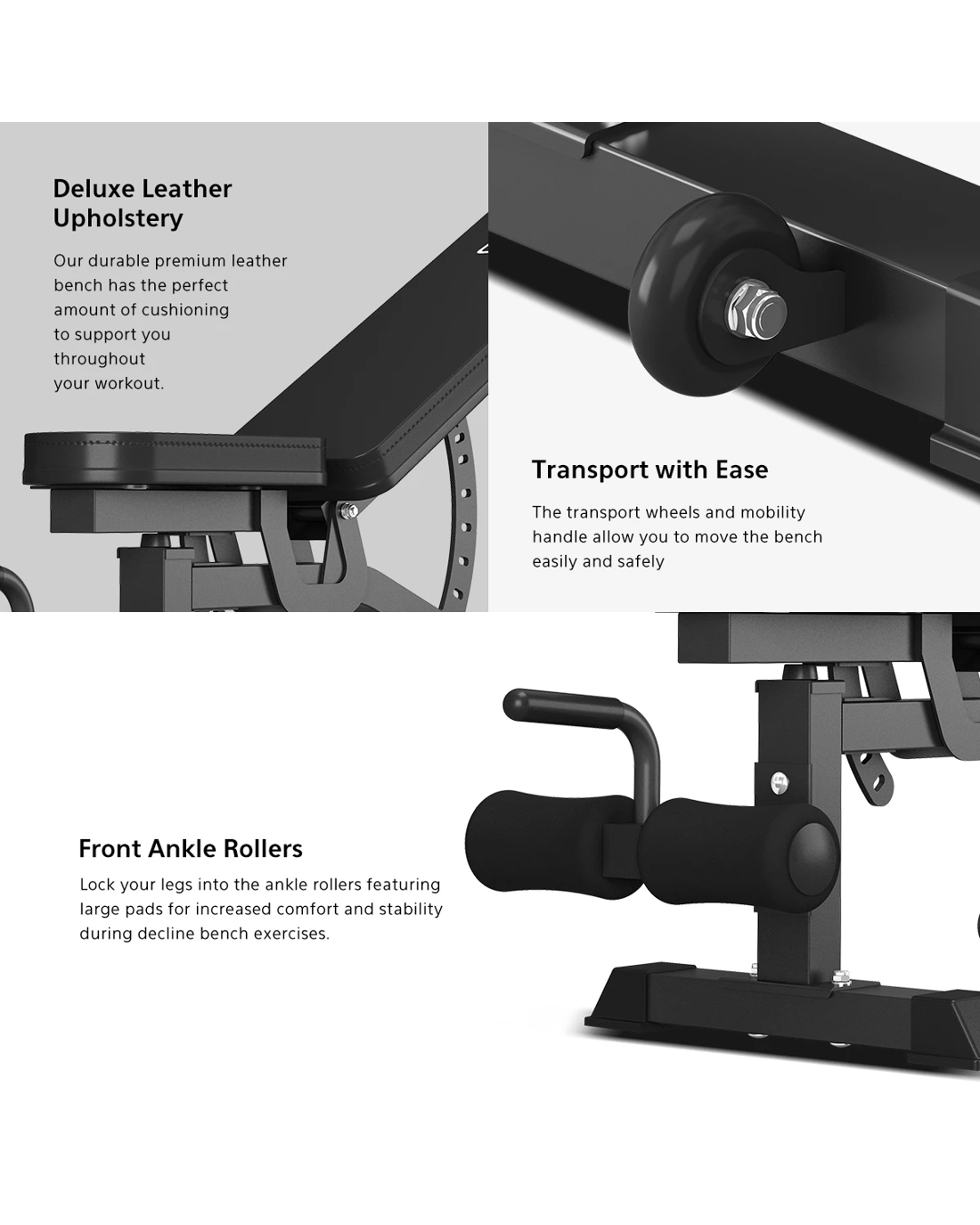 Getting the right support from your workout is key to maximizing performance. Our heavy duty GBN-006 FID Bench works to customise your workout with 3 levels of seat height adjustment and 14 angle settings. For increased support throughout decline bench exercises, lock feet into the padded front ankle rollers. Manoeuvre the bench with ease using the mobility handle and transport wheels.