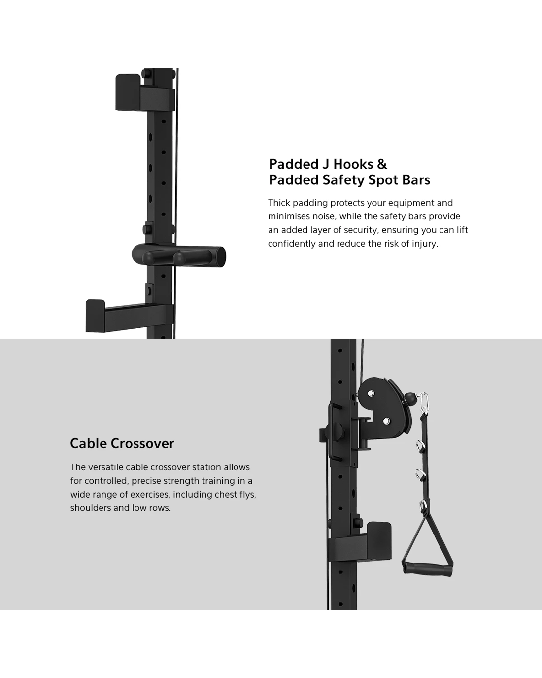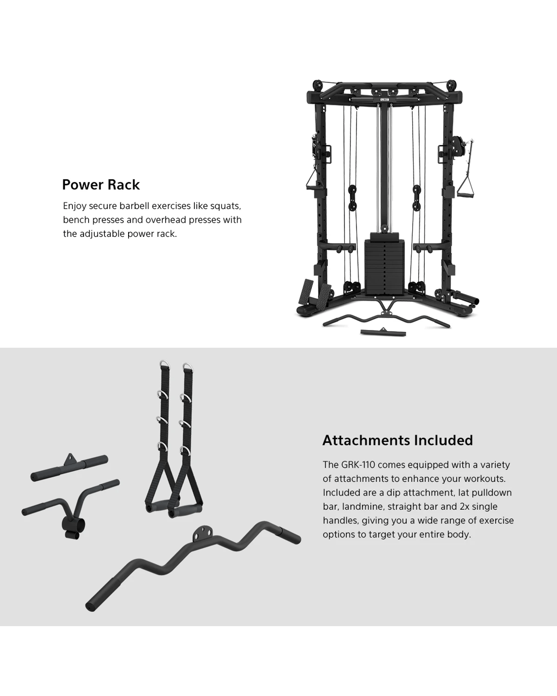 The GRK-110 is the ultimate all-in-one workout solution for those who want to maximise their fitness potential without sacrificing space. Built with durable 17-gauge steel tubing and tensile strength aircraft cables, this rack is designed to handle intense workouts while providing smooth, reliable performance. Enjoy a comprehensive range of workout options including cable crossover, power rack, chin-ups and landmine for a truly next-level home strength workout.