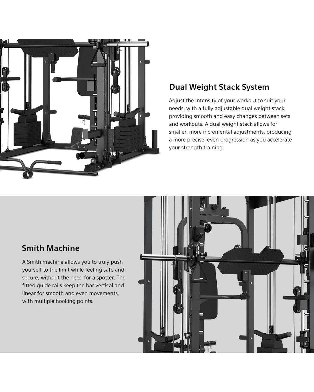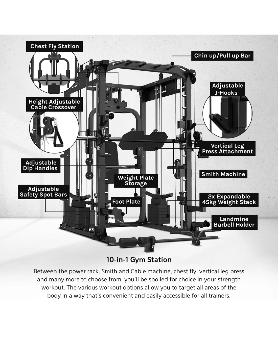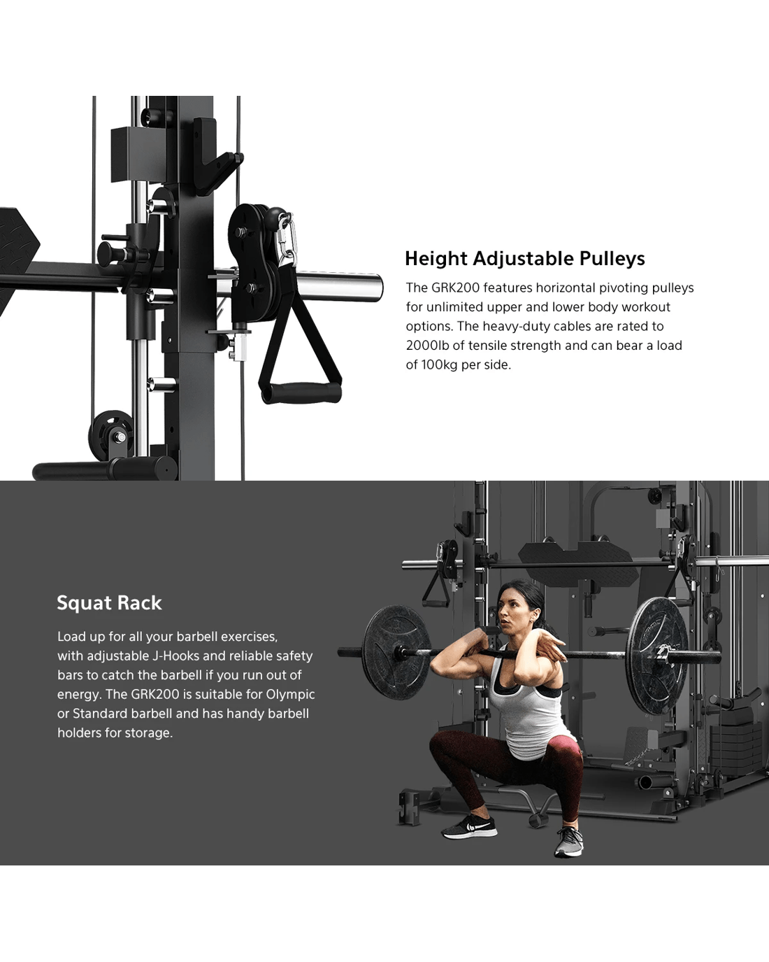 Everything you need and more for the perfect strength training routine right in your own home. The GRK200 All-in-1 Home Gym Station boasts an extensive range of exercise possibilities, with Smith and Cable machine, power rack, chin-up bar, barbell landmine and much more. With easy to adjust weights, barbell holders and multiple attachments options included, the GRK200 will invigorate your strength training to new levels. Full adjustability allows for individuals of any fitness level to take advantage of the massive benefits the GRK200 has to offer, all with advanced safety features and a durable steel frame, allowing you to feel safe and secure as you elevate your personal fitness.