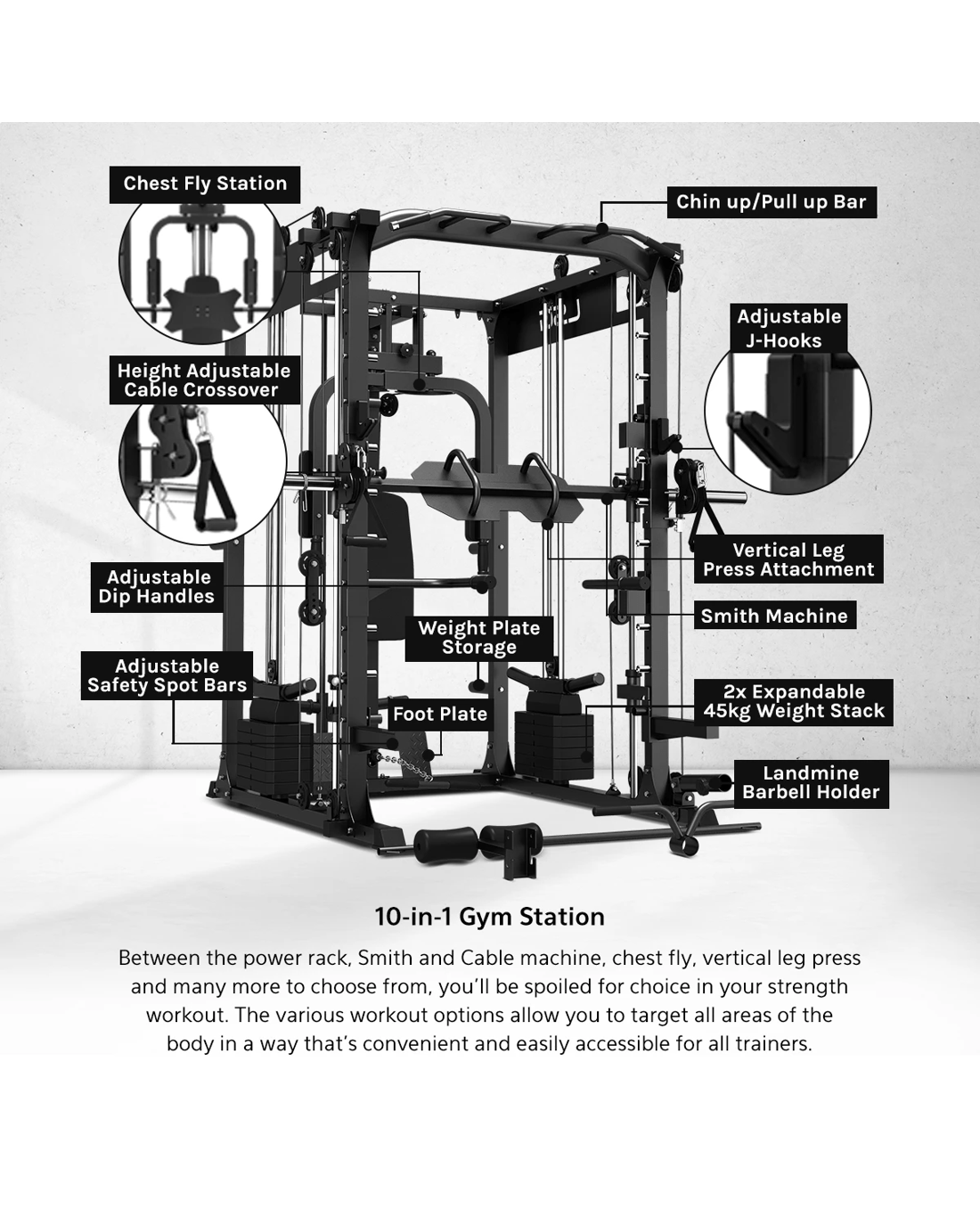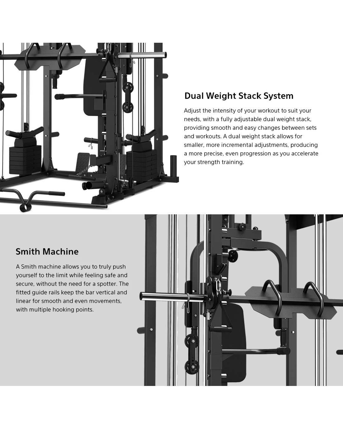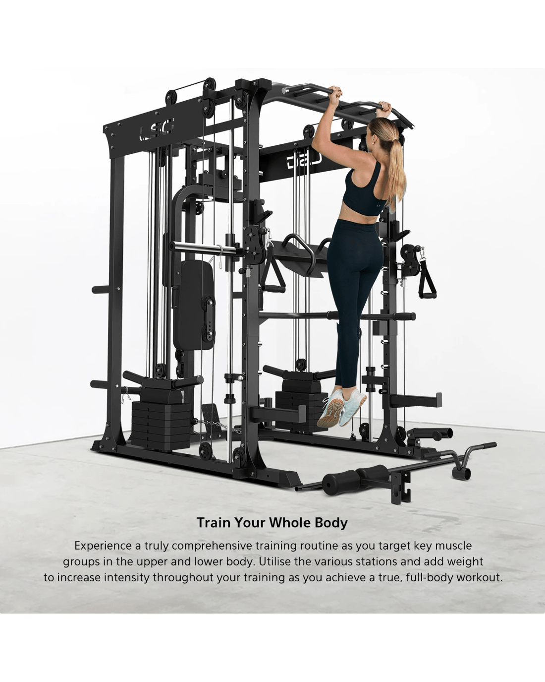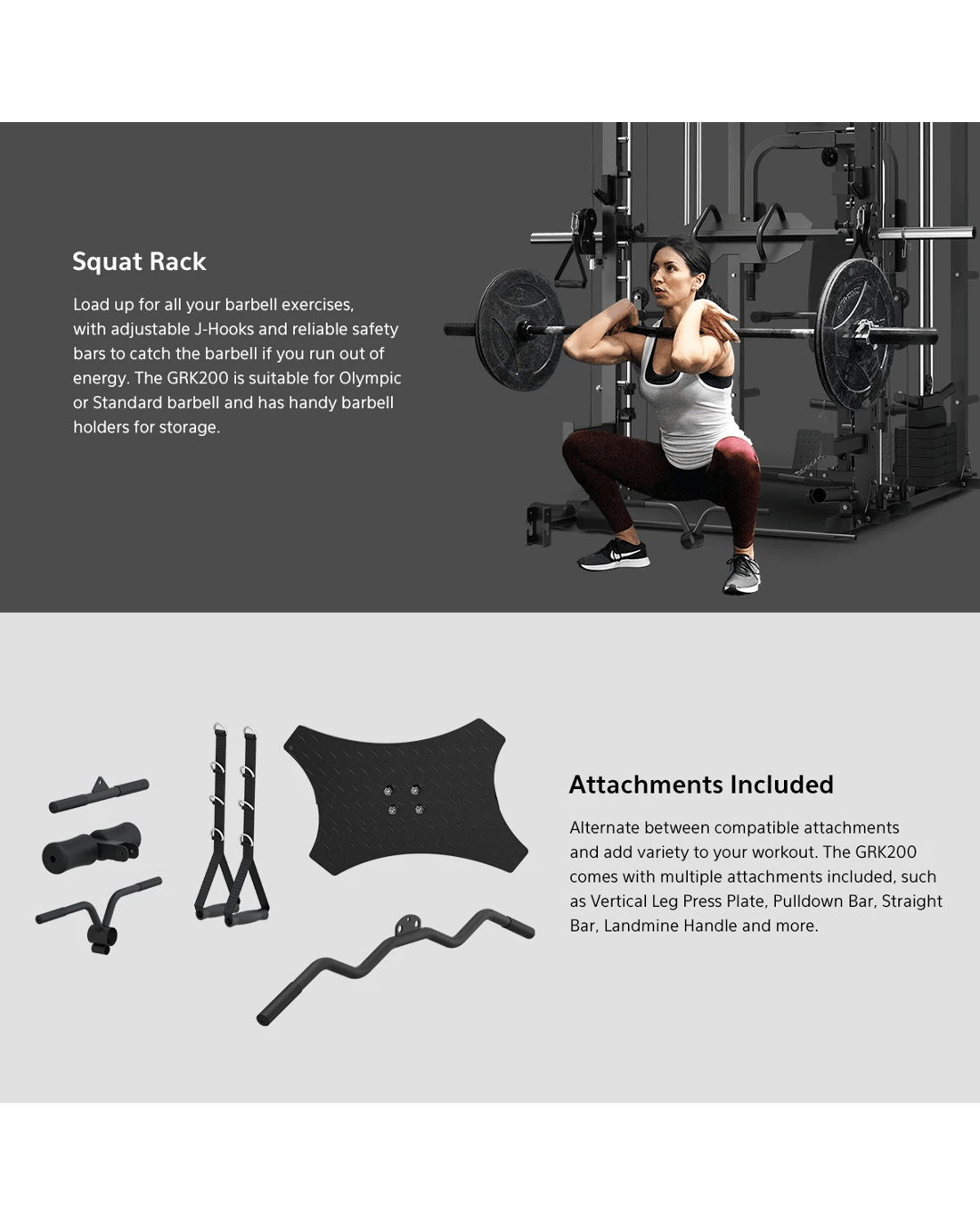 Everything you need and more for the perfect strength training routine right in your own home. The GRK200 All-in-1 Home Gym Station boasts an extensive range of exercise possibilities, with Smith and Cable machine, power rack, chin-up bar, barbell landmine and much more. With easy to adjust weights, barbell holders and multiple attachments options included, the GRK200 will invigorate your strength training to new levels. Full adjustability allows for individuals of any fitness level to take advantage of the massive benefits the GRK200 has to offer, all with advanced safety features and a durable steel frame. The set includes a 90kg Olympic Barbell & Bumper Plate Set.