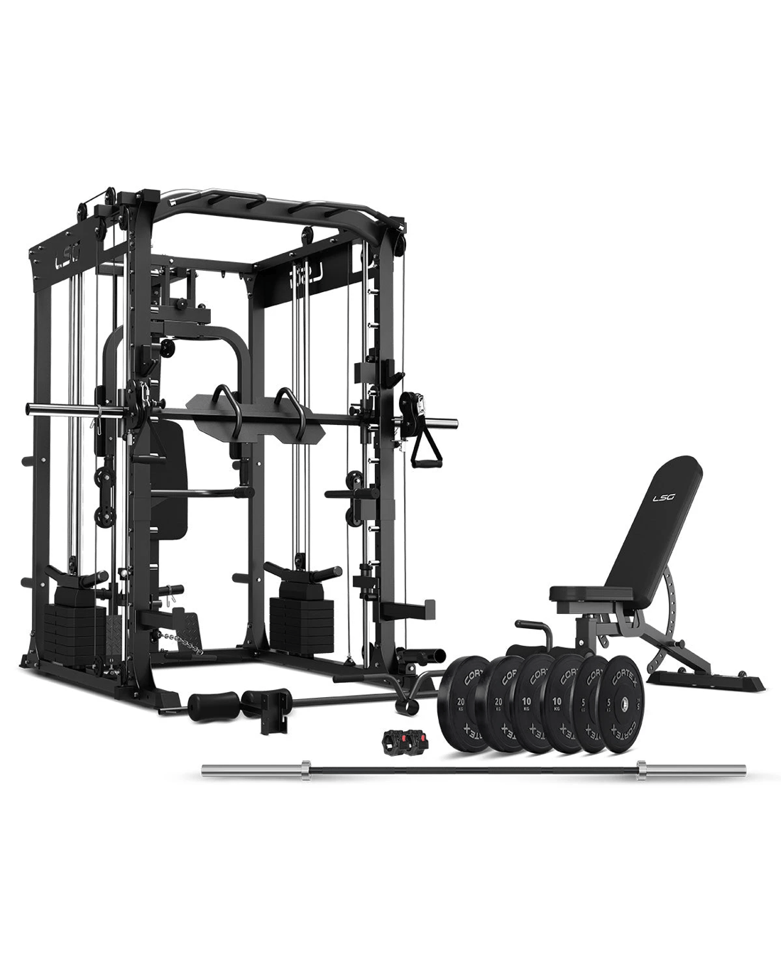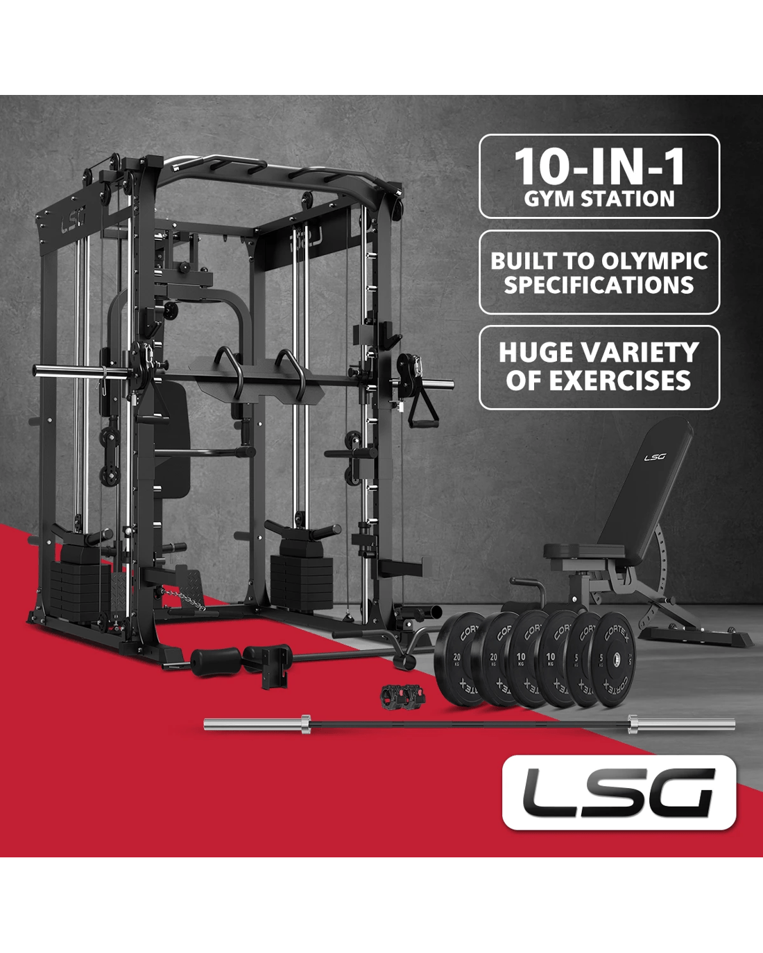 LSG GRK200 Home Gym Station, Power Rack, Smith Machine and Cable Crossover + 90kg Olympic Barbell & Bumper Plate Set