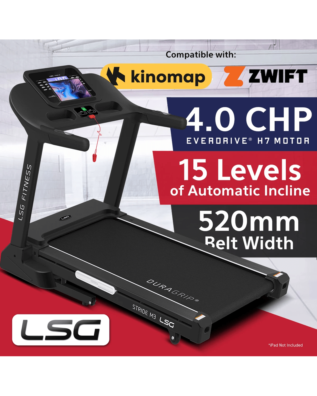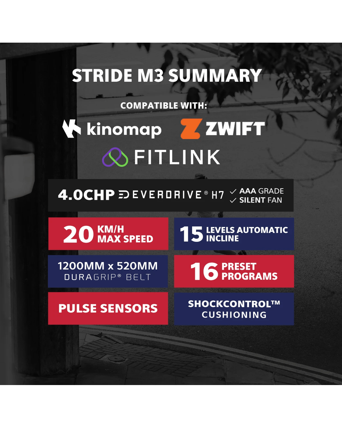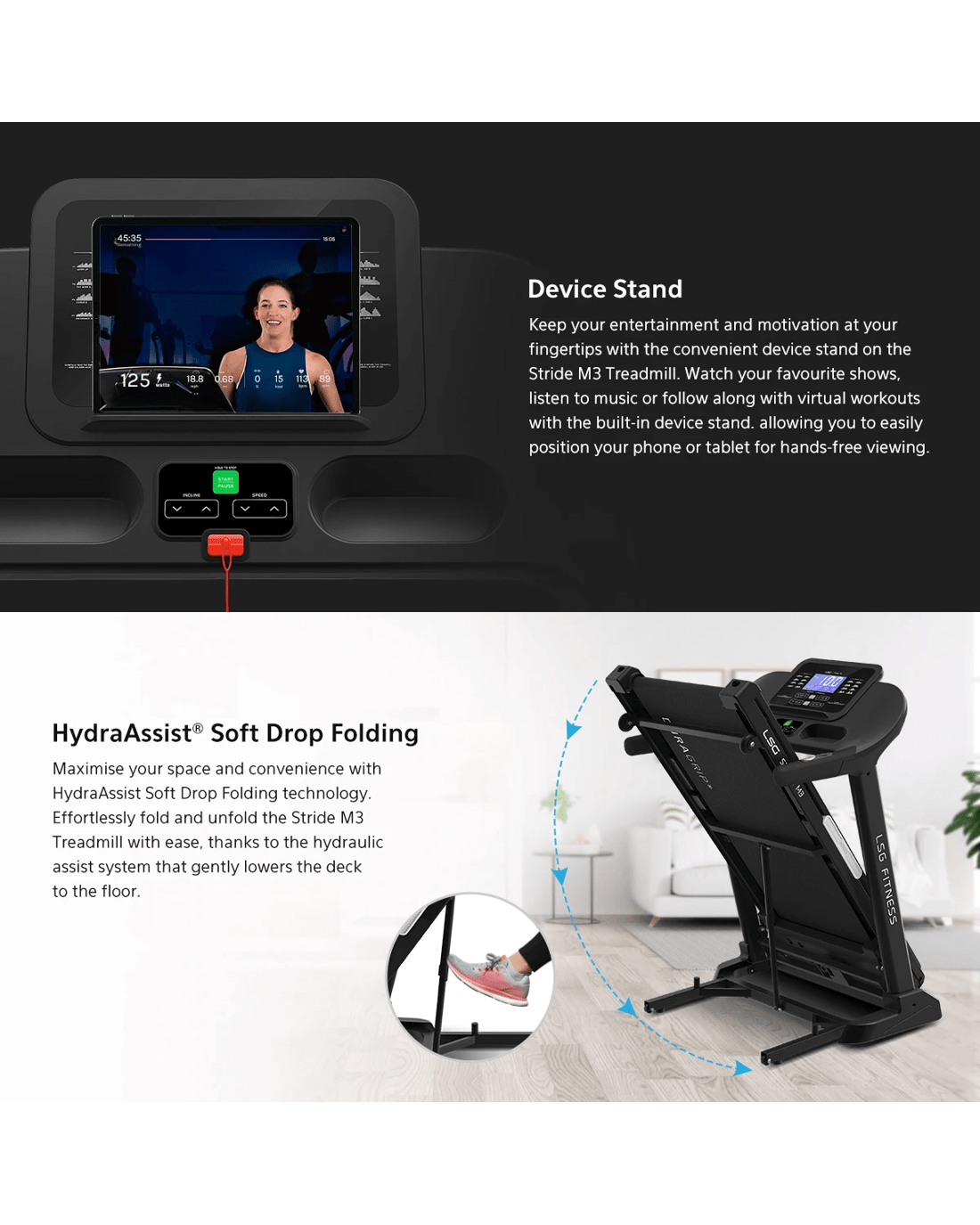 The Stride M3 Treadmill offers a a powerhouse of performance and innovation designed to elevate your home workouts to new heights. The Stride M3 features an extra-large frame, offering even more space to move and thrive. The Stride M3 also comes with an impressive 52cm belt width, providing ample room for comfortable and unrestricted running. Powered by a massive H7 motor, delivering an extraordinary 4.0 CHP (6.0 Peak HP), the Stride M3 ensures smooth and reliable operation, even during the most intense training sessions. With the capability to race up to speeds of 18km and conquer 15 levels of incline, this treadmill offers unmatched versatility and challenge for users of all fitness levels.
