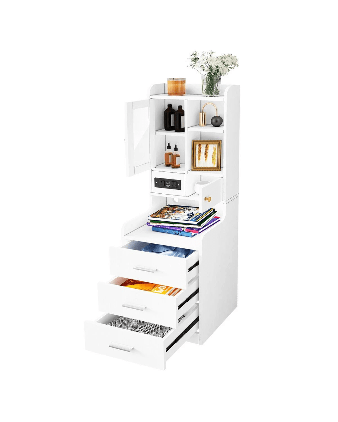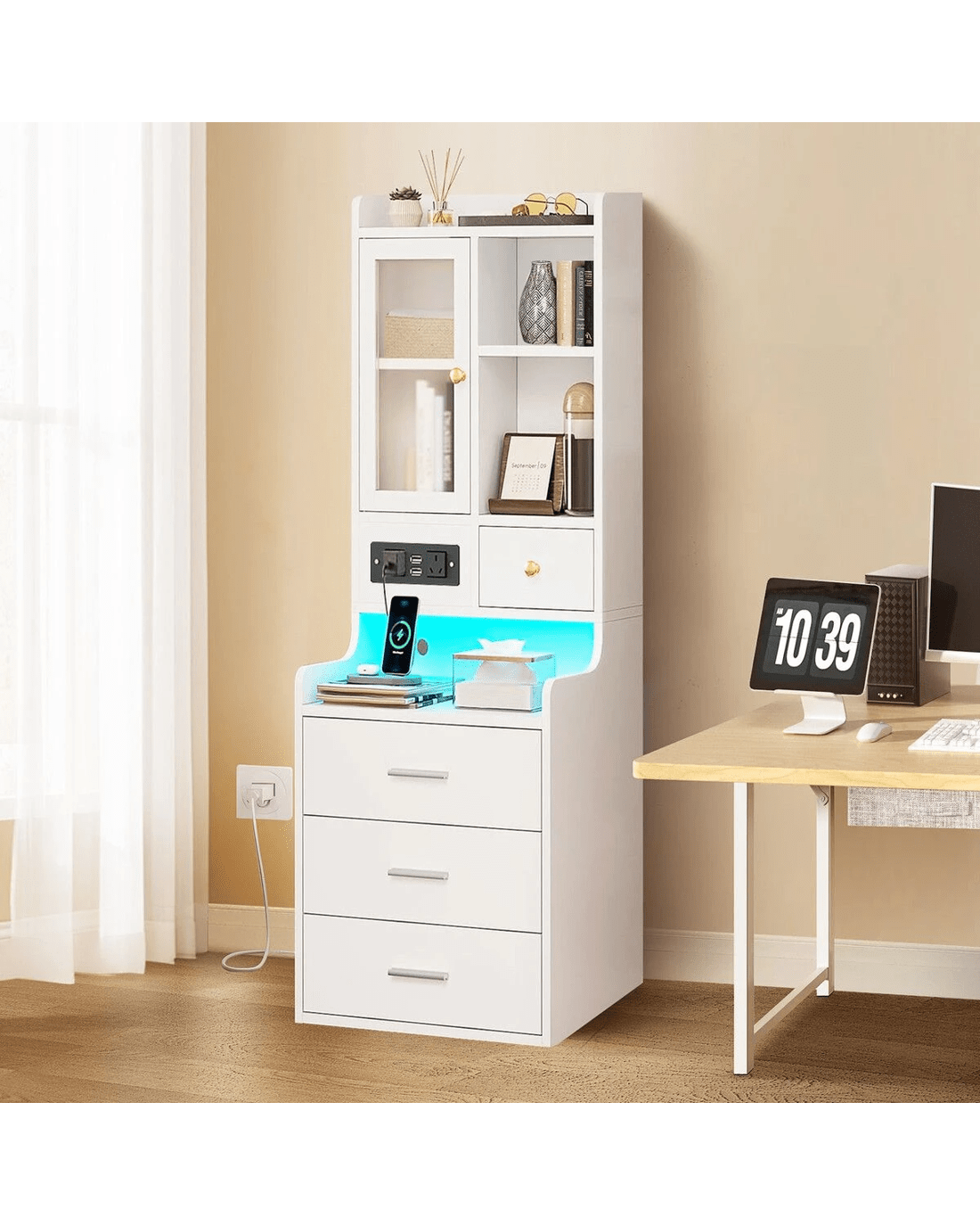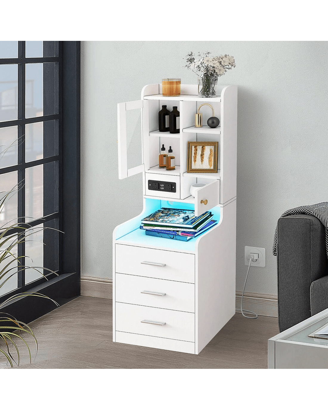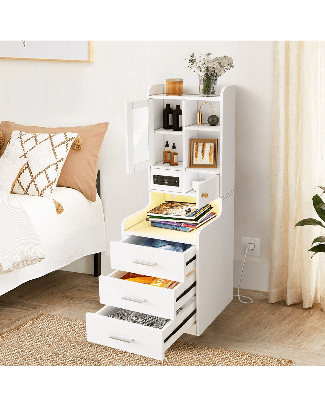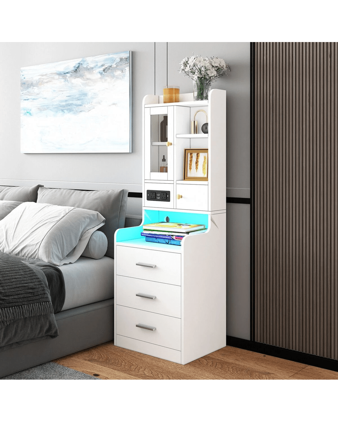 Streamline your nighttime routine with this Bedside Table Bookshelf Nightstand Cabinet. Combining practicality and stylish design, our bedside nightstand offers spacious drawers, open shelving, and a built-in charging station featuring two power outlets and two USB ports, keeping your essentials organised and within easy reach and charging your devices effortlessly. Moreover, the integrated RGB LED light strip allows you to customise brightness, colours, and modes, adding a cosy and ambient atmosphere that enhances your decor. Meanwhile, its sleek design, complete with an acrylic door, blends easily into various spaces, serving as a modern bedside table or a multifunctional end table. With clear assembly instructions and labelled components, setup is quick and hassle-free.
