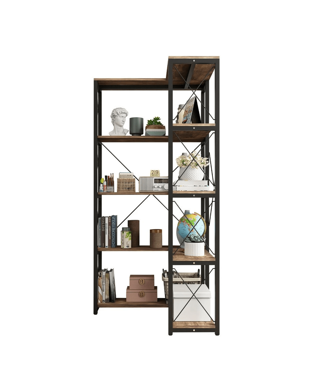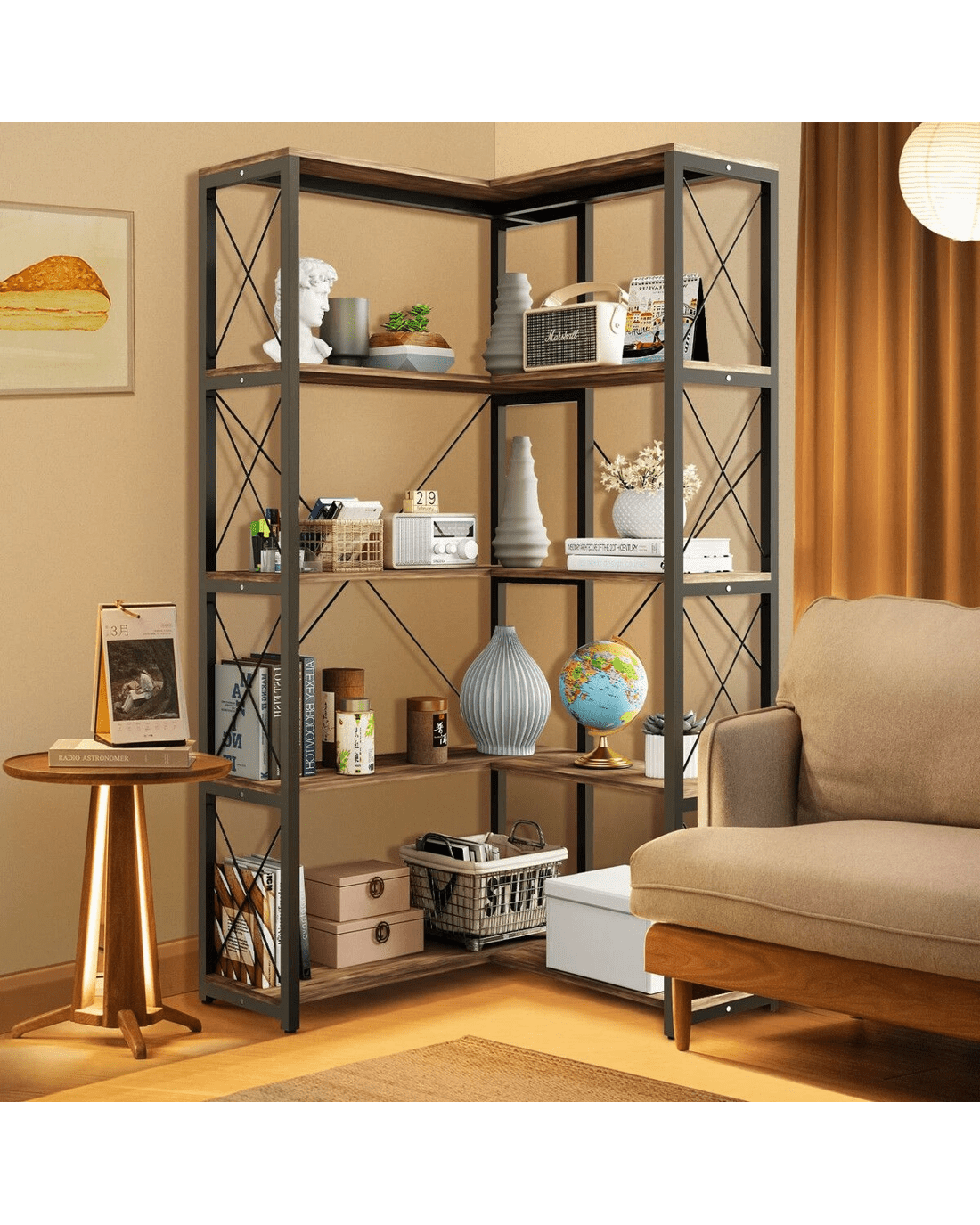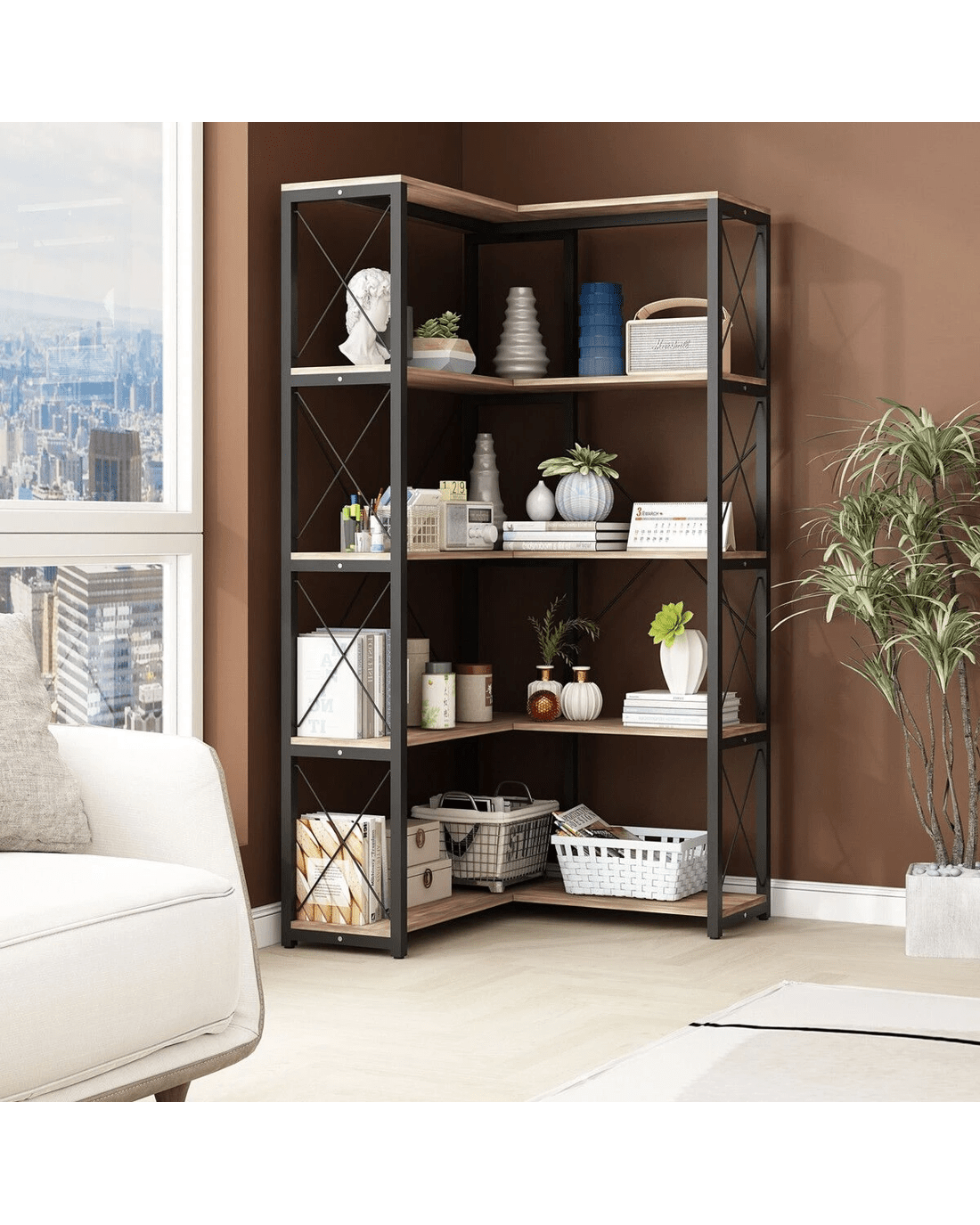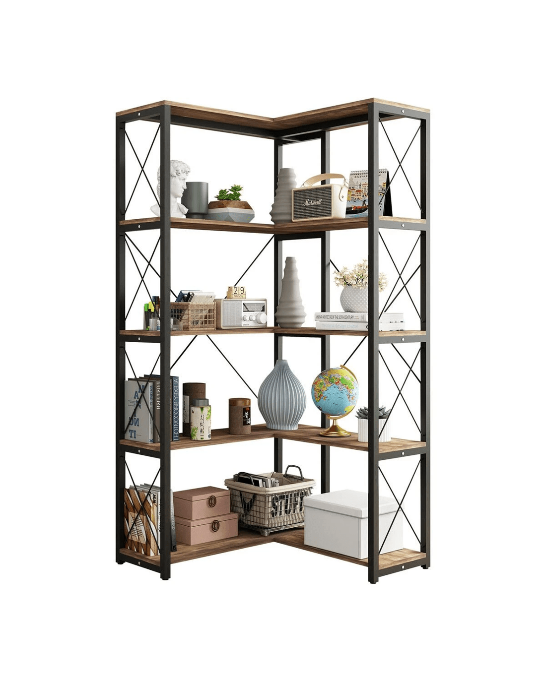 - New Rustic Style: This corner shelf, with a matte black frame and X-bars, seamlessly blends functionality and self-expression, making it a true enhancement for enthusiasts of industrial design furniture. This 4-shelf bookshelf offers an excellent solution for adding extra space to your living room, bedroom, or small apartment