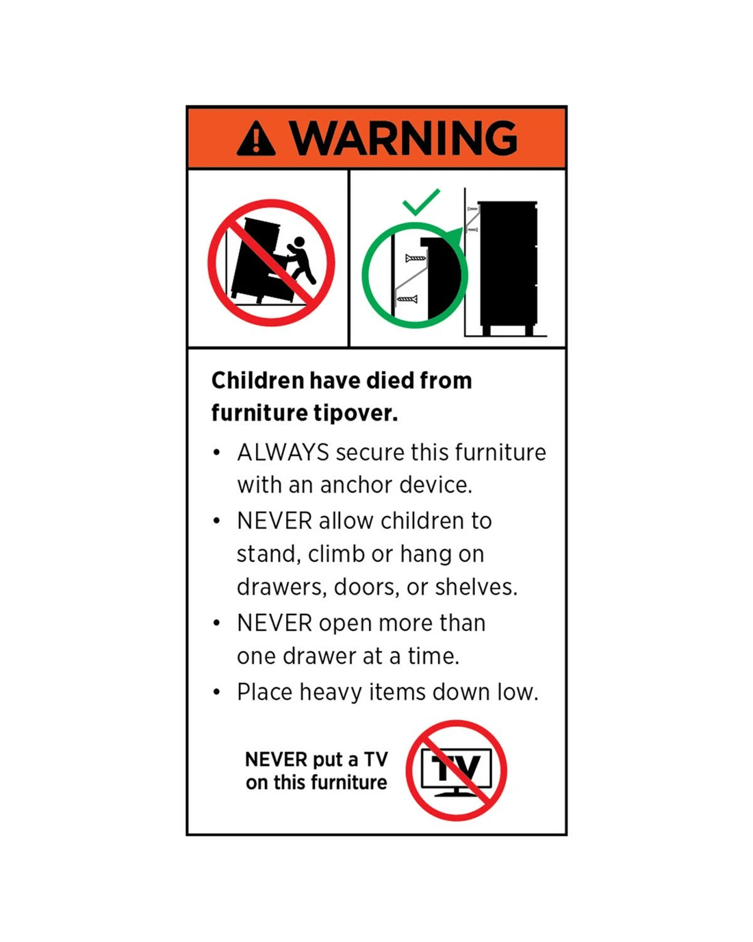 - Never allow children to stand, climb or hang on drawers, doors, or shelves.