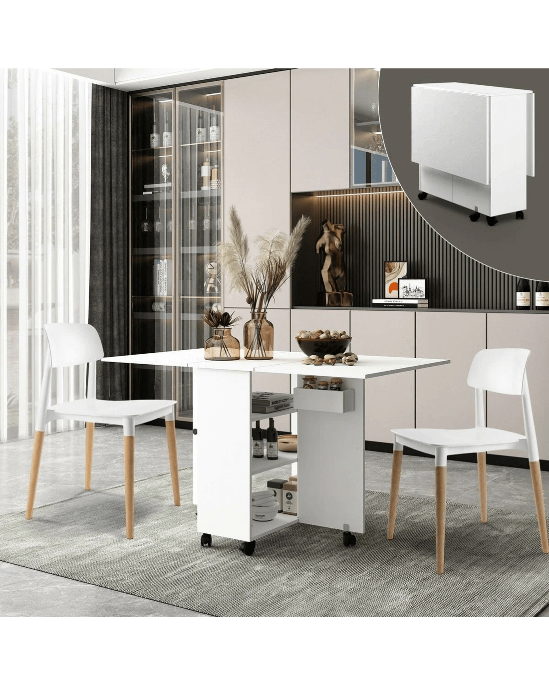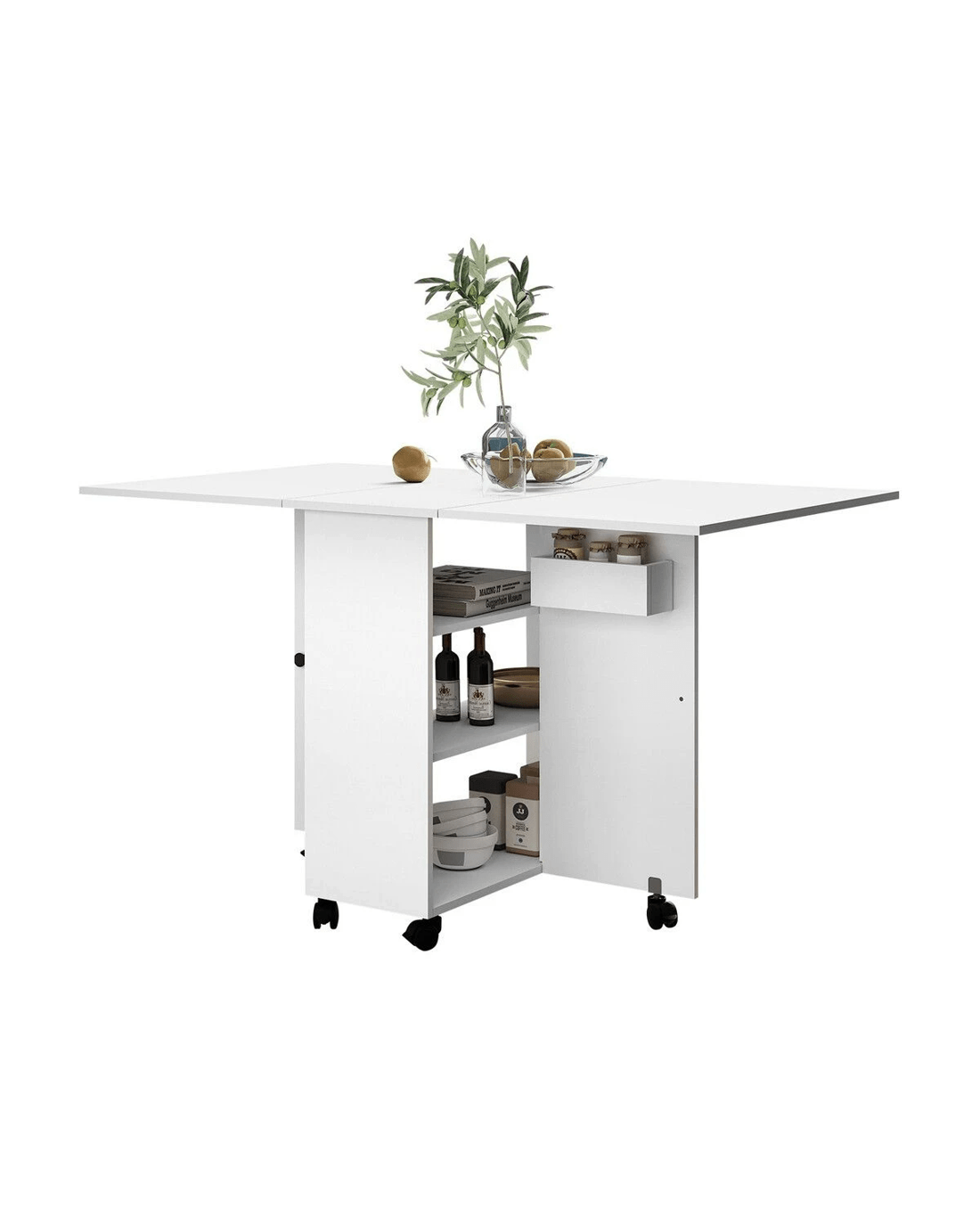 This folding dining room table strikes a balance between versatility and utility. Available in a space-saving design, the dining table is ideal for smaller living spaces or when you need to create extra room for activities. Further, the non-slip and 360-degree rotating wheels offer added convenience when you rearrange your furniture or take the table outdoors. Featuring three folding modes, our extendable table promises multi-occasion application, serving as a dining table, office desk, side table, entry table, and so on. You can also use it for camping, picnics, barbeques, and more. Loaded with a spacious tabletop, storage shelves, and a compartment, the kitchen table can store and organise your items, keeping your home clutter-free and clean. Made of premium and eco-friendly particle board, the foldable dining table is built to last and resist corrosion, tears, and wear.