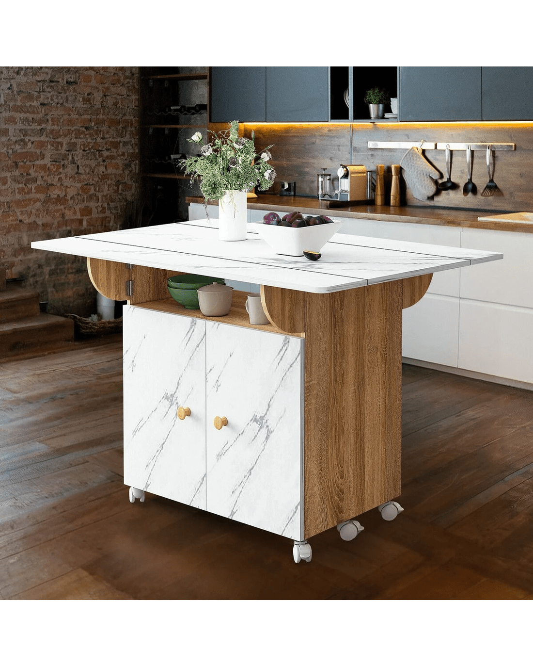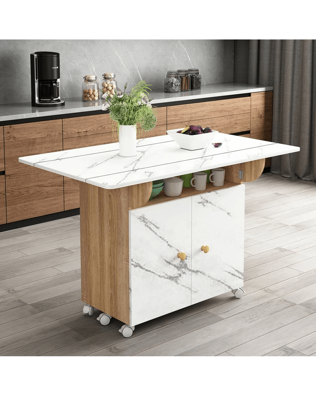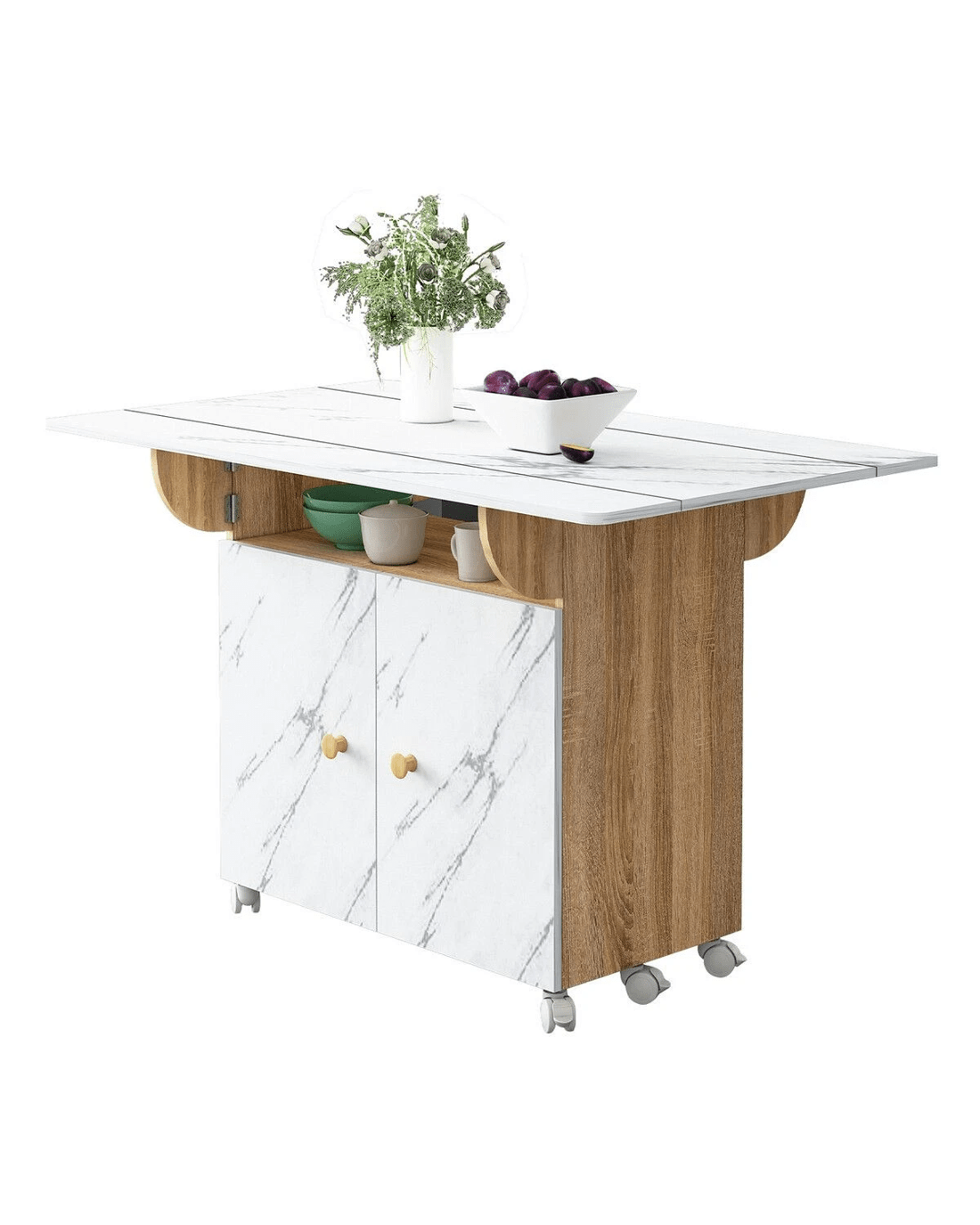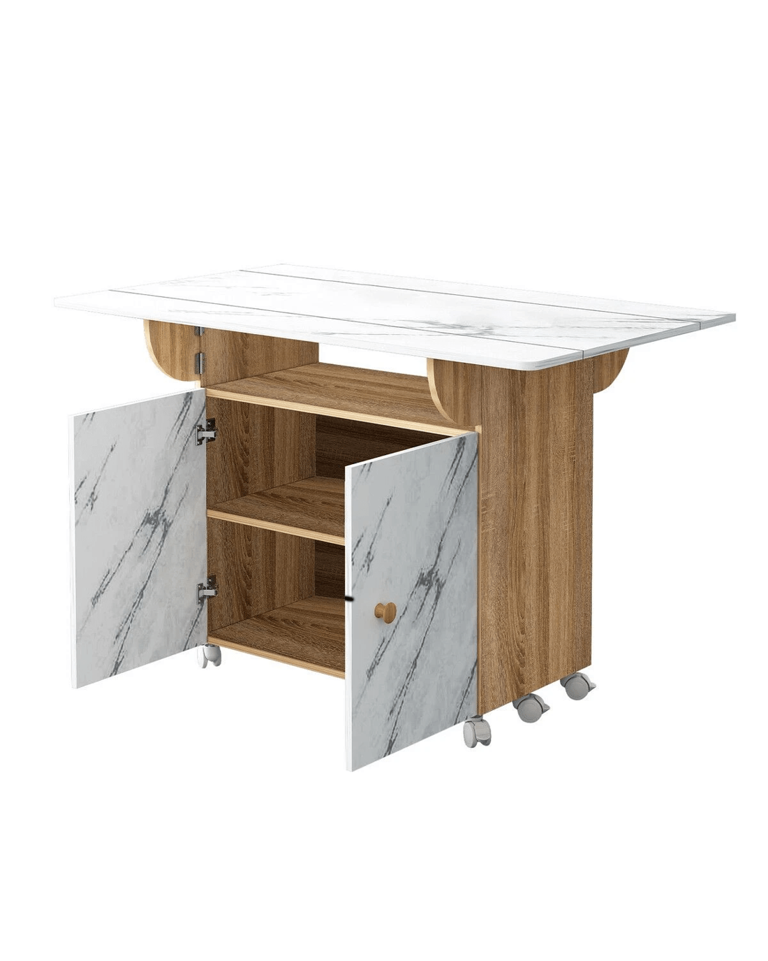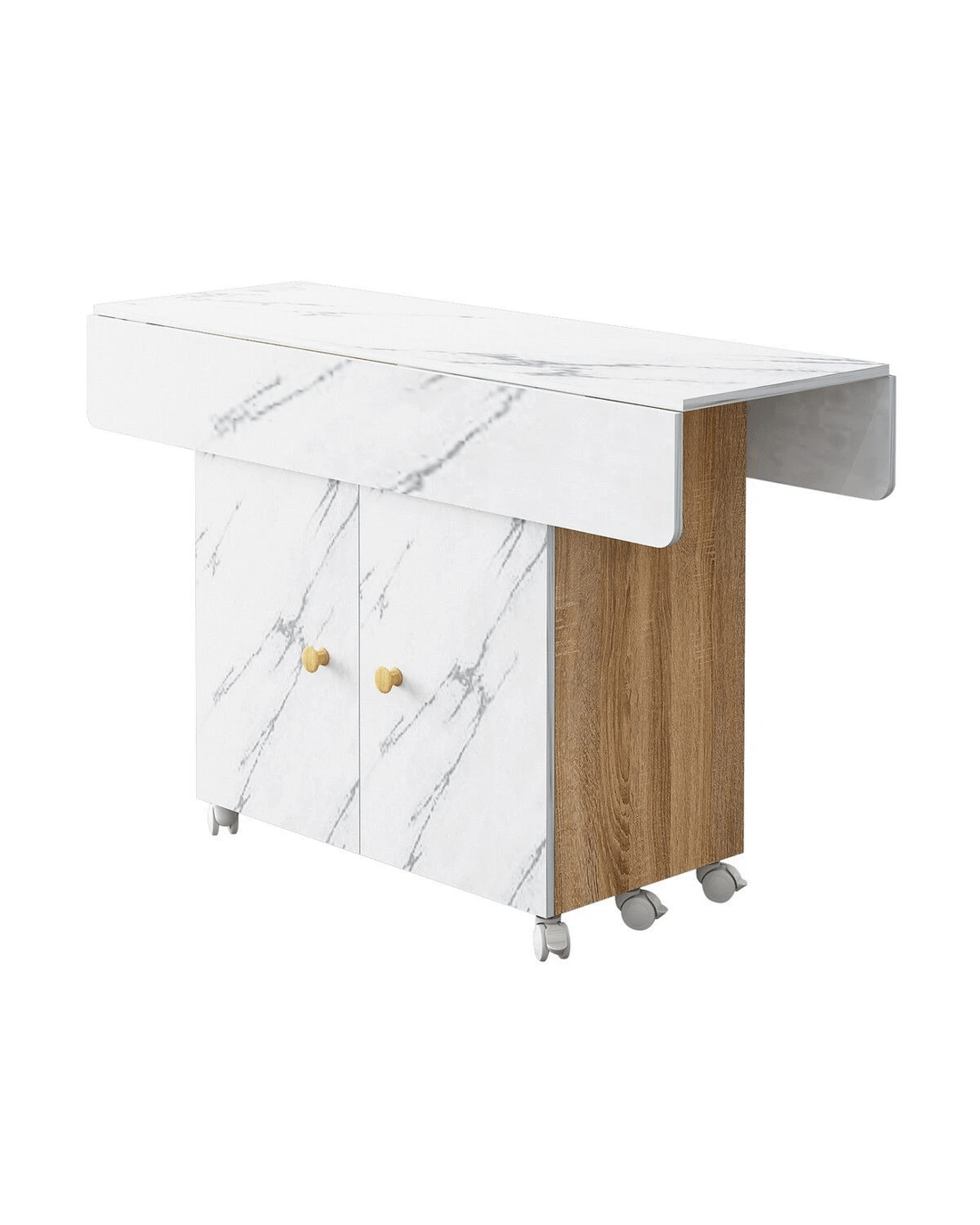 Boost your dining room with this standout dining table. Constructed of eco-friendly particle boards, it offers remarkable sturdiness and long lasting durability and is easy to clean and maintain. Featuring a modern marble finish, this extendable dining table offers three modes: double folding, sided folding, or non-folding. It comfortably seats 2-3 people when folded and 4-6 when fully opened, ideal for romantic meals or family gatherings. What's more, this desk doubles as a kids table for multiple activities. Besides spacious cabinets for efficient storage, this side table also has 360° rotating non-slip bearing wheels for effortless mobility. Its foldable design ensures easy setup and compact storage, making it a perfect fit for kitchens, restaurants and bars. Overall, this marble dining table offers unmatched convenience and flexibility, making it a practical piece for indoor and outdoor use.