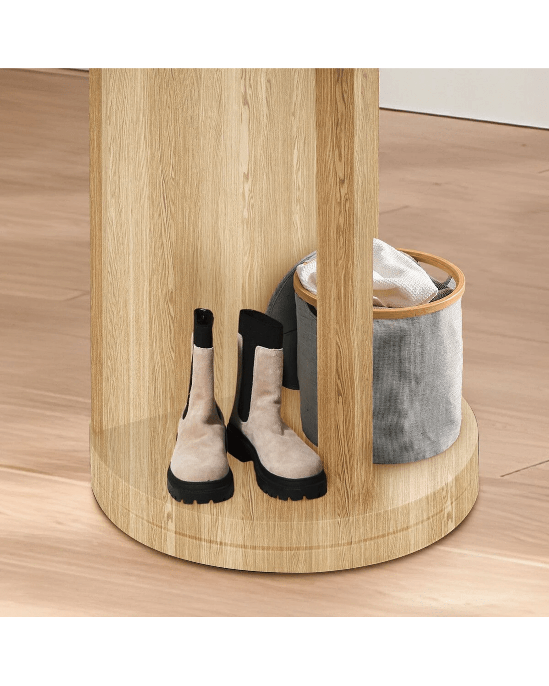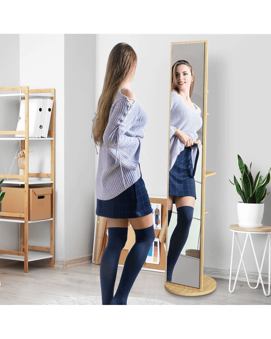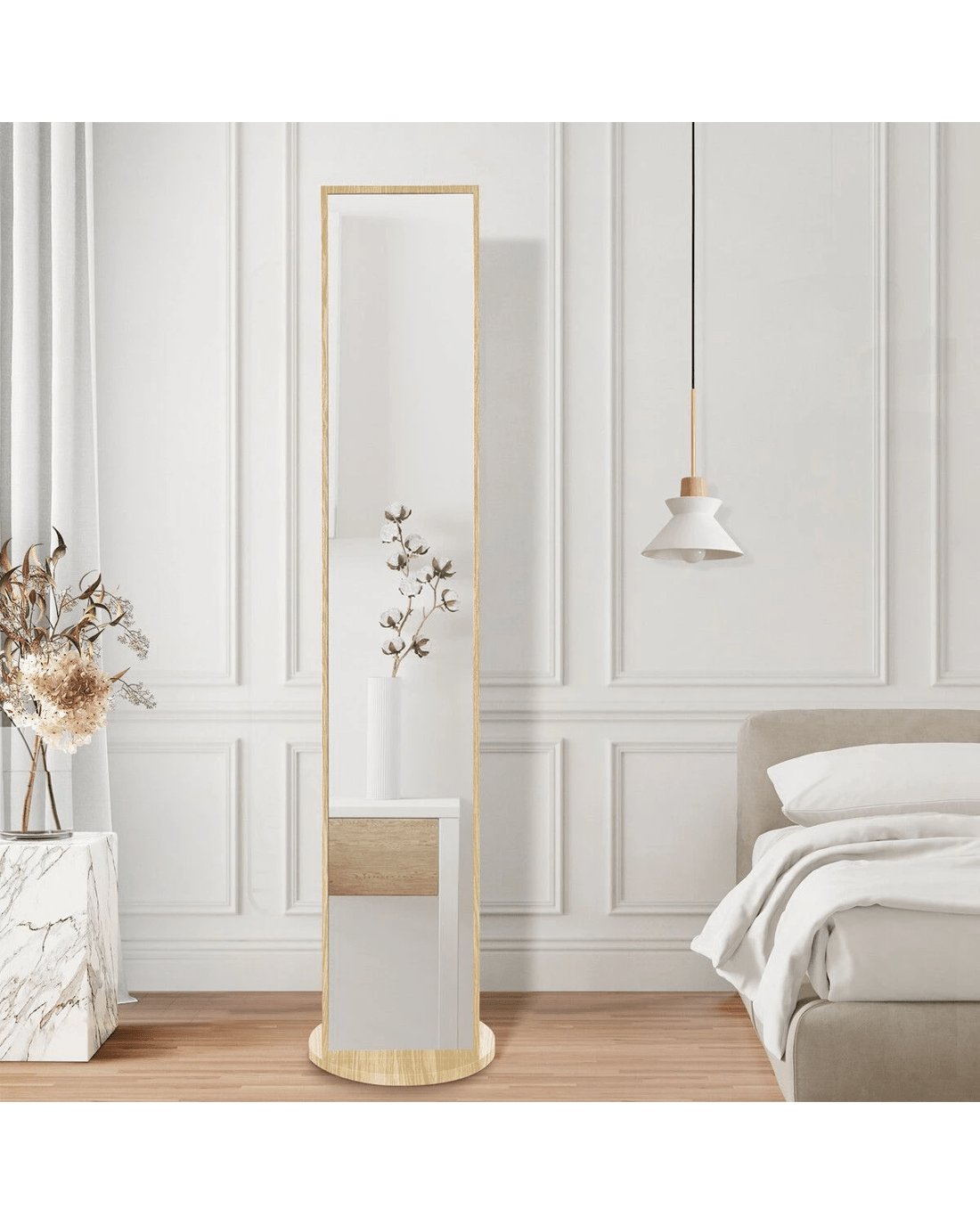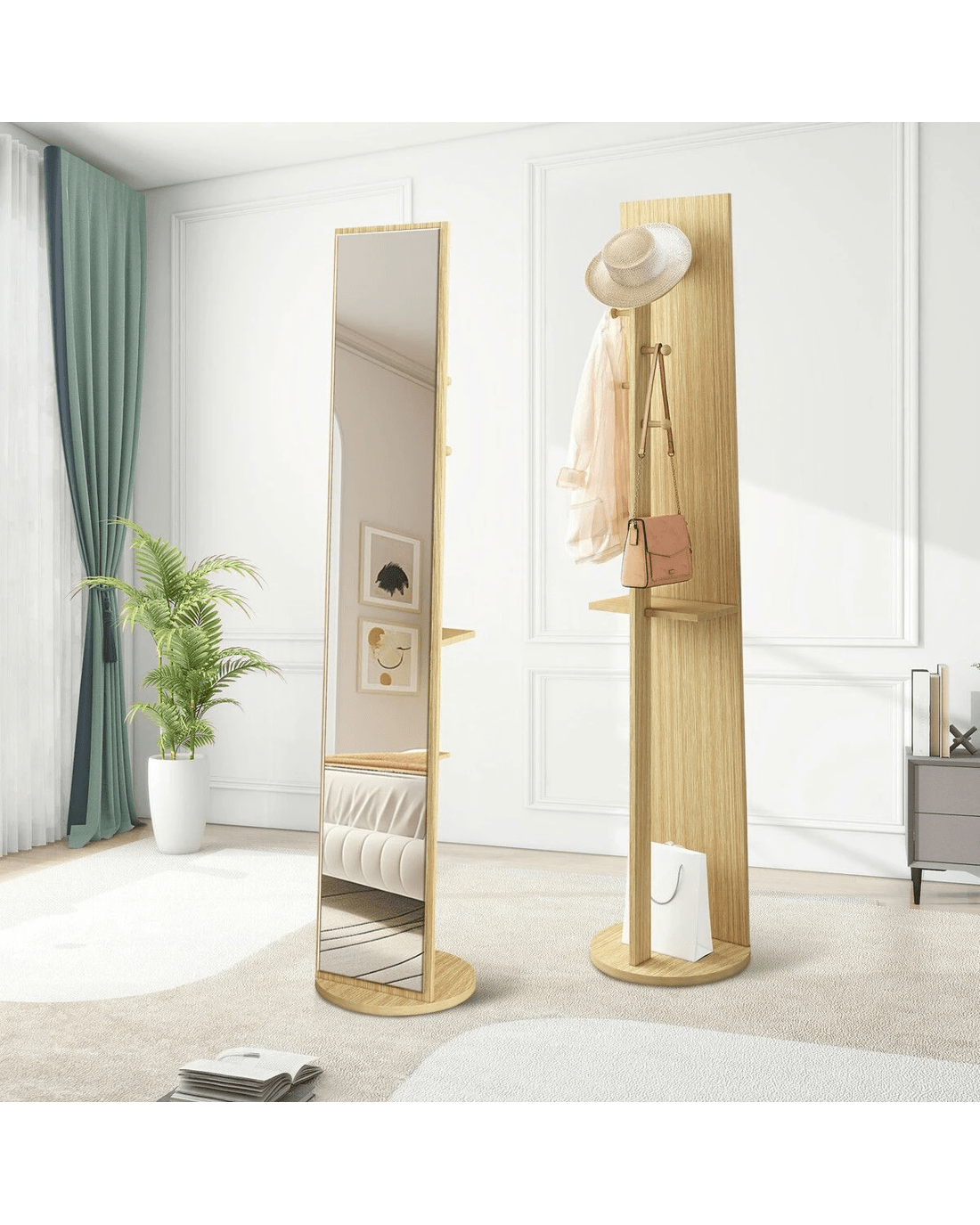 Amplify your dressing area with this large full-length mirror. Crafted using heavy-duty PB board and HD shatterproof glass, our floor mirror boasts unparalleled safety and durability and provides a flawless viewing experience for years to come. Also, it is user-friendly with easy cleaning and maintenance. Maximise space and optimise organisation with its rear storage hooks and shelves for your clothes, bags, shoes, and other accessories. Meanwhile, thanks to its large rotating base with double-layer thickness, the full-body mirror delivers unwavering support and ultimate convenience, allowing you to swivel the mirror and access your belongings easily. Versatile and practical, this remarkable piece enhances your daily routine and adds a touch of sophisticated elegance to your living environment.